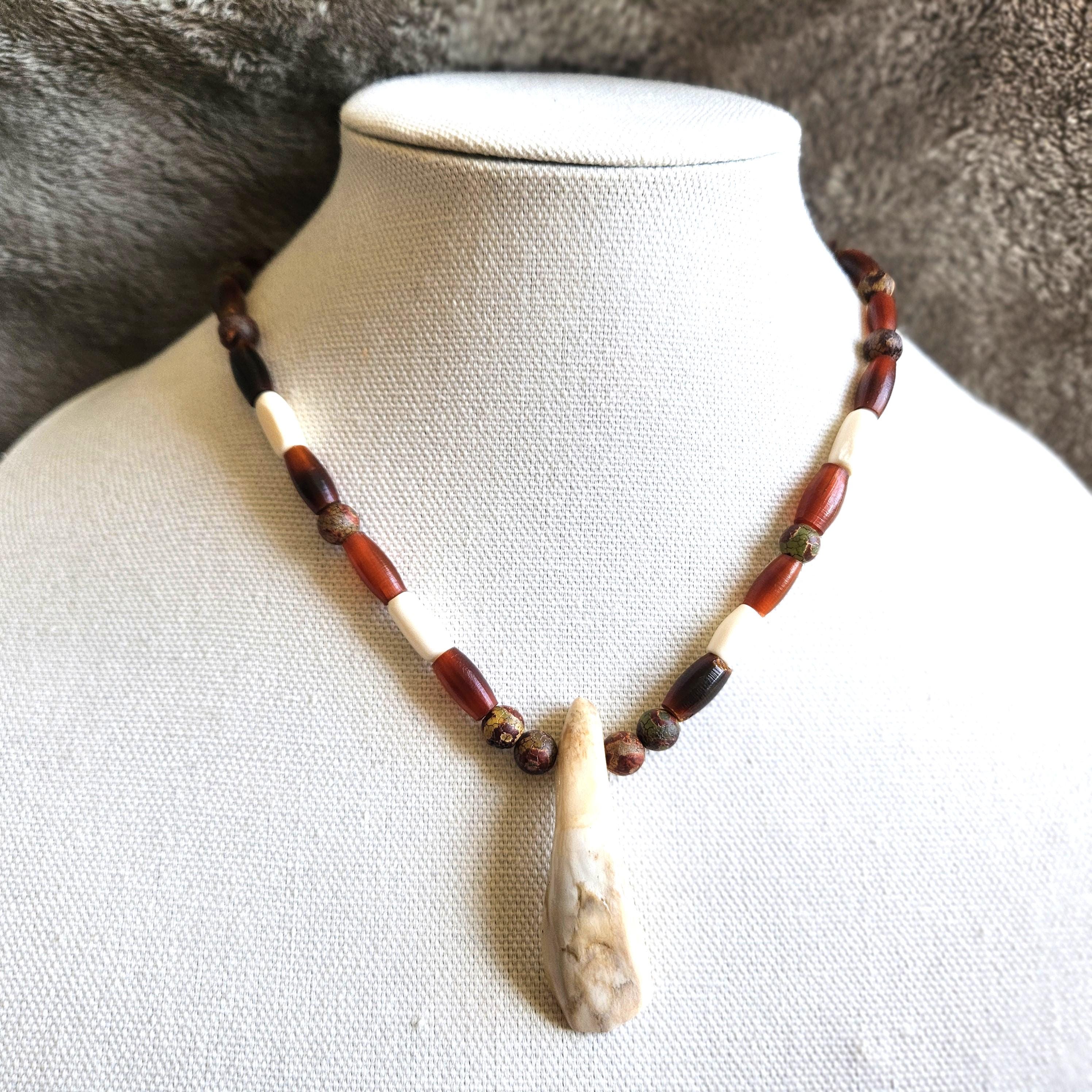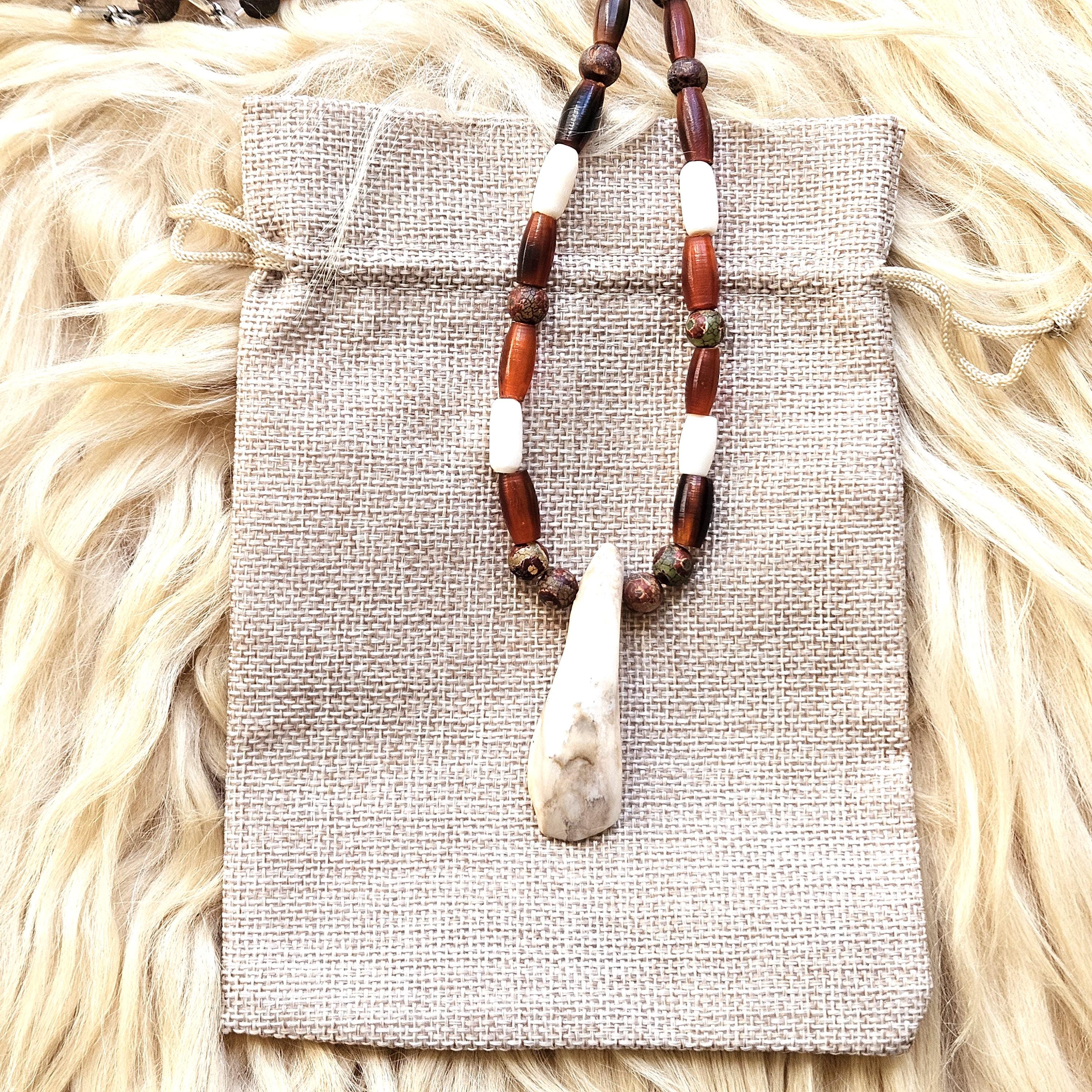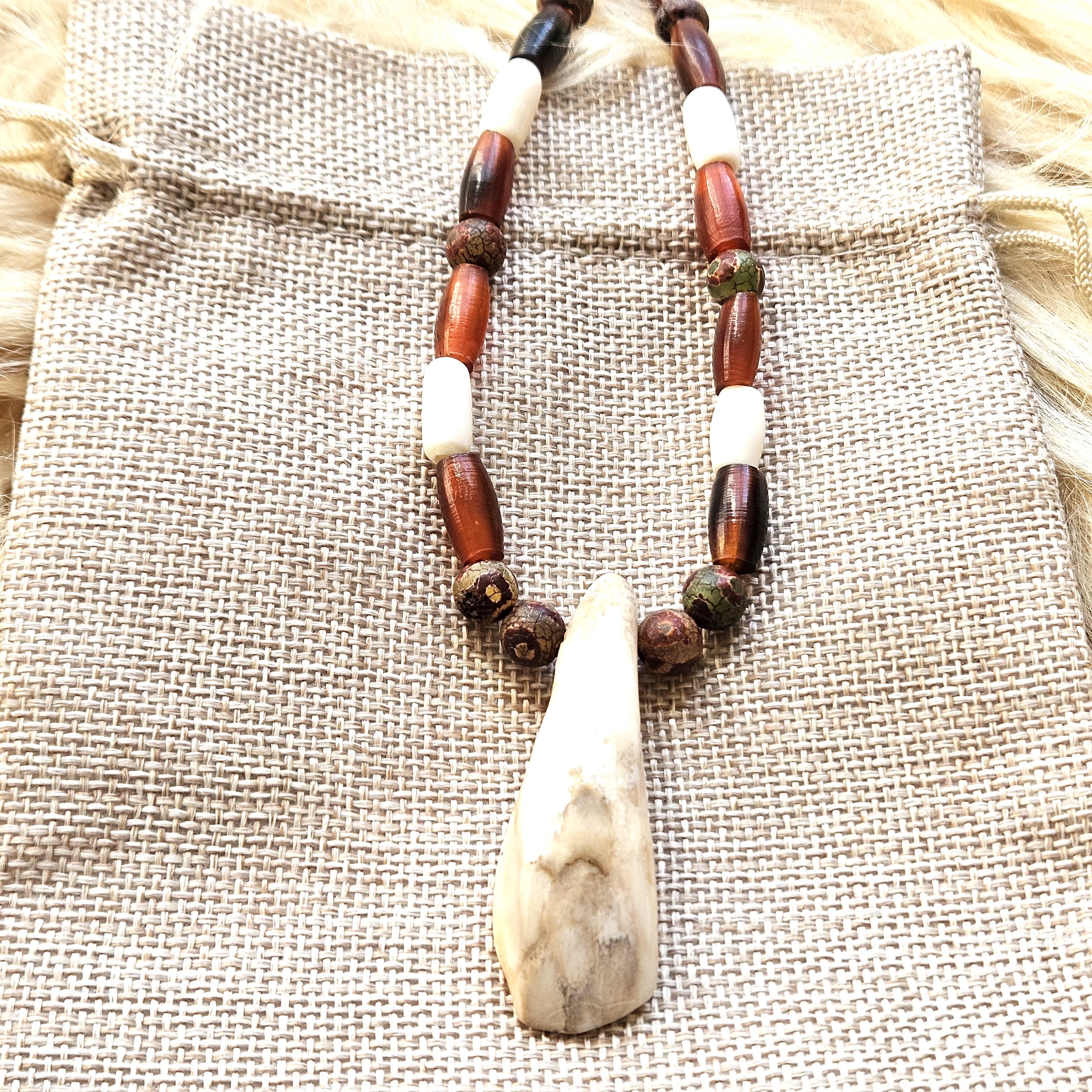 Discover this unique Ojibwe bison tooth beaded necklace, a stunning piece inspired by rich Indigenous heritage. Handcrafted with care, this necklace features a genuine bison tooth elegantly adorned with carefully selected horn, bone and stone beads.