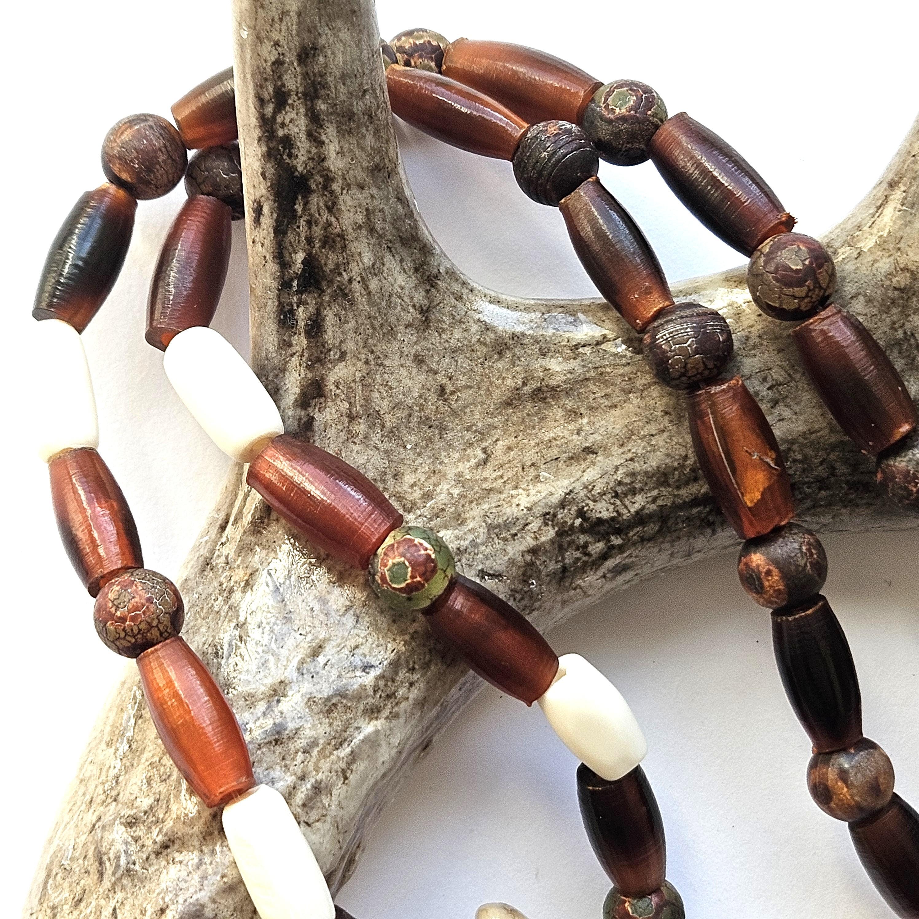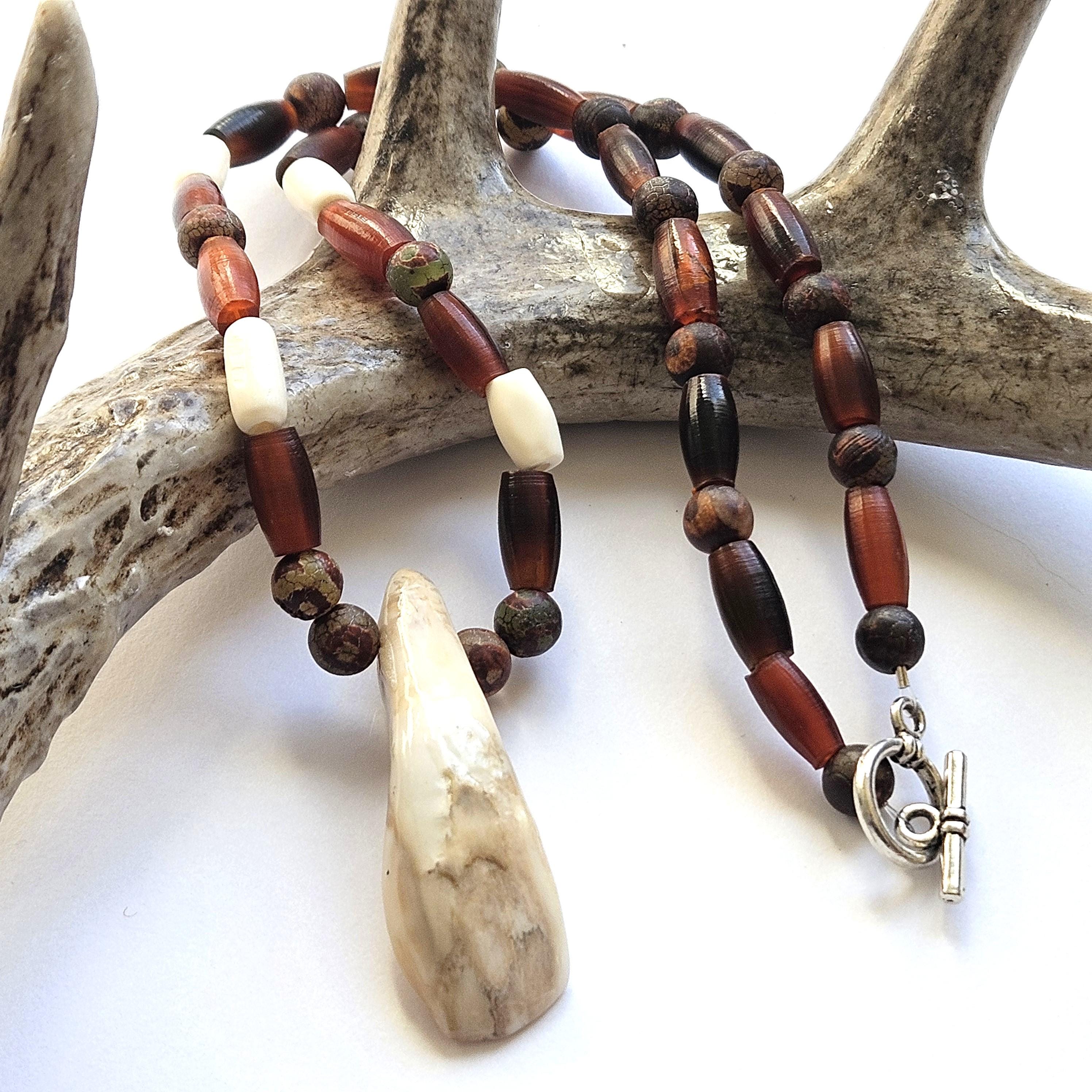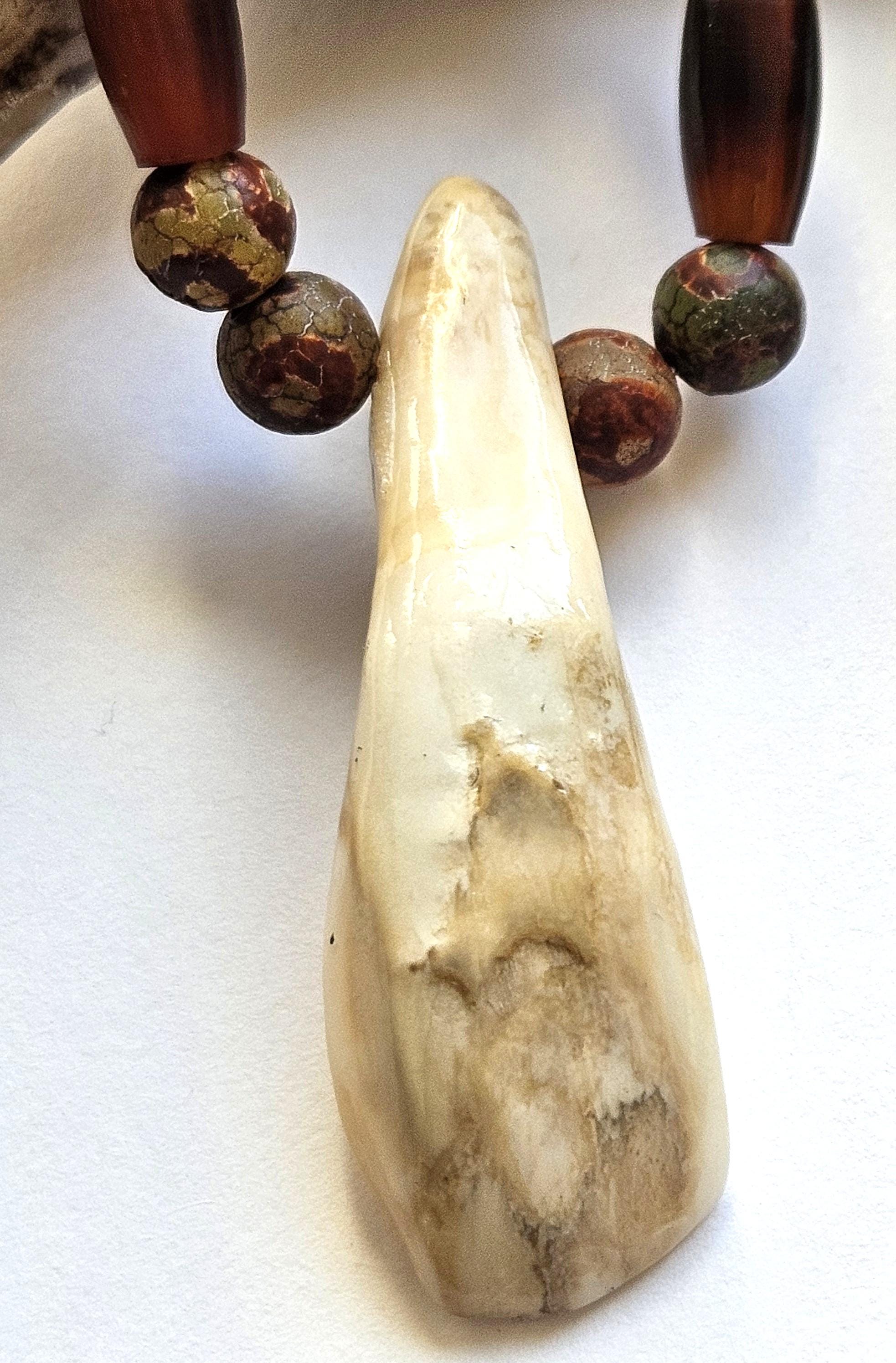 Discover this unique Ojibwe bison tooth beaded necklace, a stunning piece inspired by rich Indigenous heritage. Handcrafted with care, this necklace features a genuine bison tooth elegantly adorned with carefully selected horn, bone and stone beads.