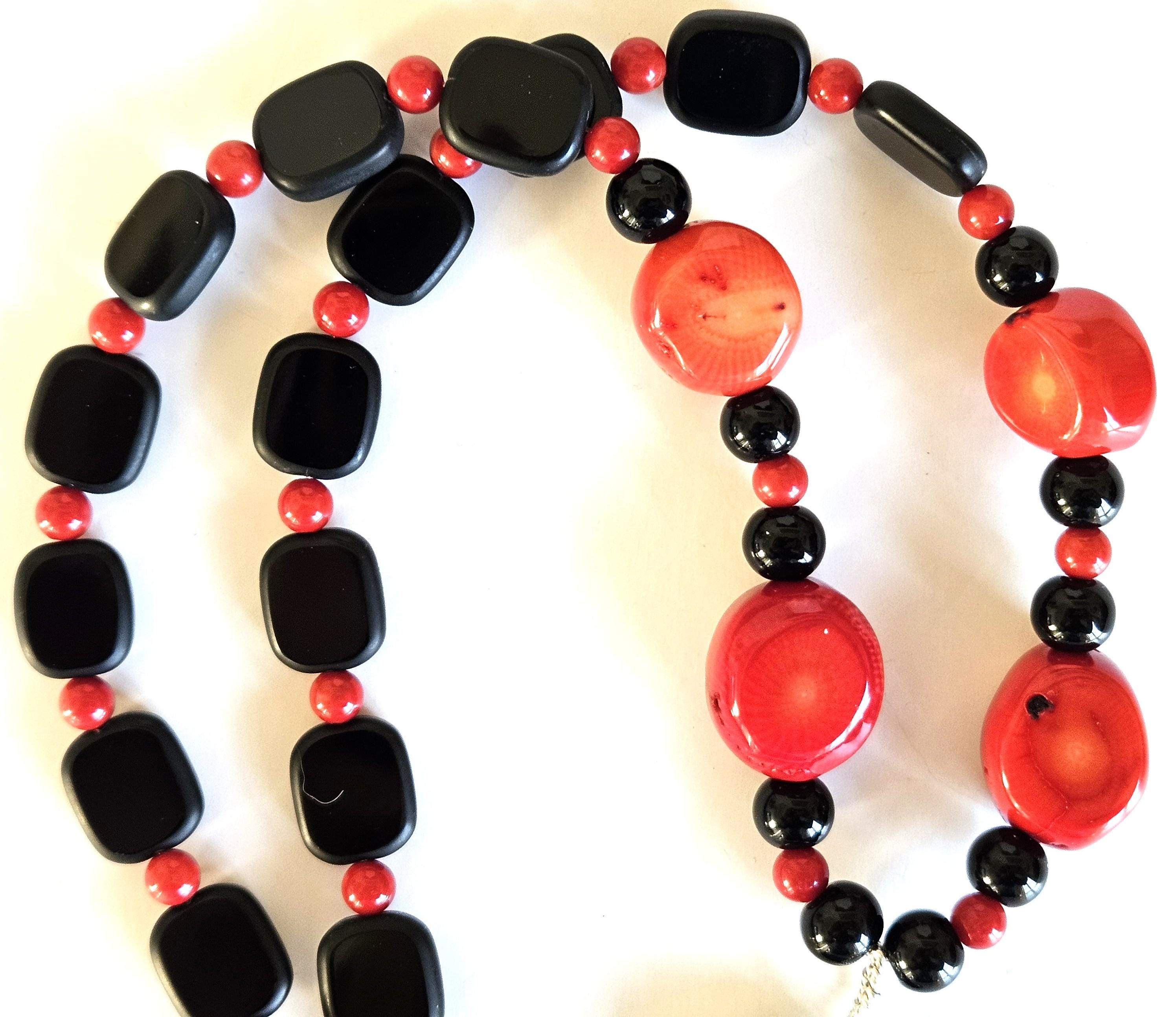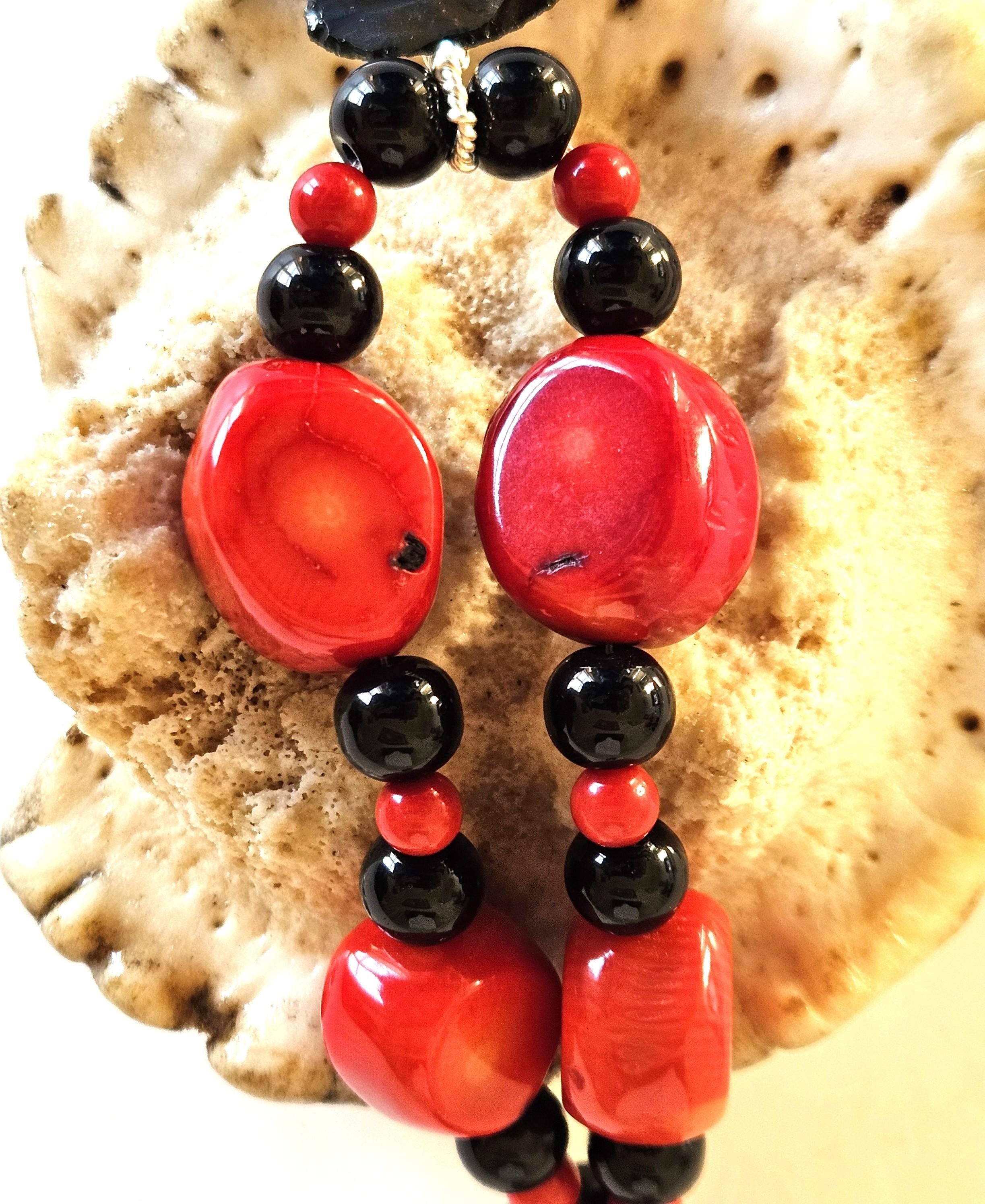 Beads: red fossil coral, black glass