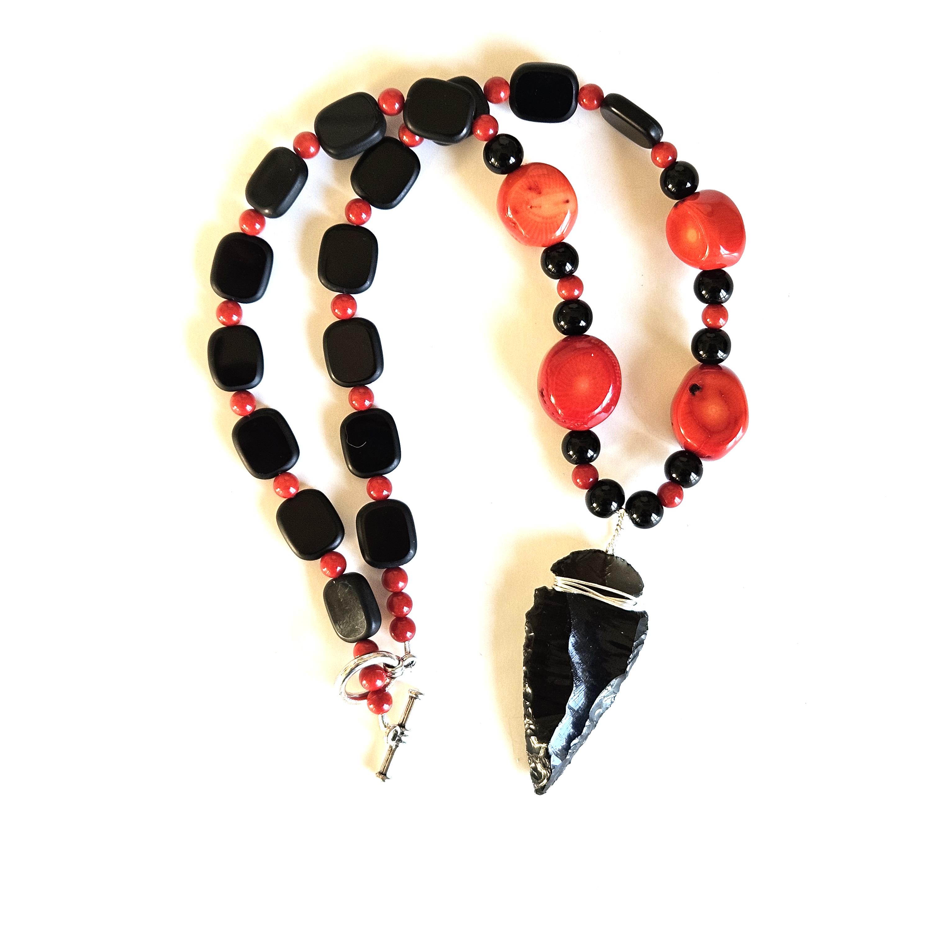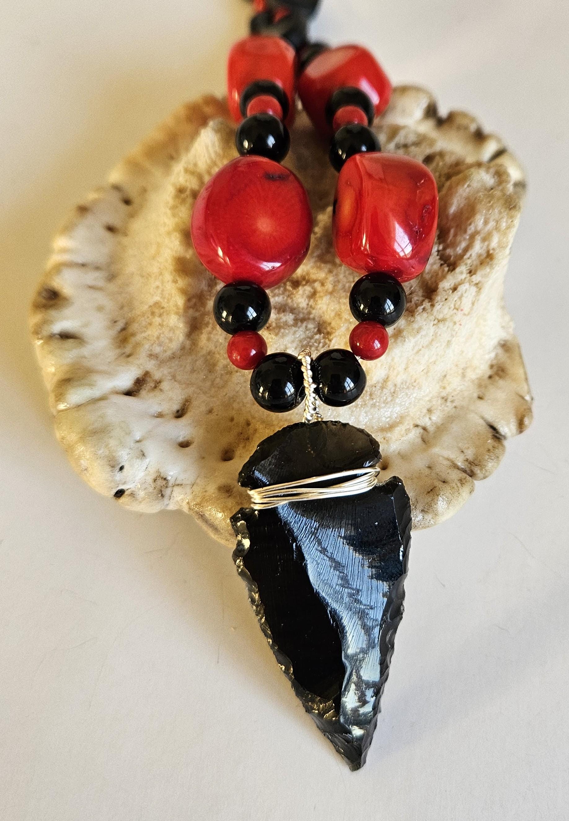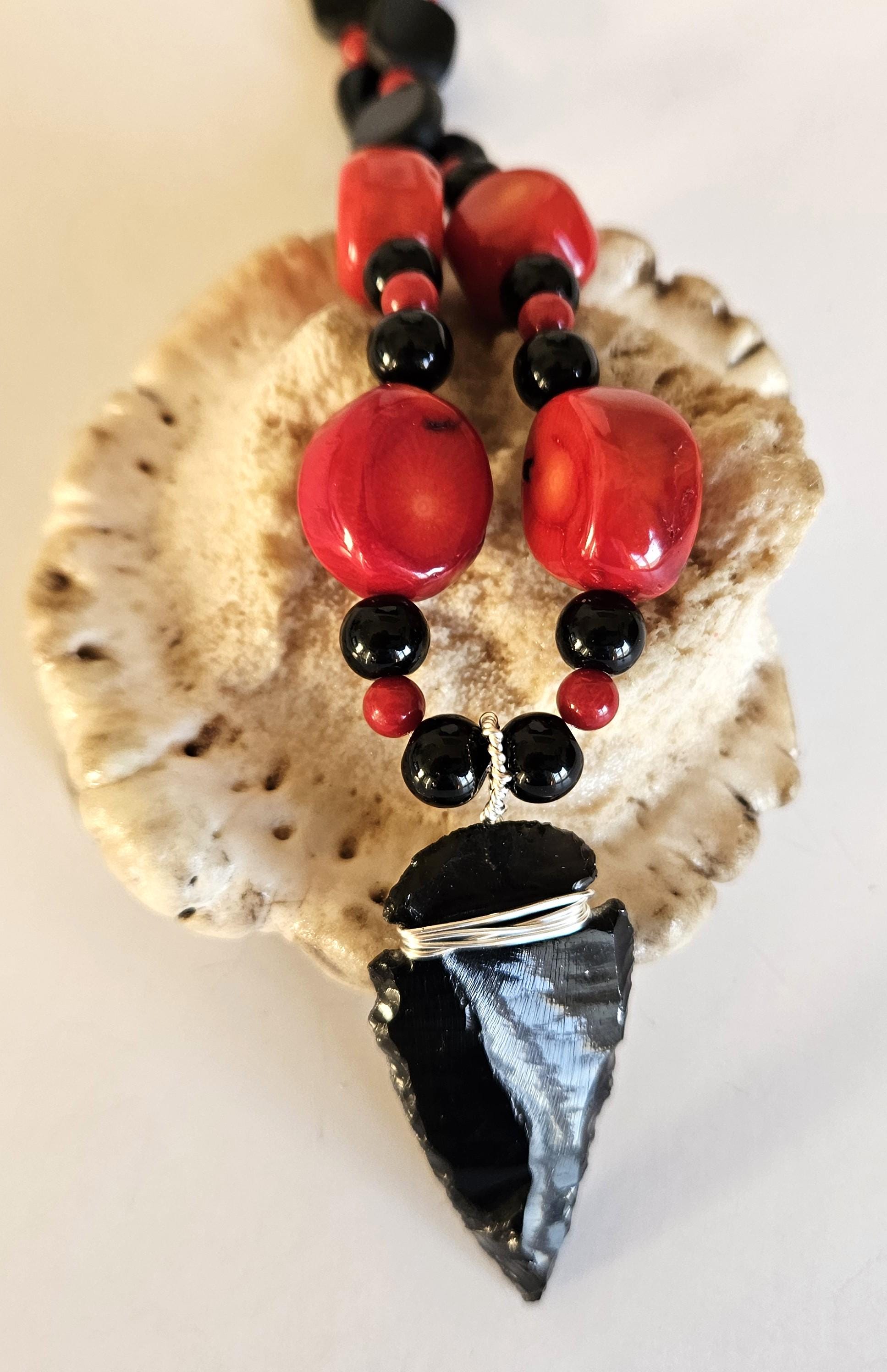 This truly unique necklace is highlighted with an obsidian arrowhead and strung with red fossil coral and black glass beads. This is a great find for you or the unique one in your life.