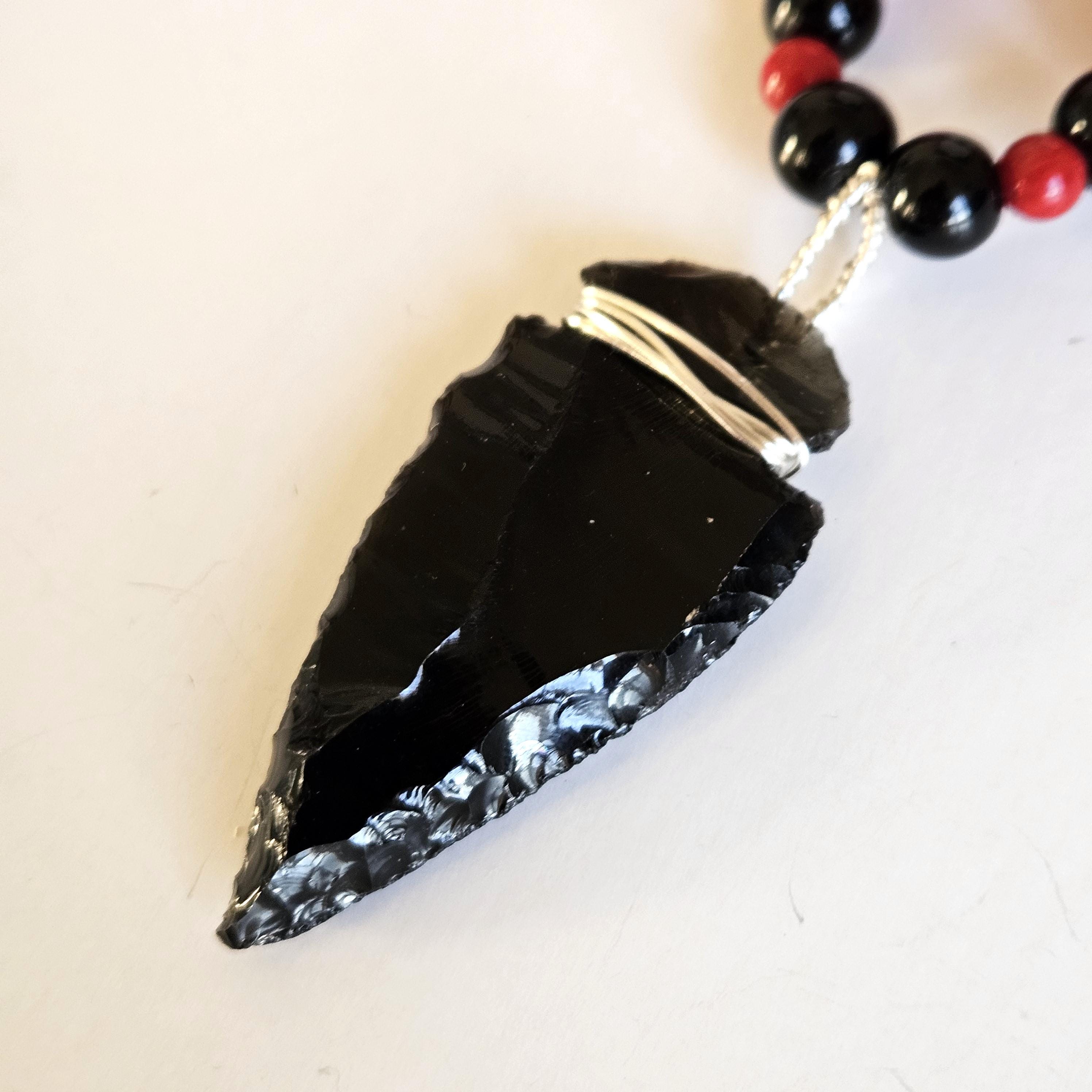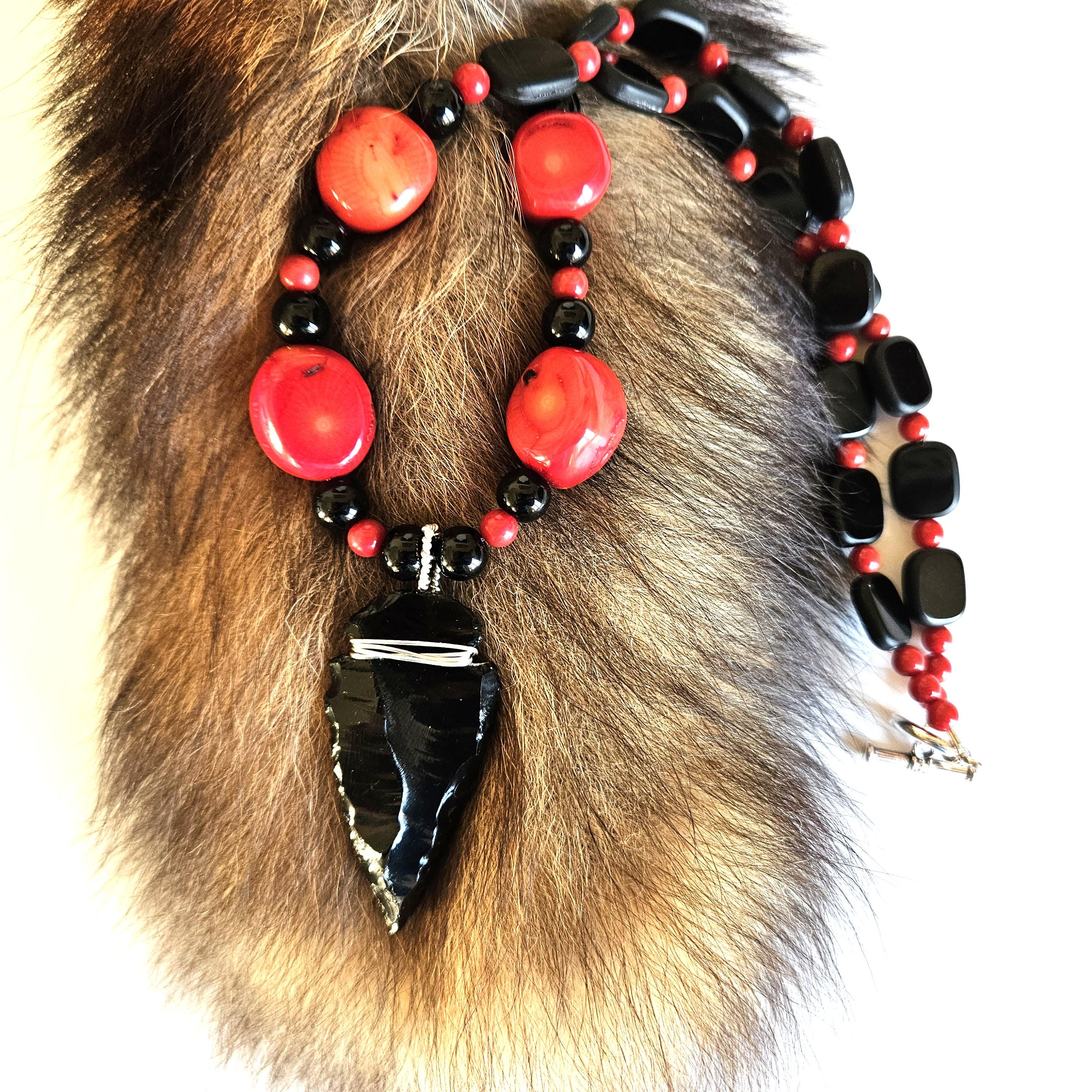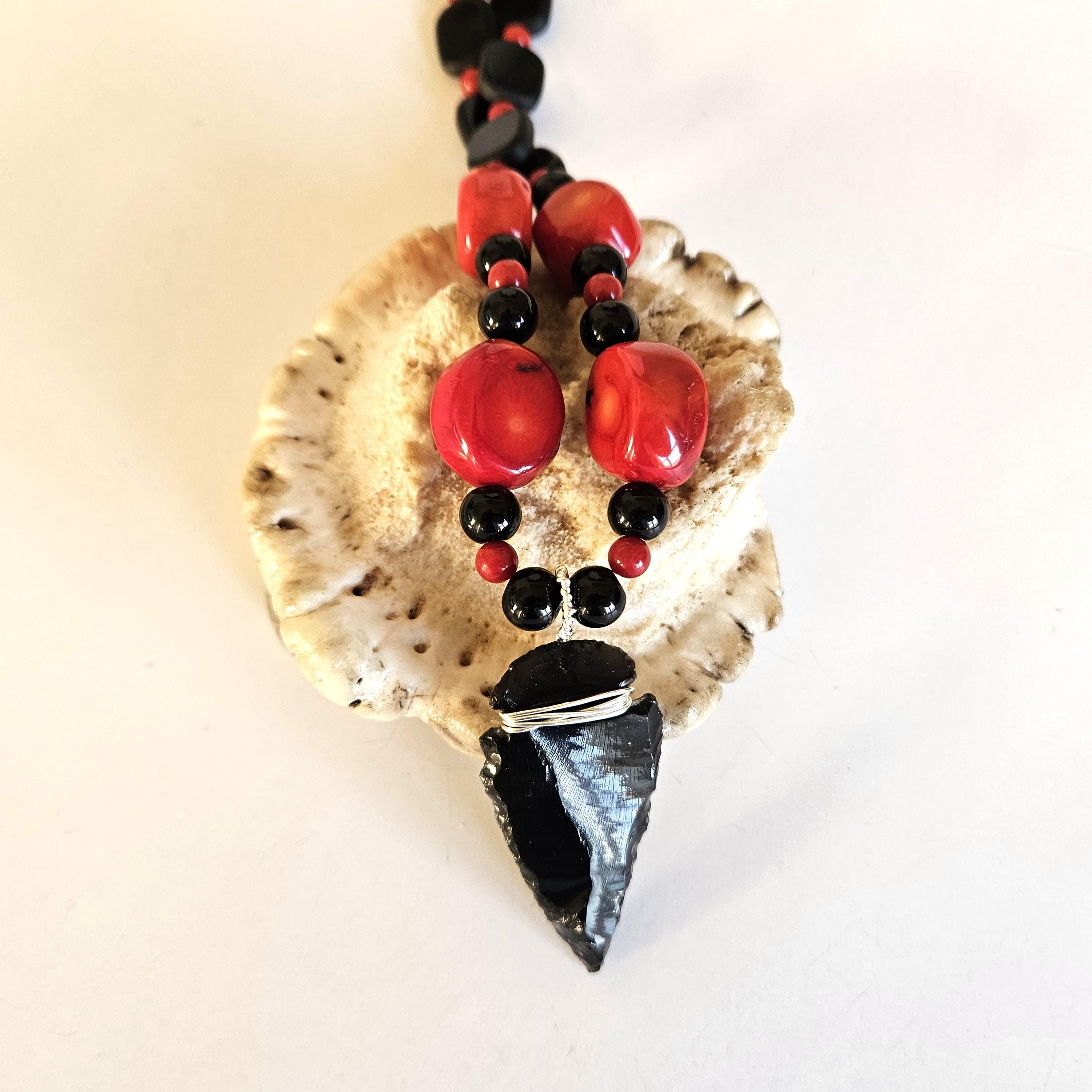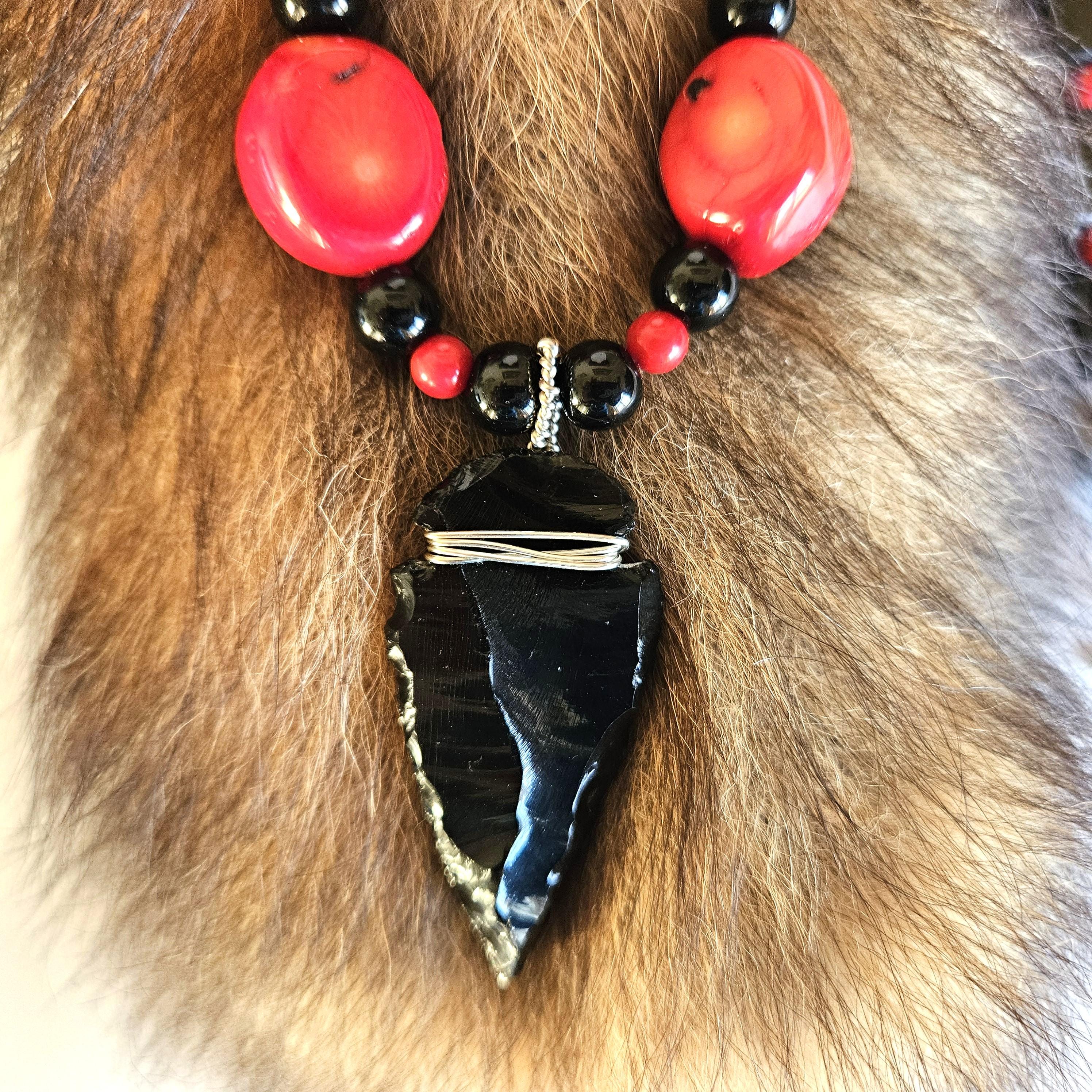 This truly unique necklace is highlighted with an obsidian arrowhead and strung with red fossil coral and black glass beads. This is a great find for you or the unique one in your life.
