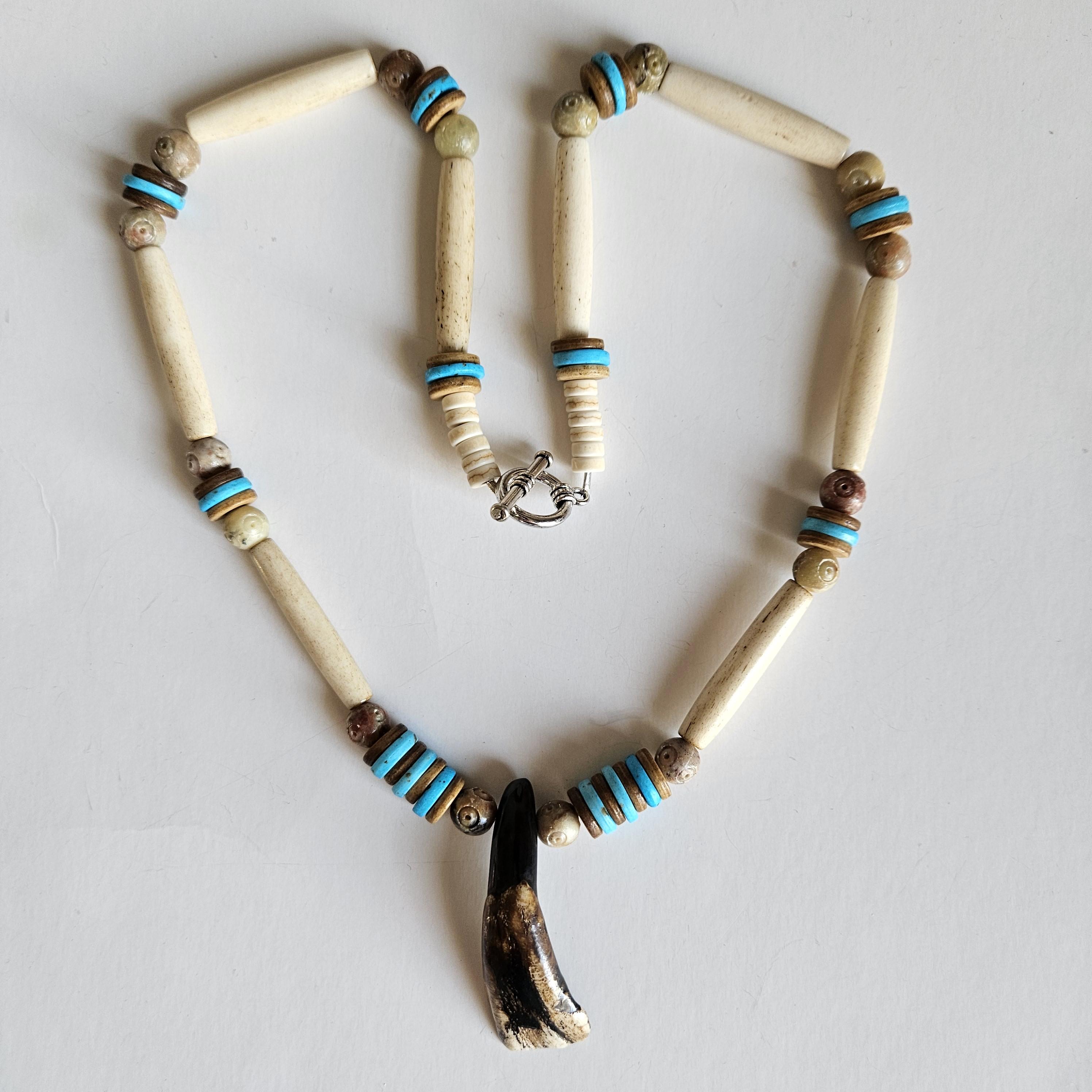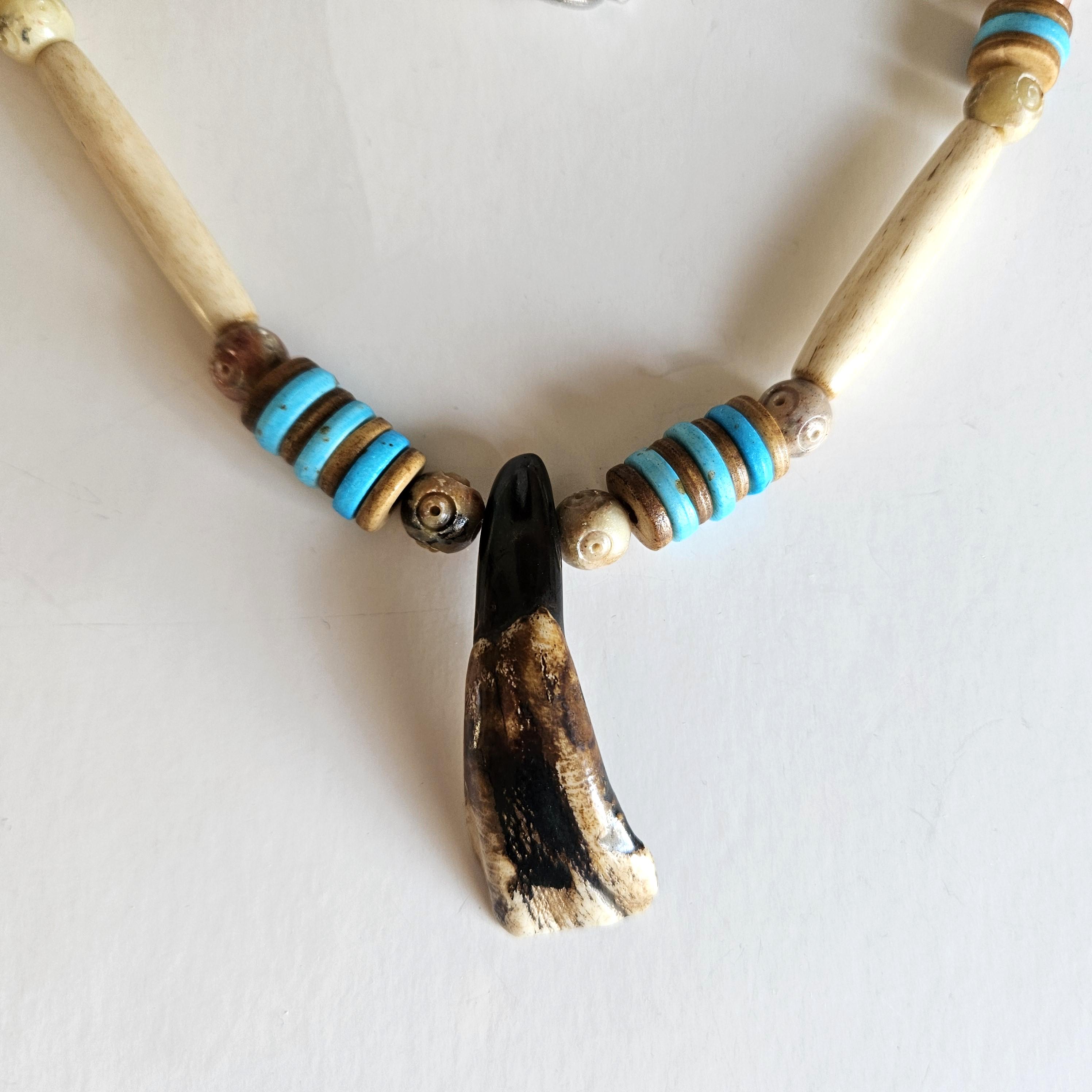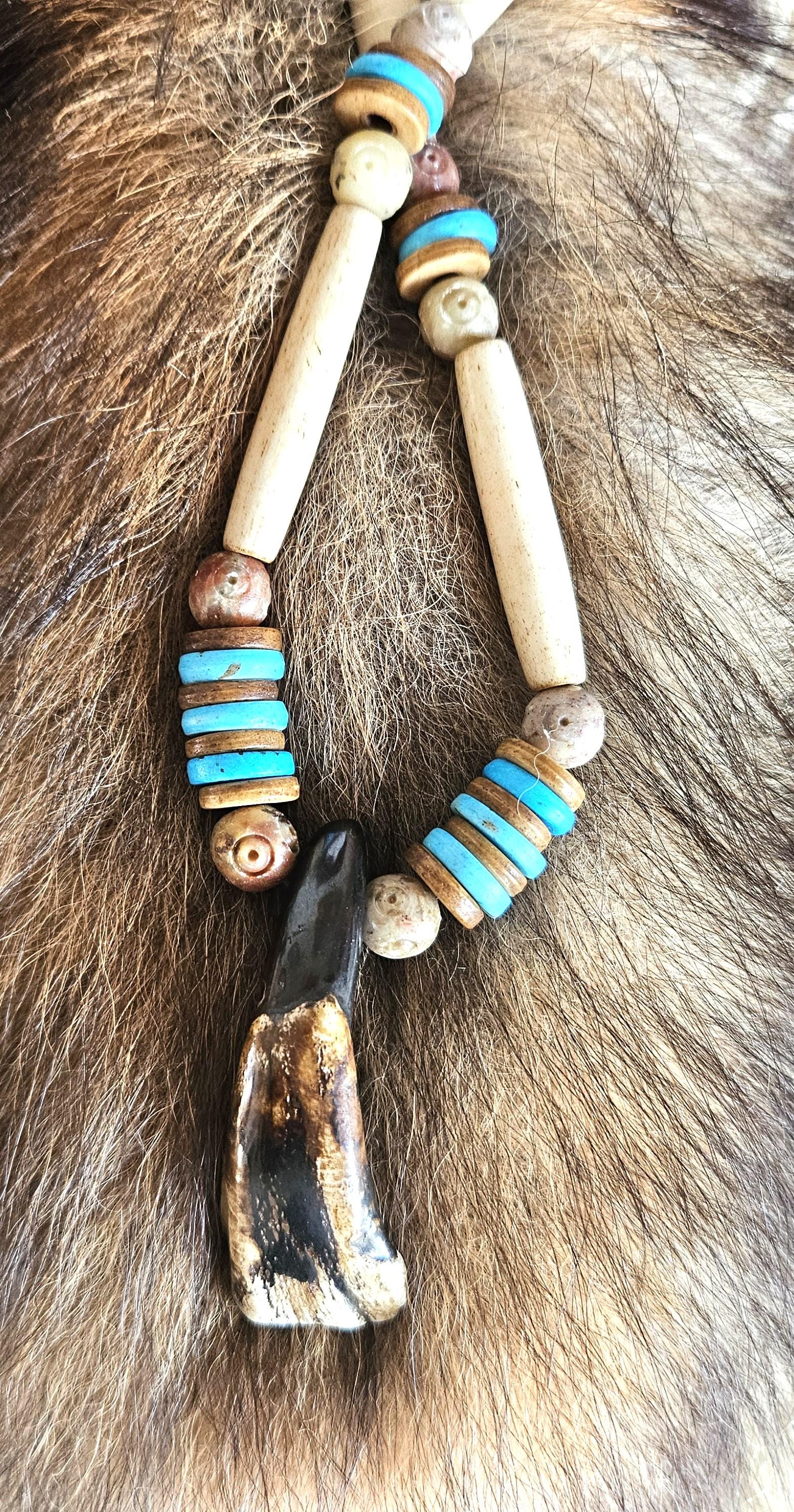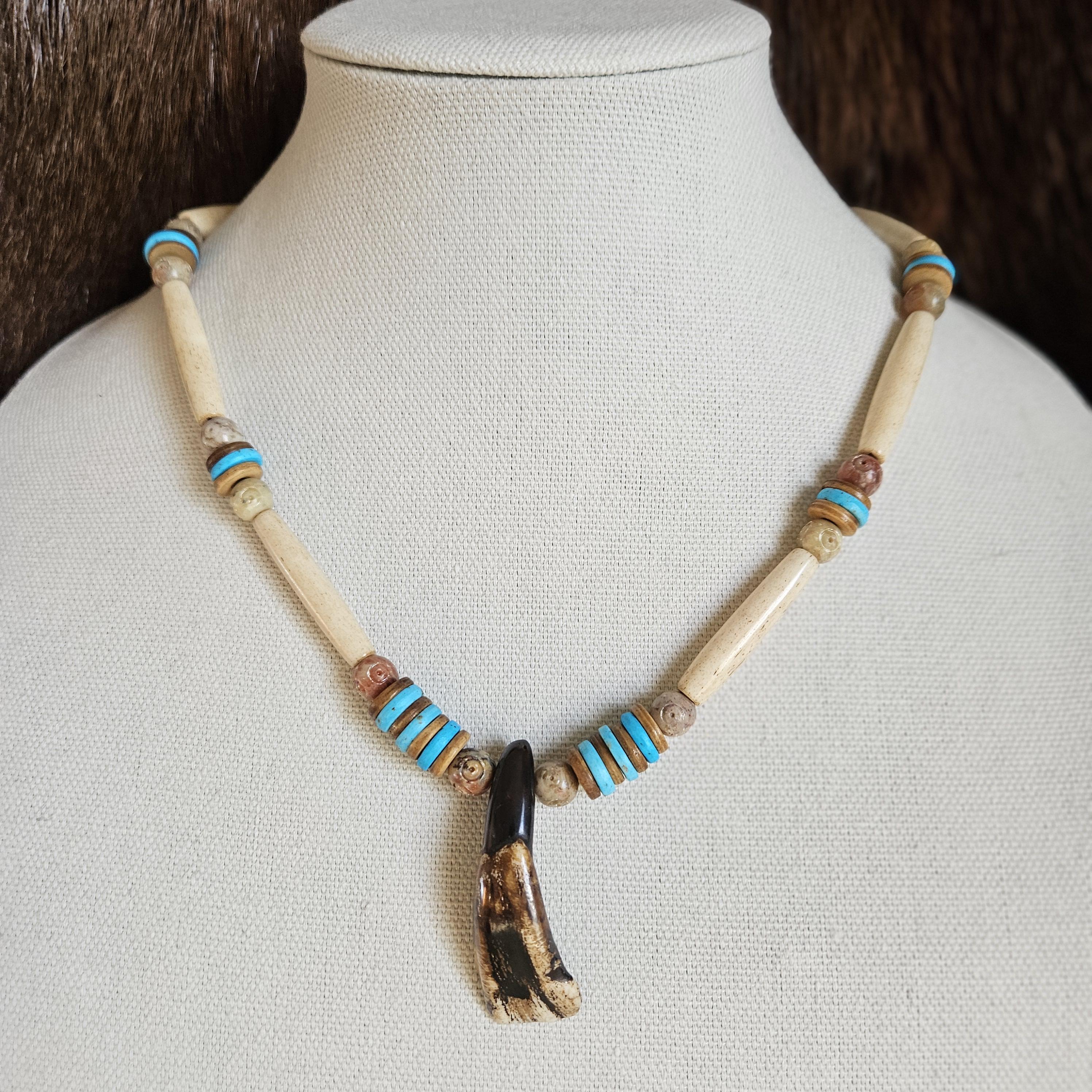 This truly unique Ojibwe made necklace is accented with a buffalo tooth and strung with green malachite and horn beads