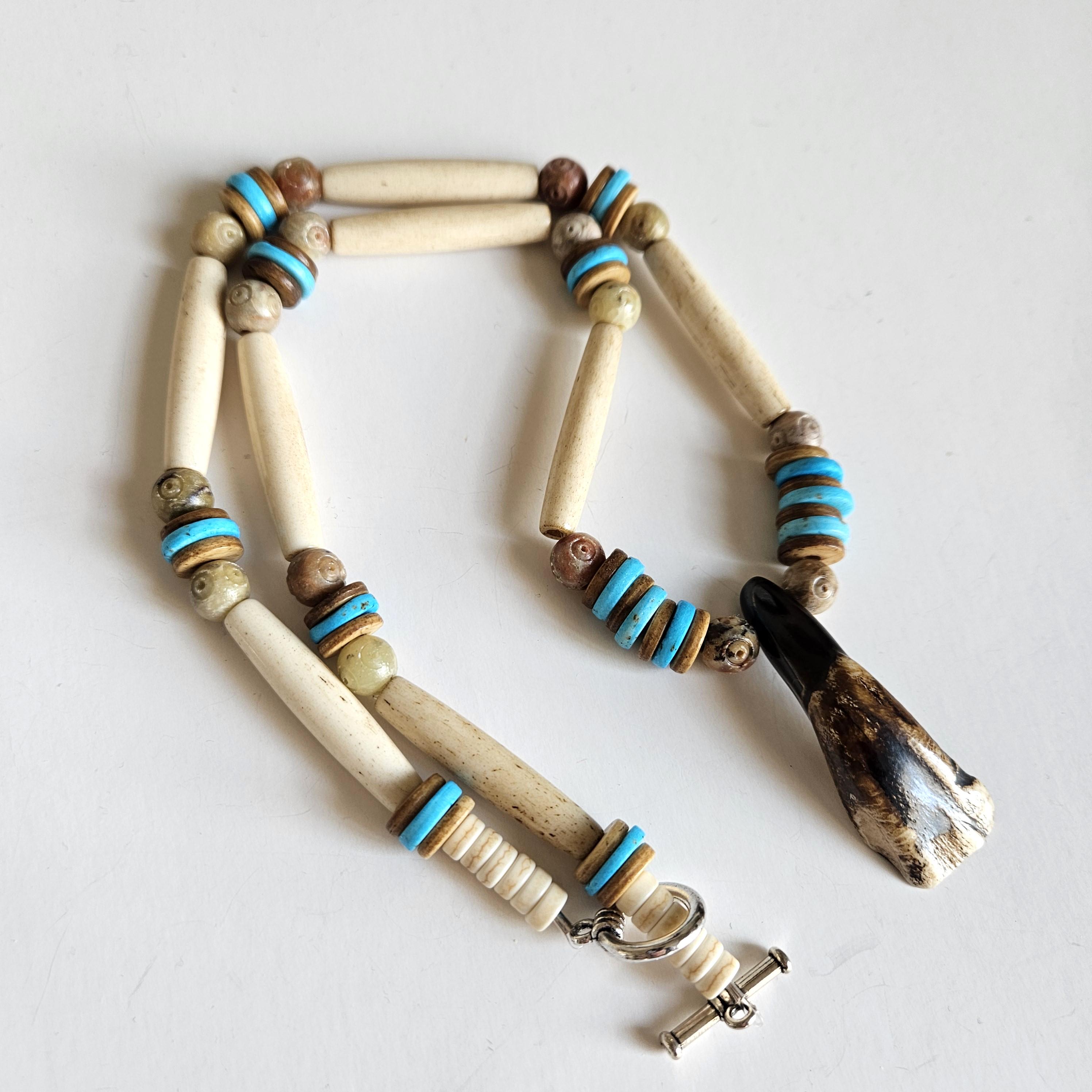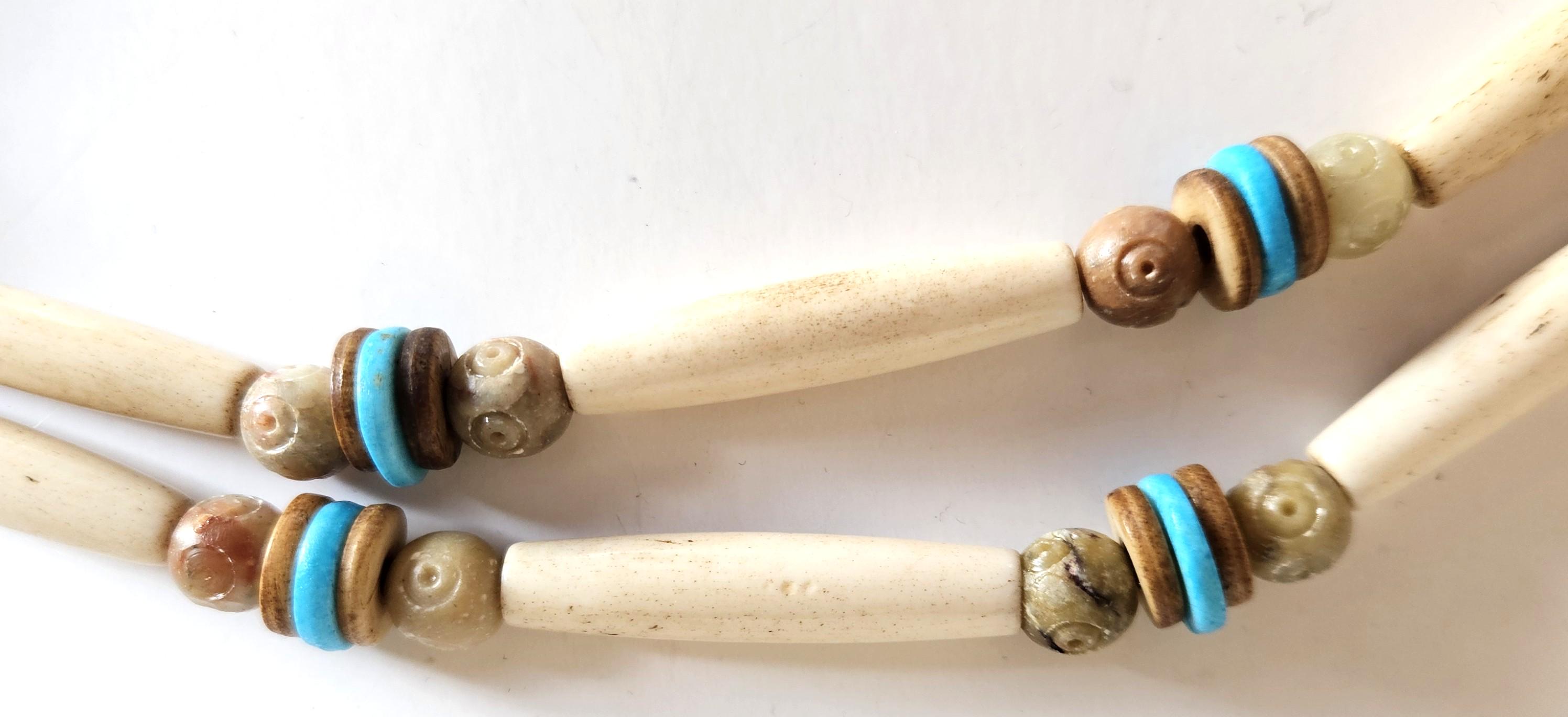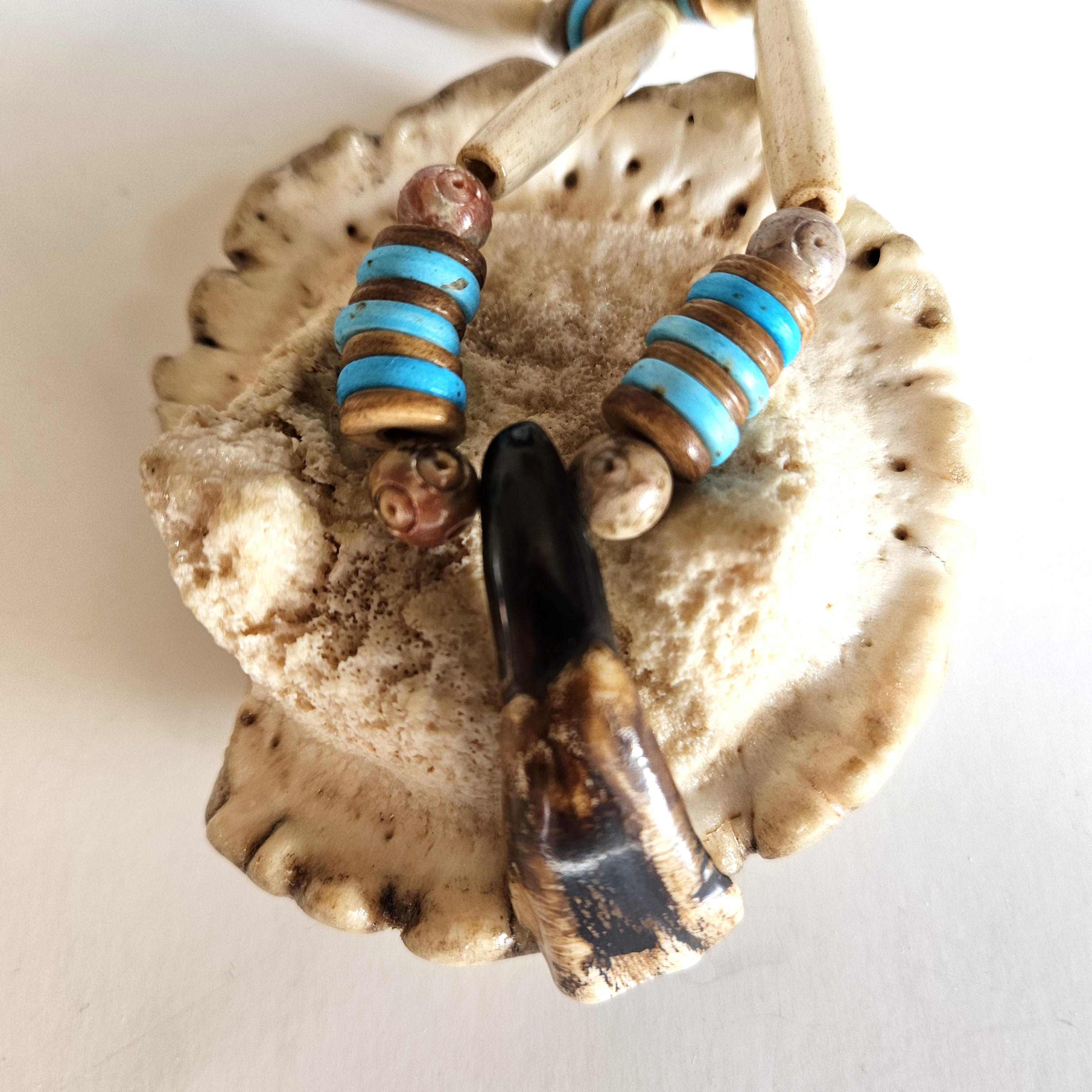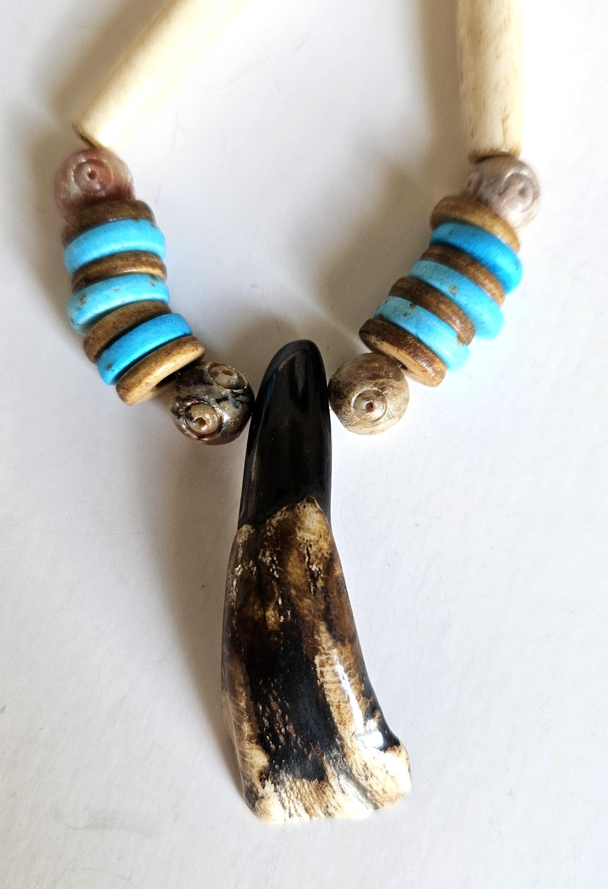 This truly unique Ojibwe made necklace is accented with a buffalo tooth and strung with green malachite and horn beads