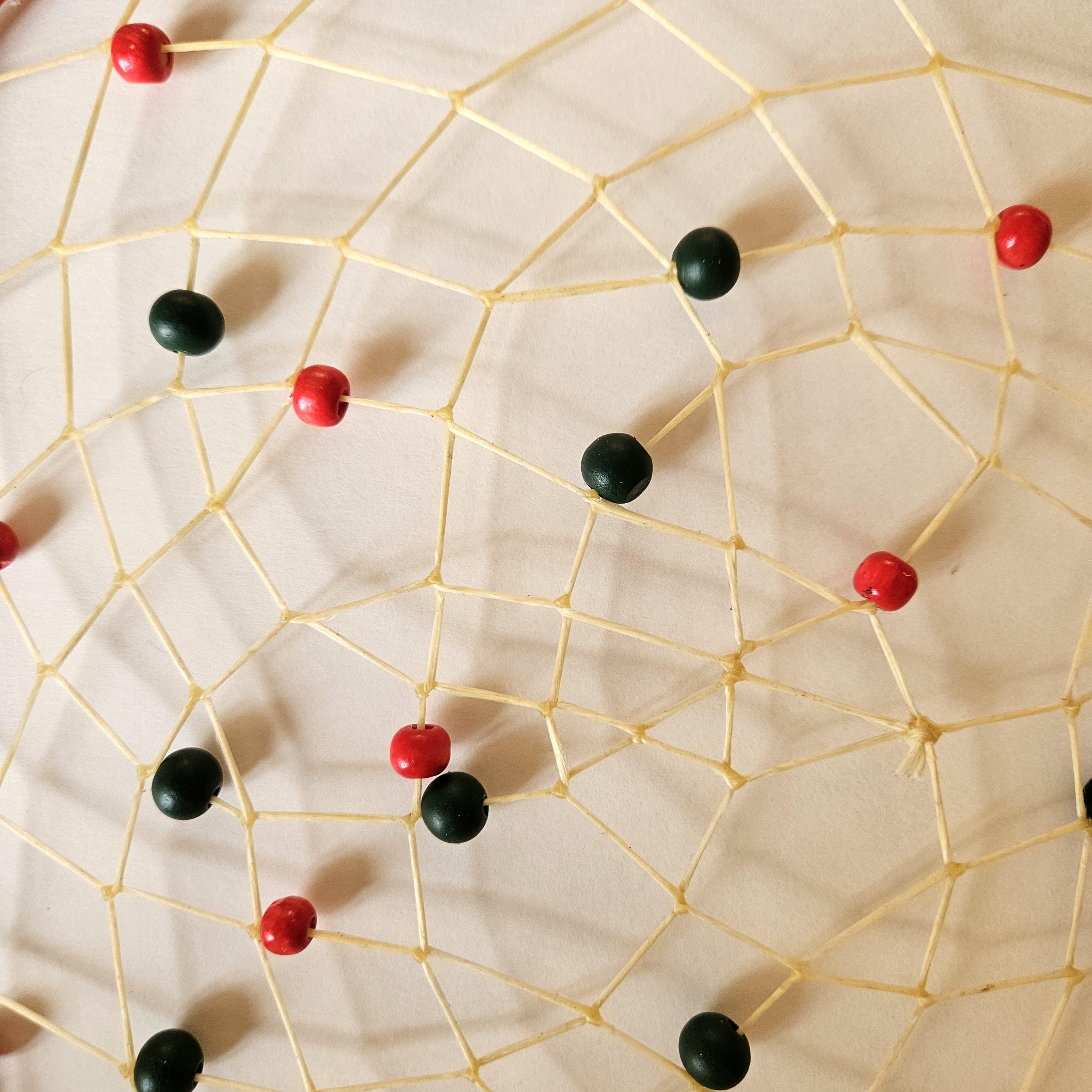 Storytellers speak of the Spider Woman, known as Asibikaashi, who took care of the children of the people. When the Ojibwe people dispersed to the four corners of North America, Spider Woman had a difficult time making journeys to all the sleeping children, so the mothers, sisters, and grandmothers weaved magical webs for the new babies using willow hoops and sinew. It is in shape of a circle to represent how giizis (the sun) travels each day across the sky. The dreamcatcher will filter out all the giiwanaadingwaam (bad dreams) and allow only good dreams to enter into our minds. There is a small hole in the center where those good dreams may come through. With the first rays of sunlight, the bad dreams will perish.