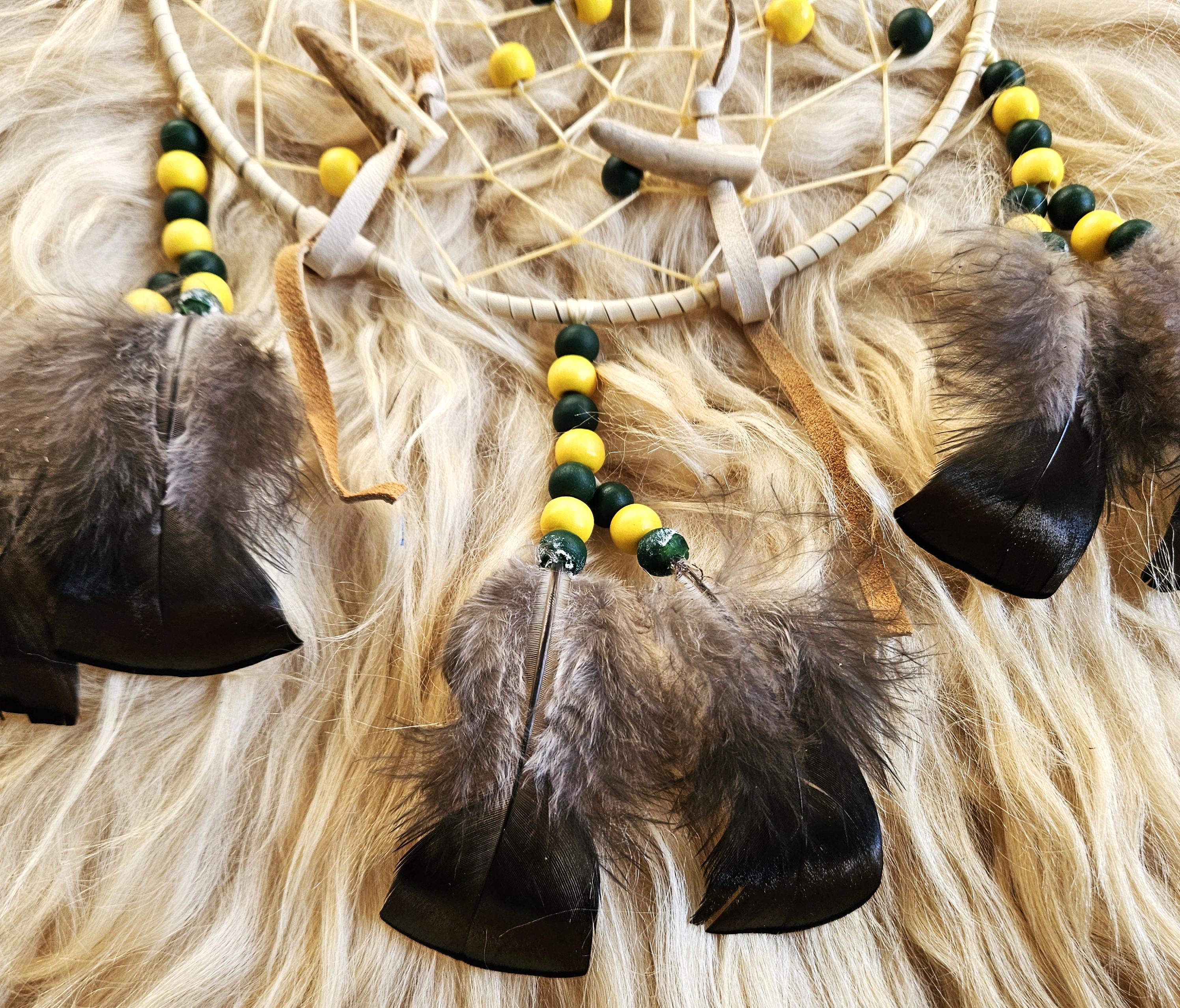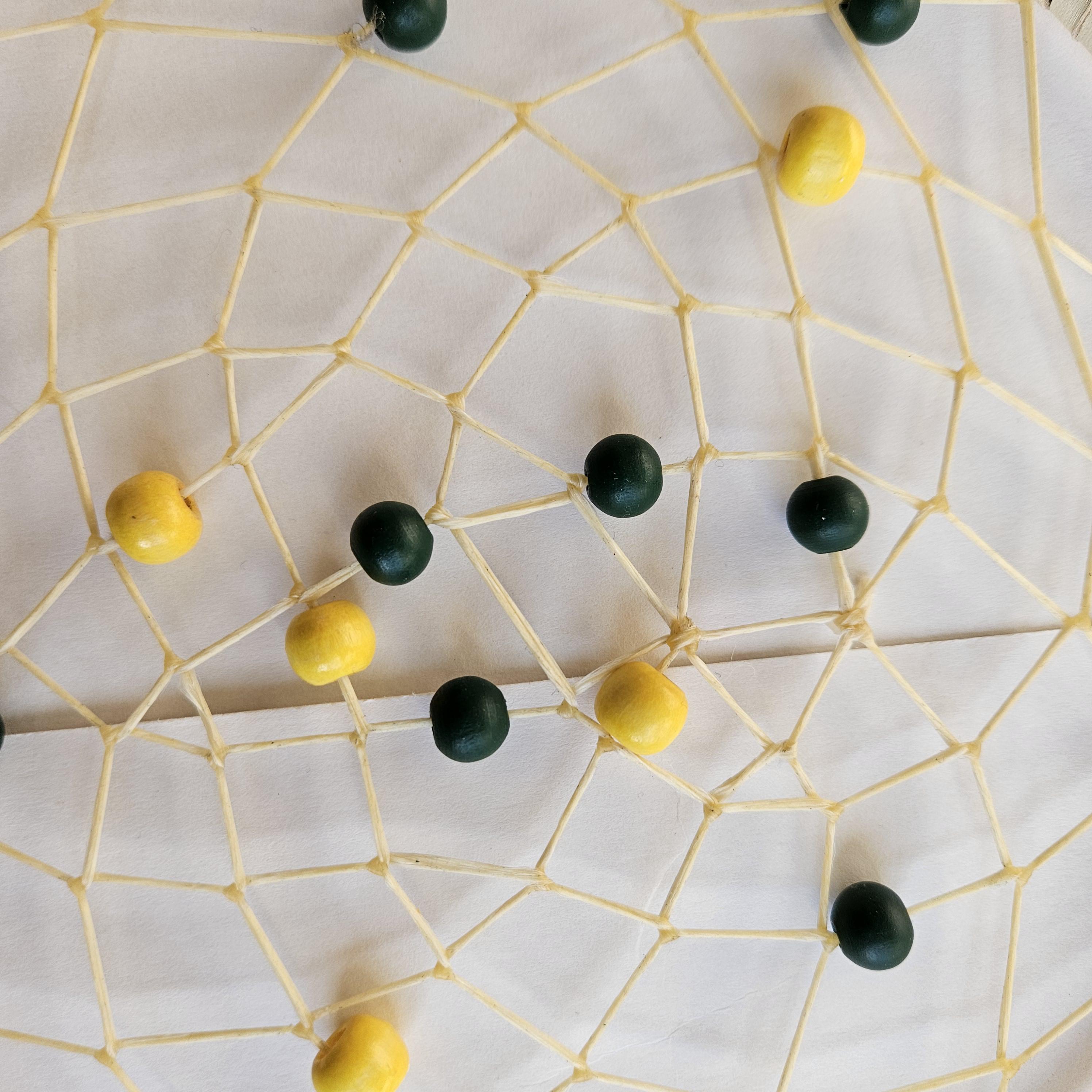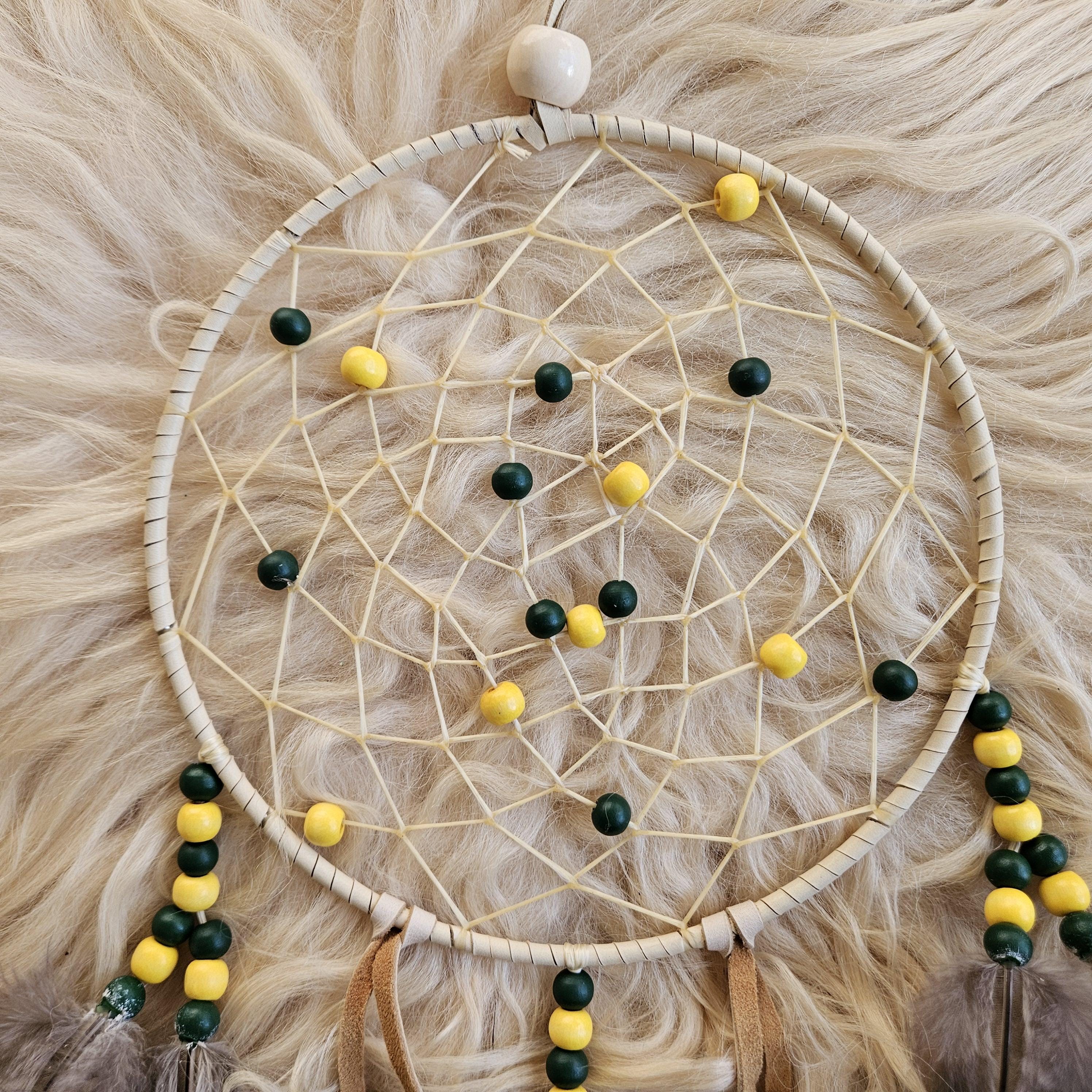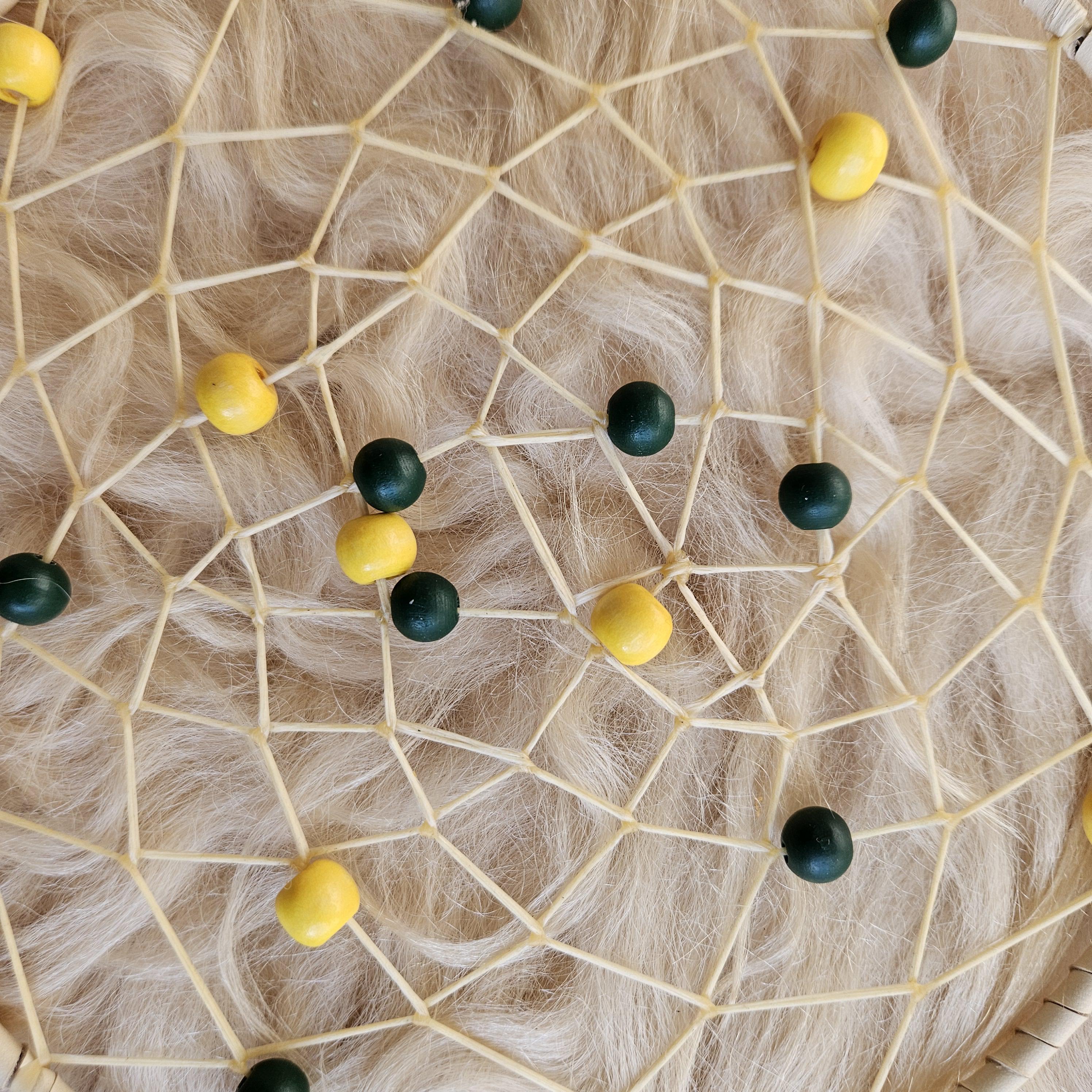 Web: weaved with sinew, deer antler, wood beads (green and gold),