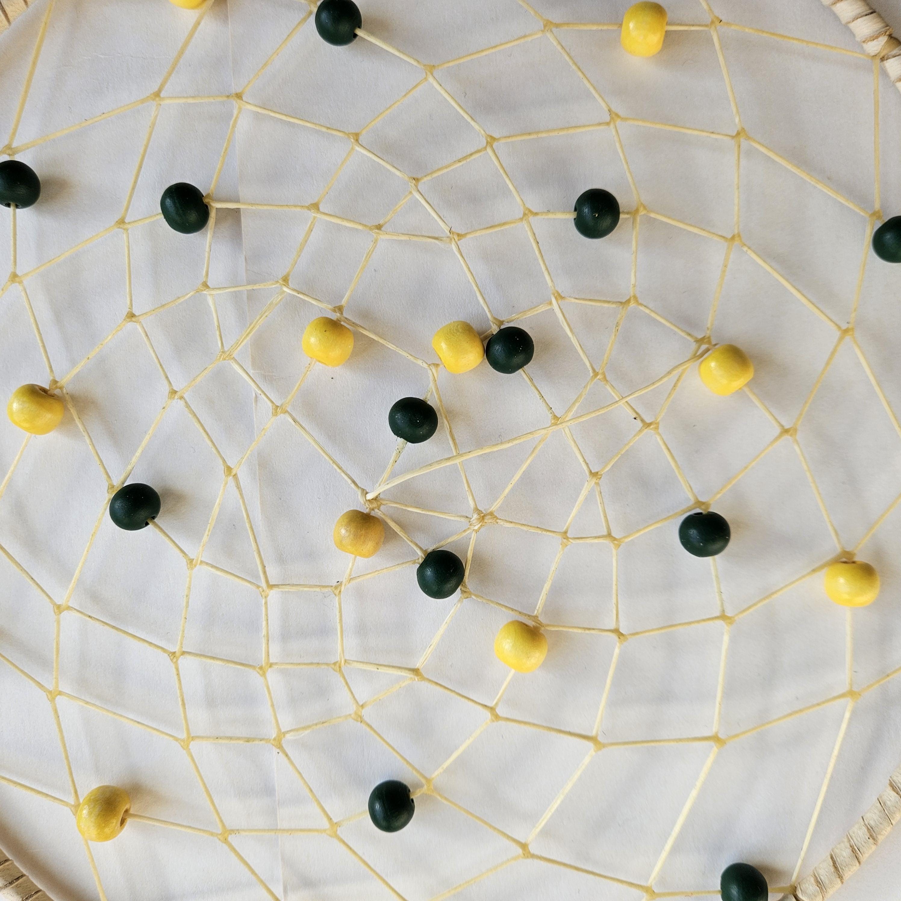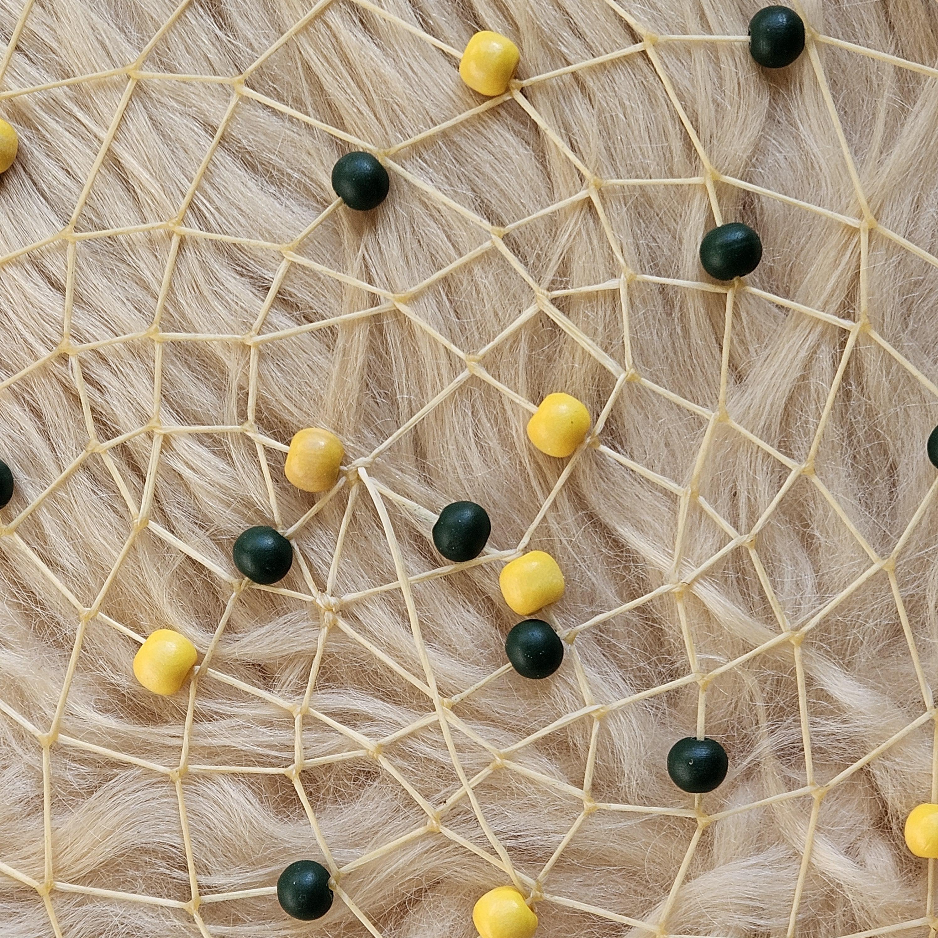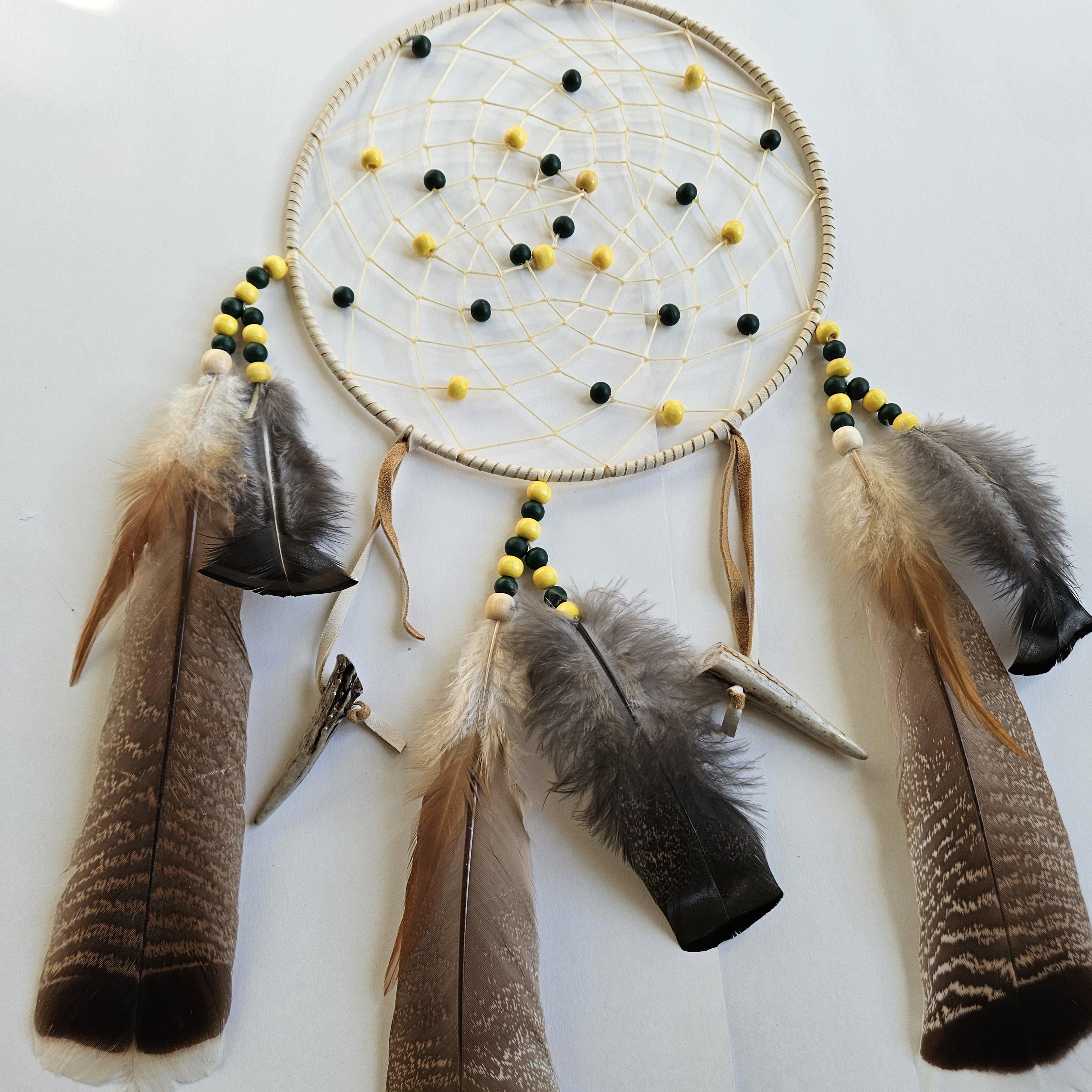 Web: weaved with sinew, deer antler, wood beads (green and gold),