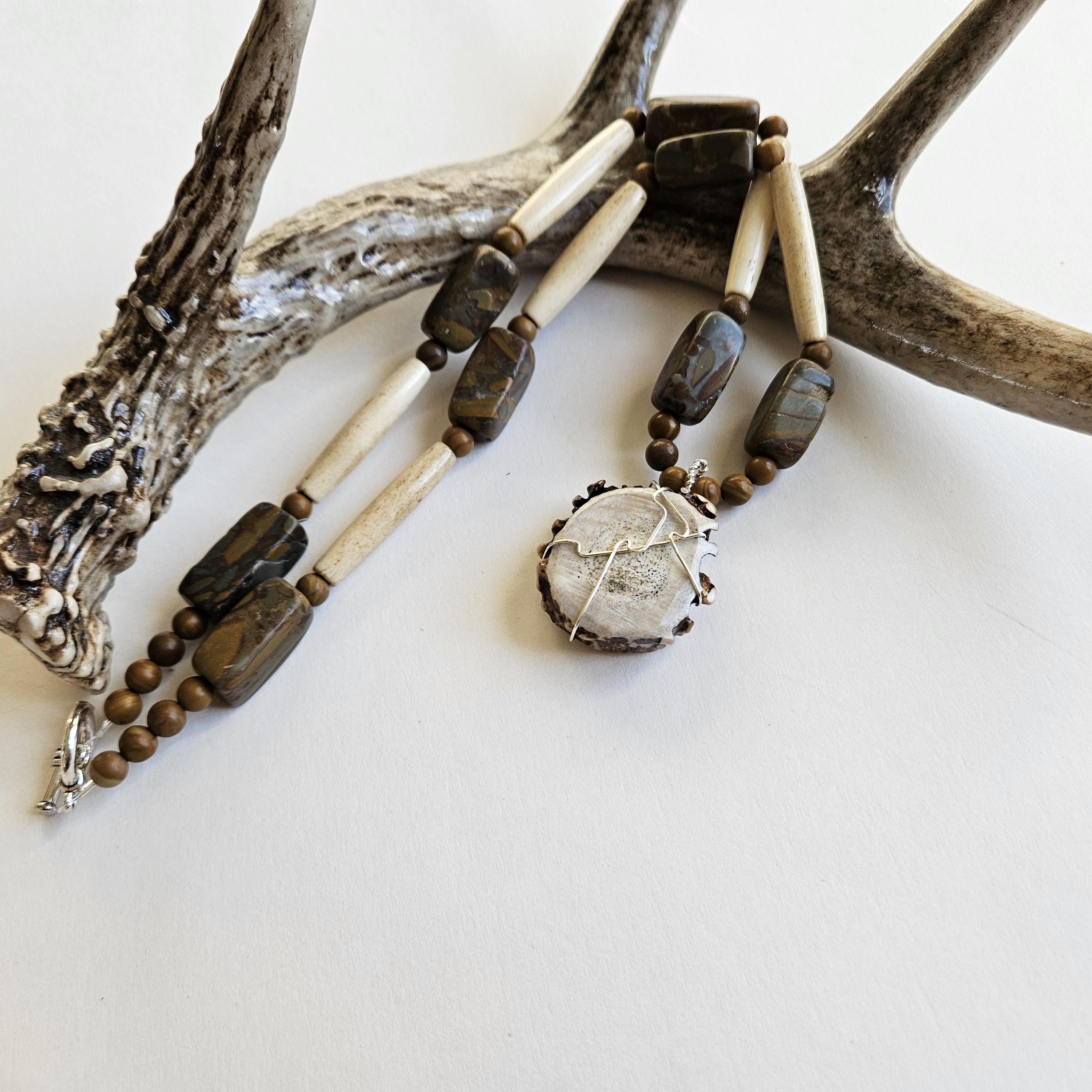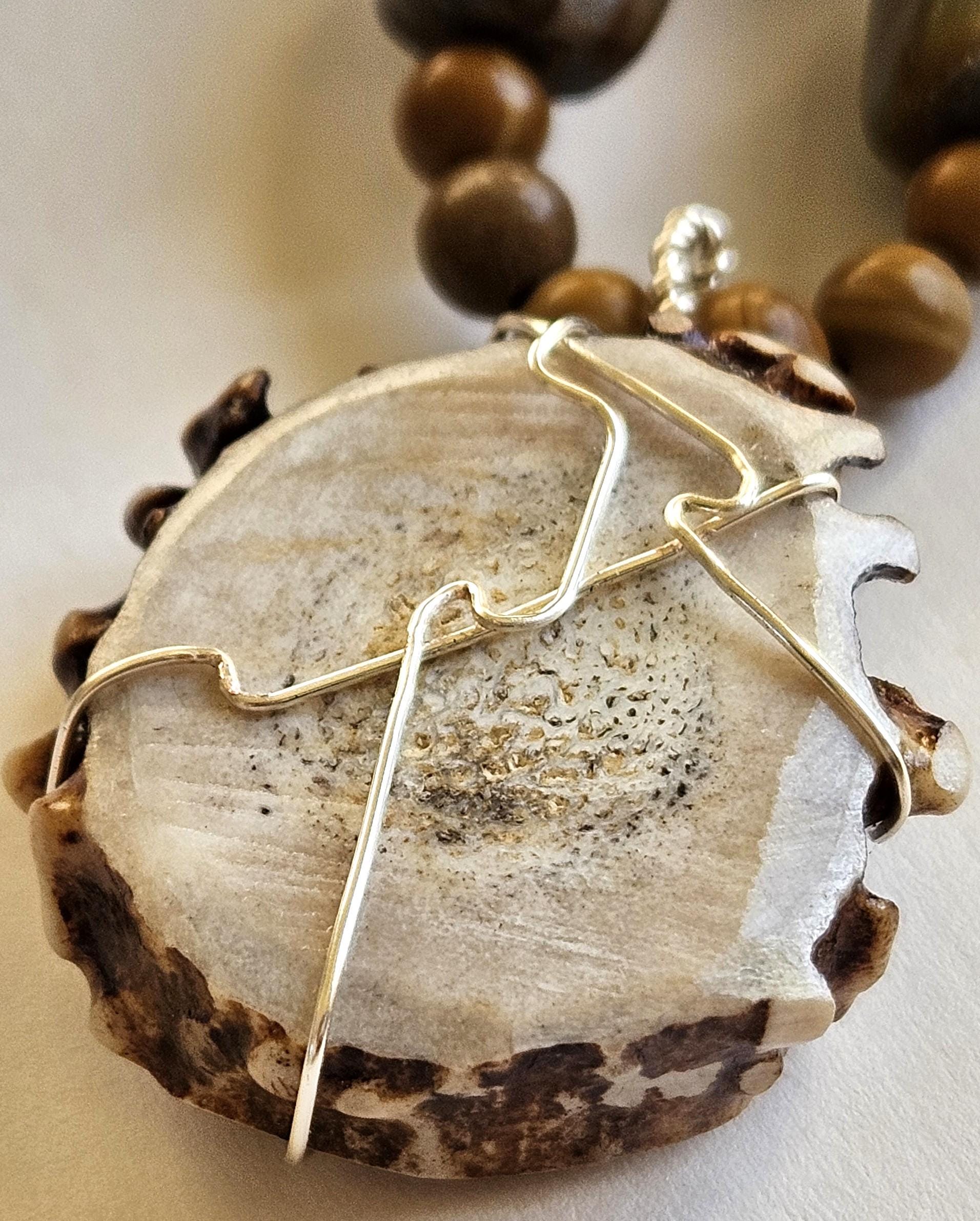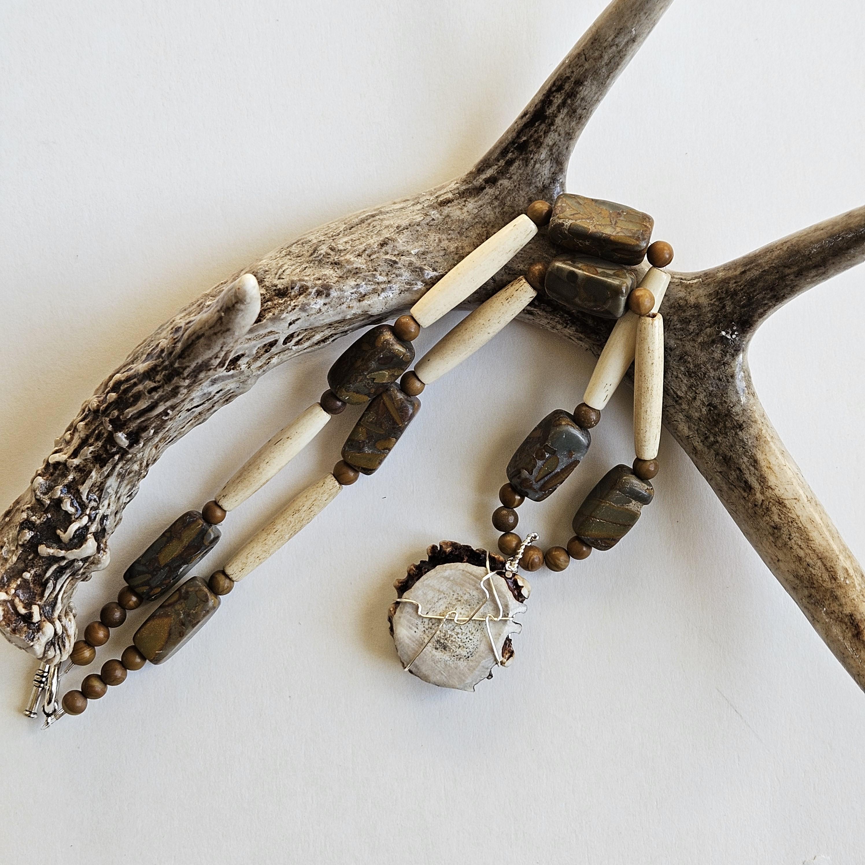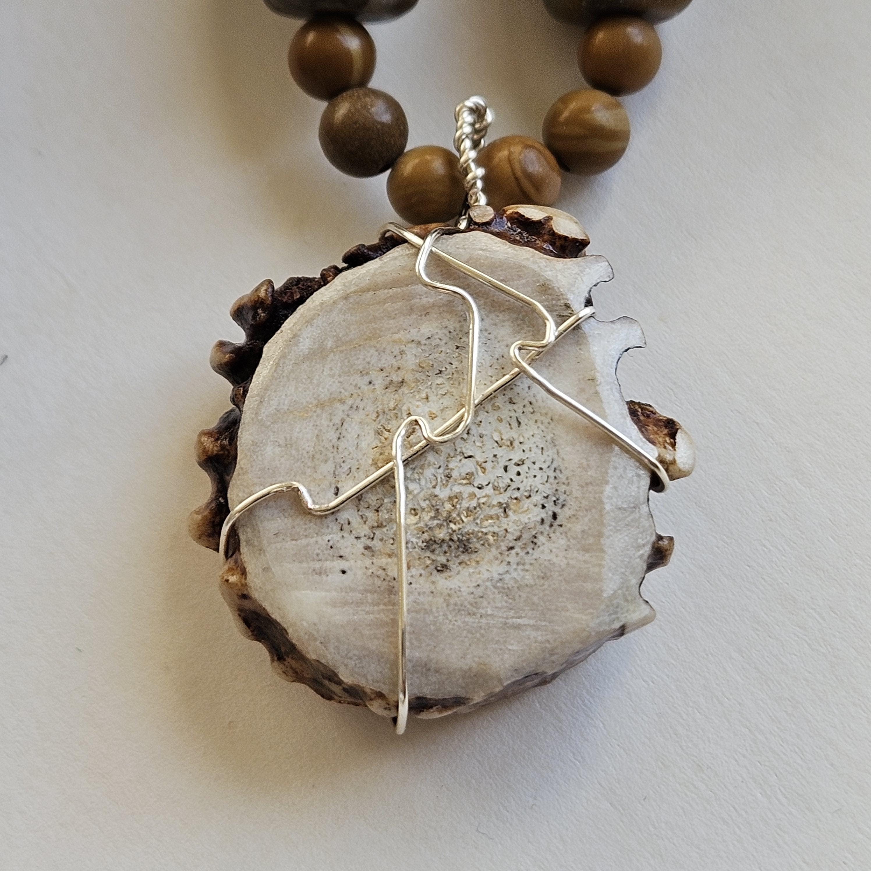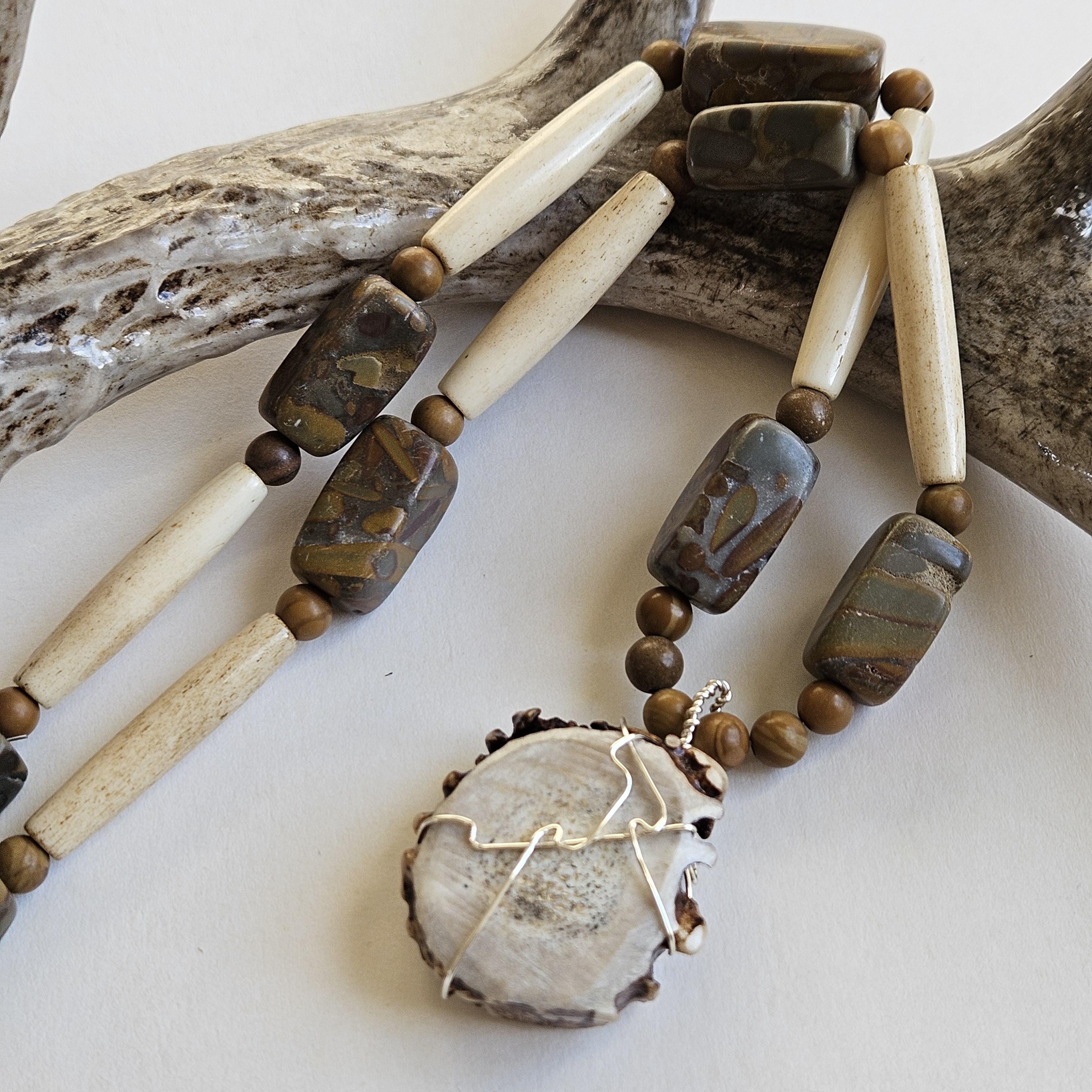 This truly unique necklace is strung with hairpin bone, and chrysanthemum beads and accented with a wire wrapped deer antler pendant. This is a great find for you or the unique one in your life.