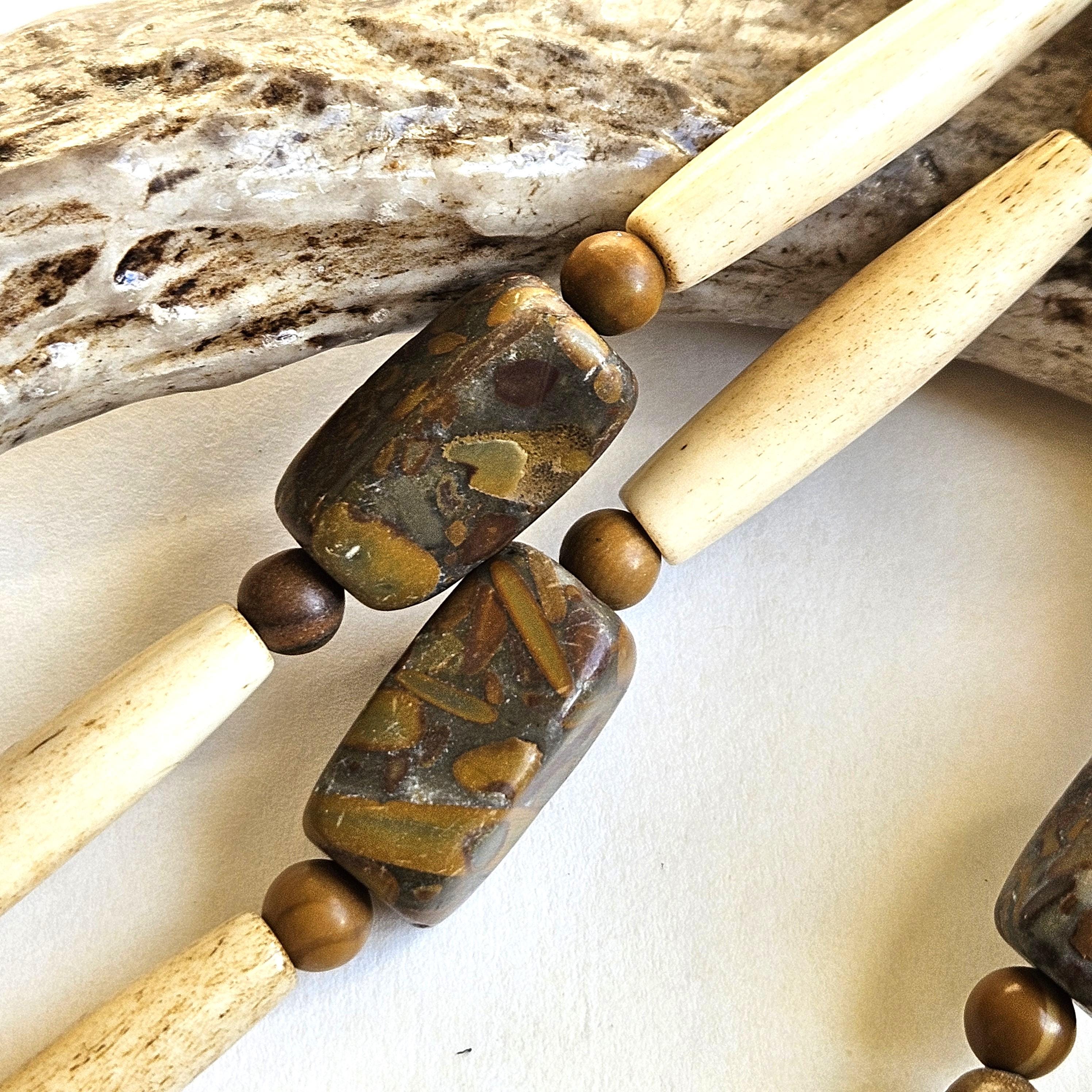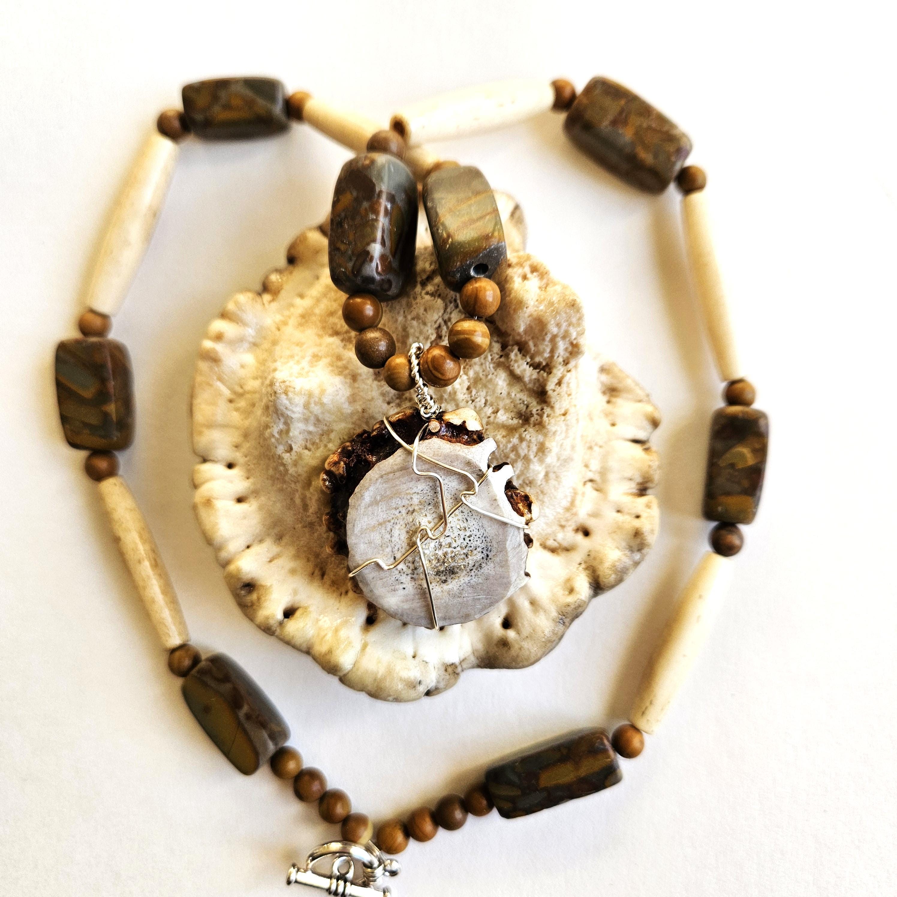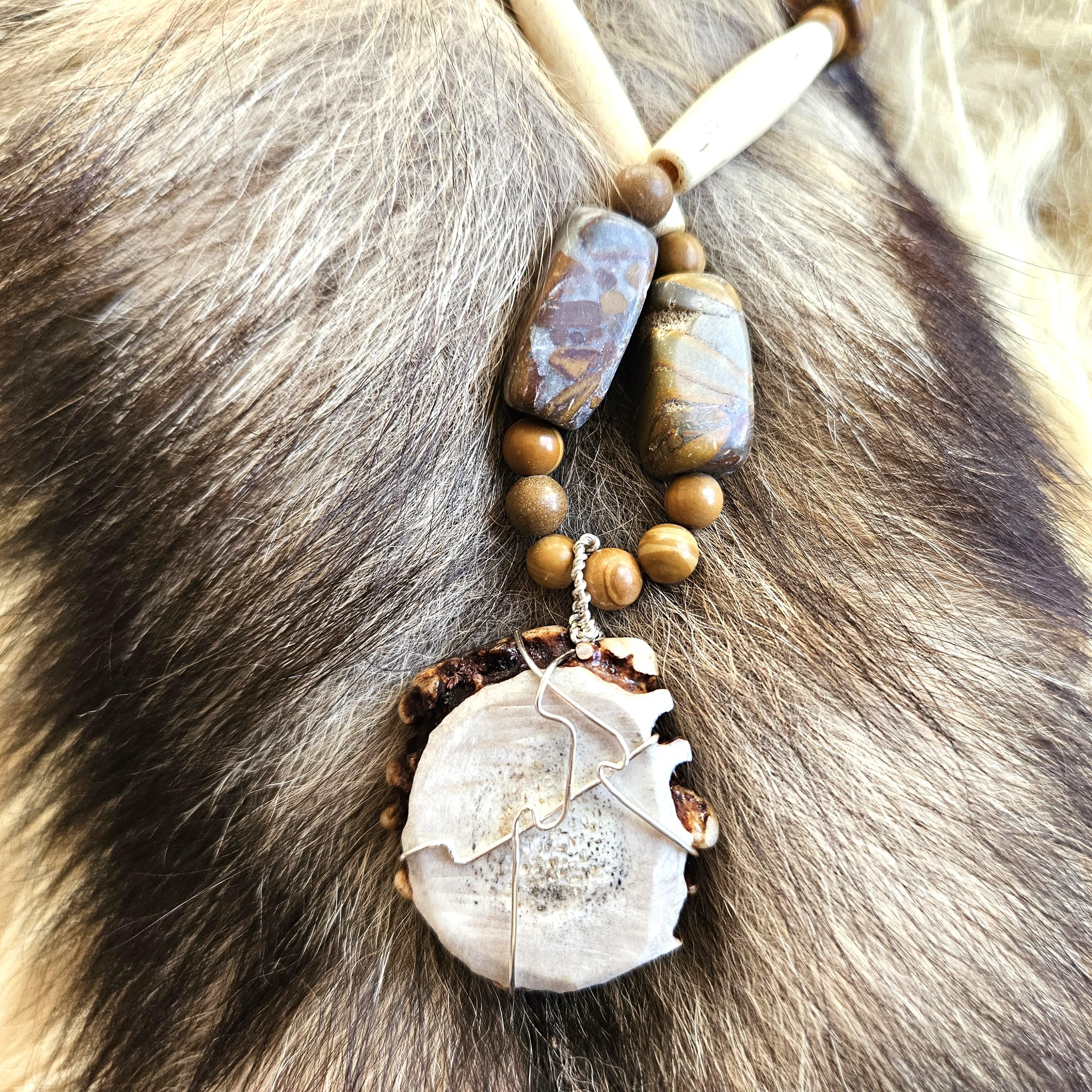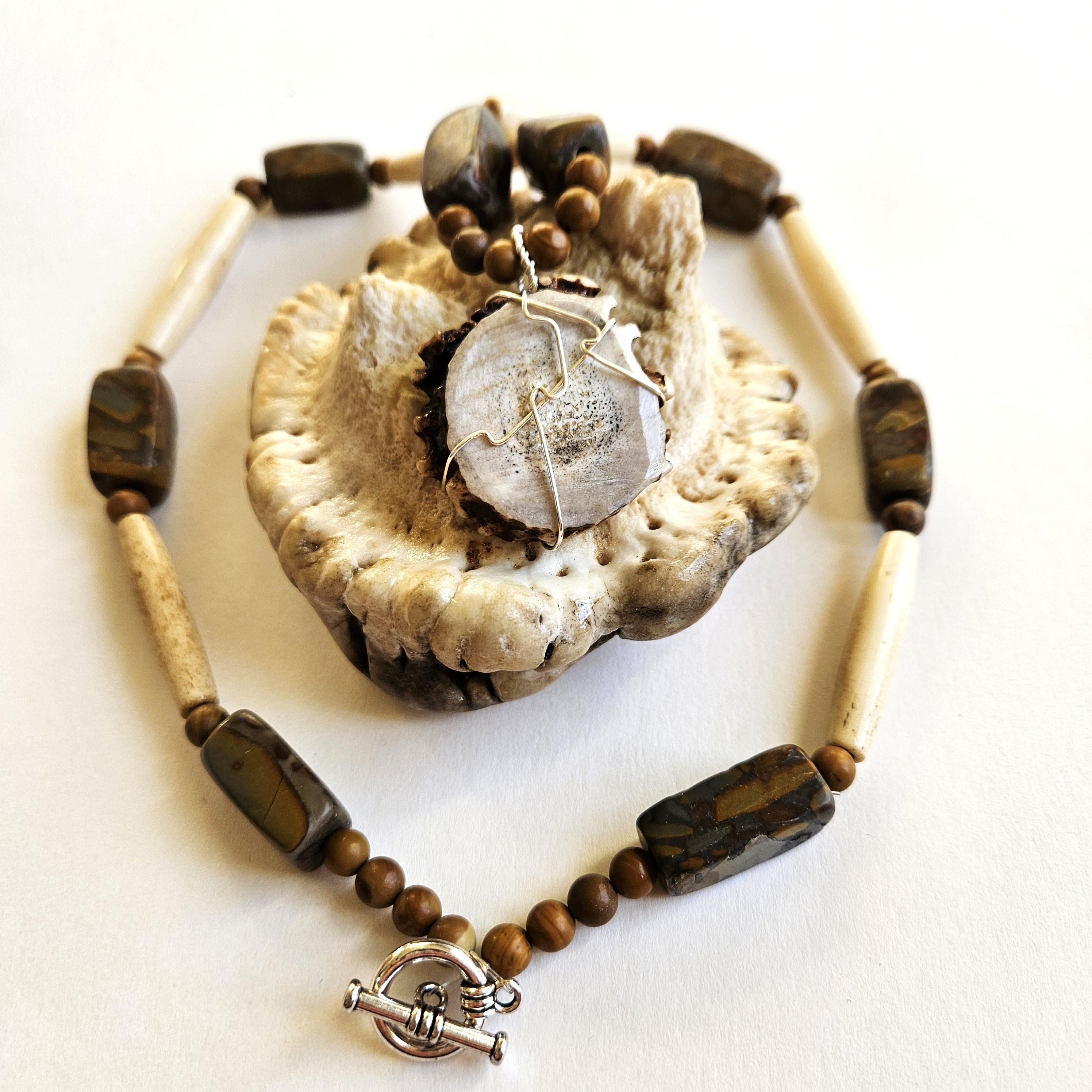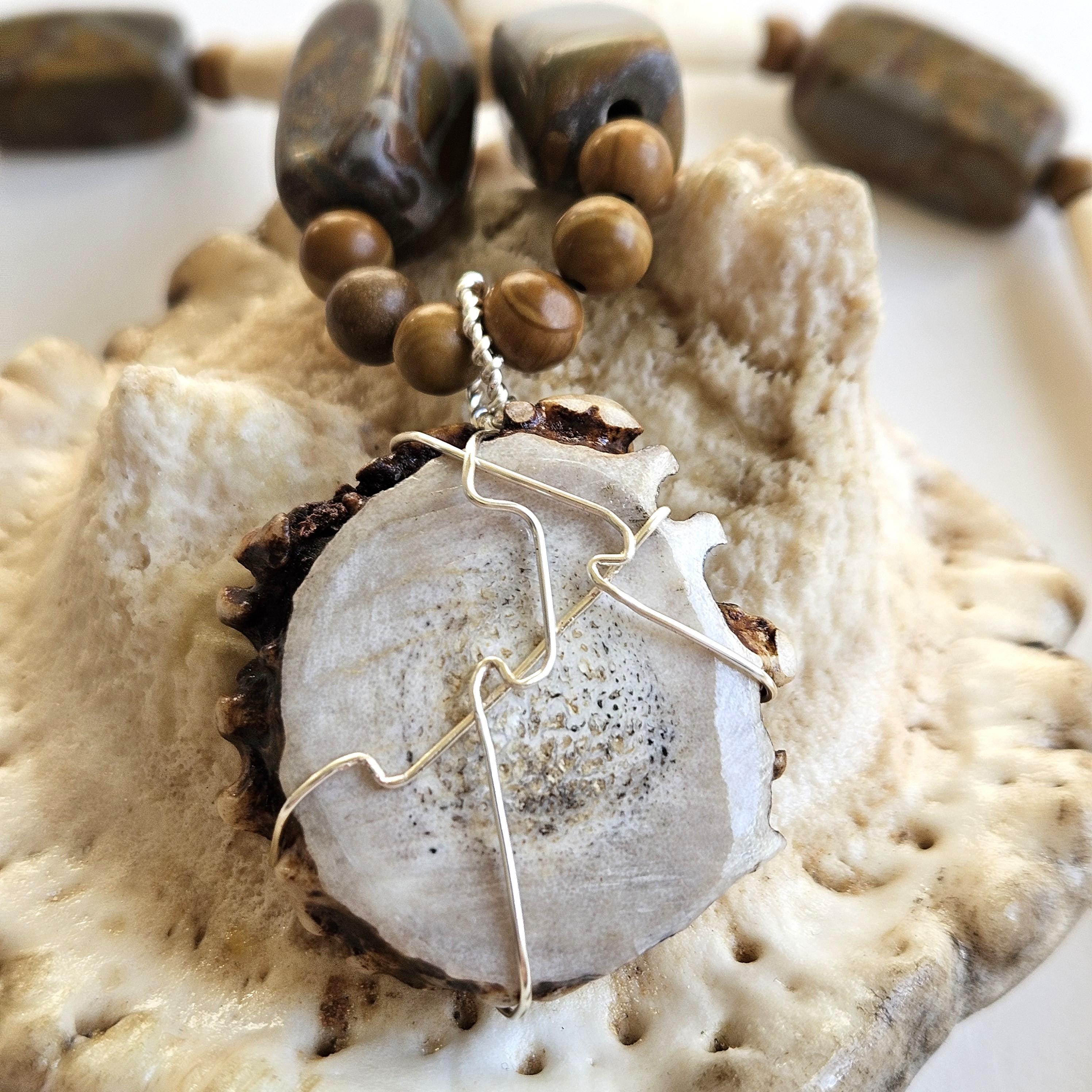 This truly unique necklace is strung with hairpin bone, and chrysanthemum beads and accented with a wire wrapped deer antler pendant. This is a great find for you or the unique one in your life.