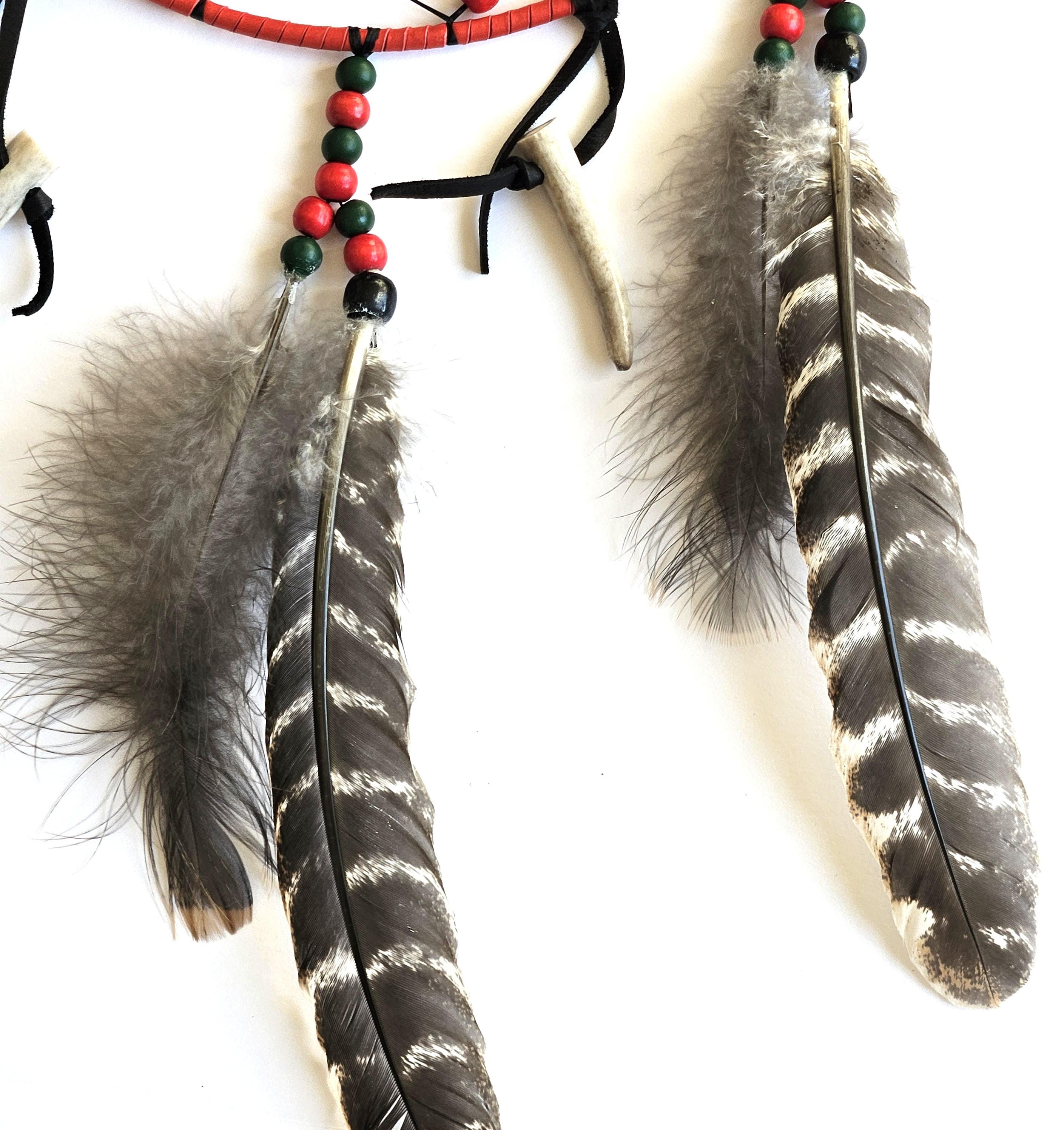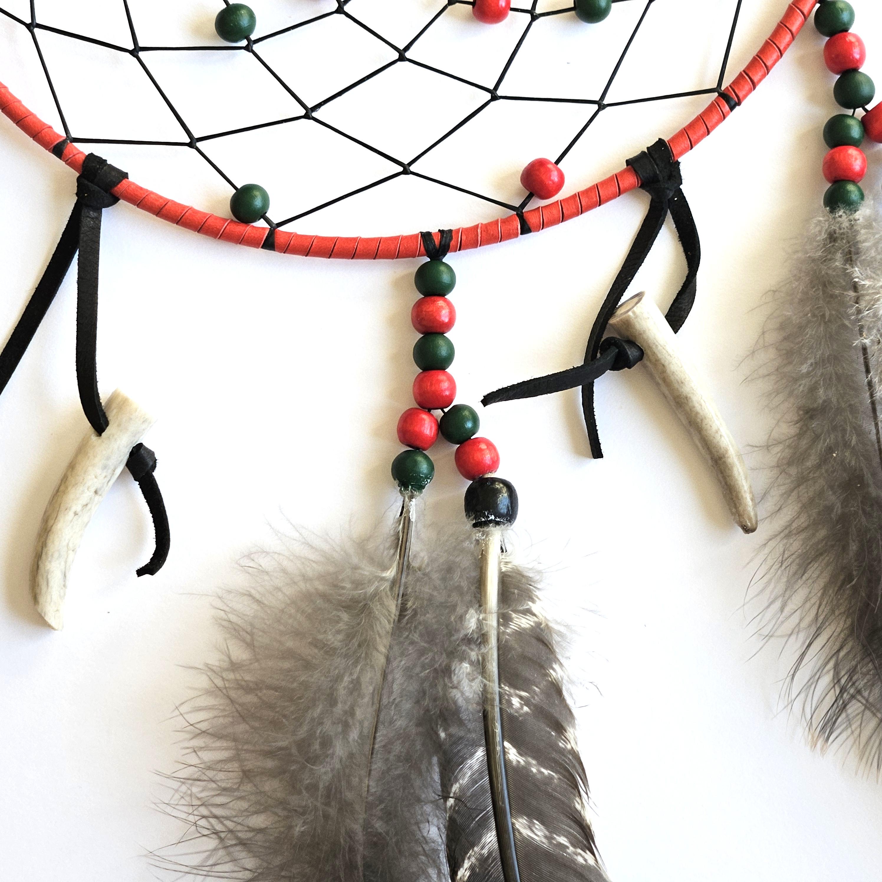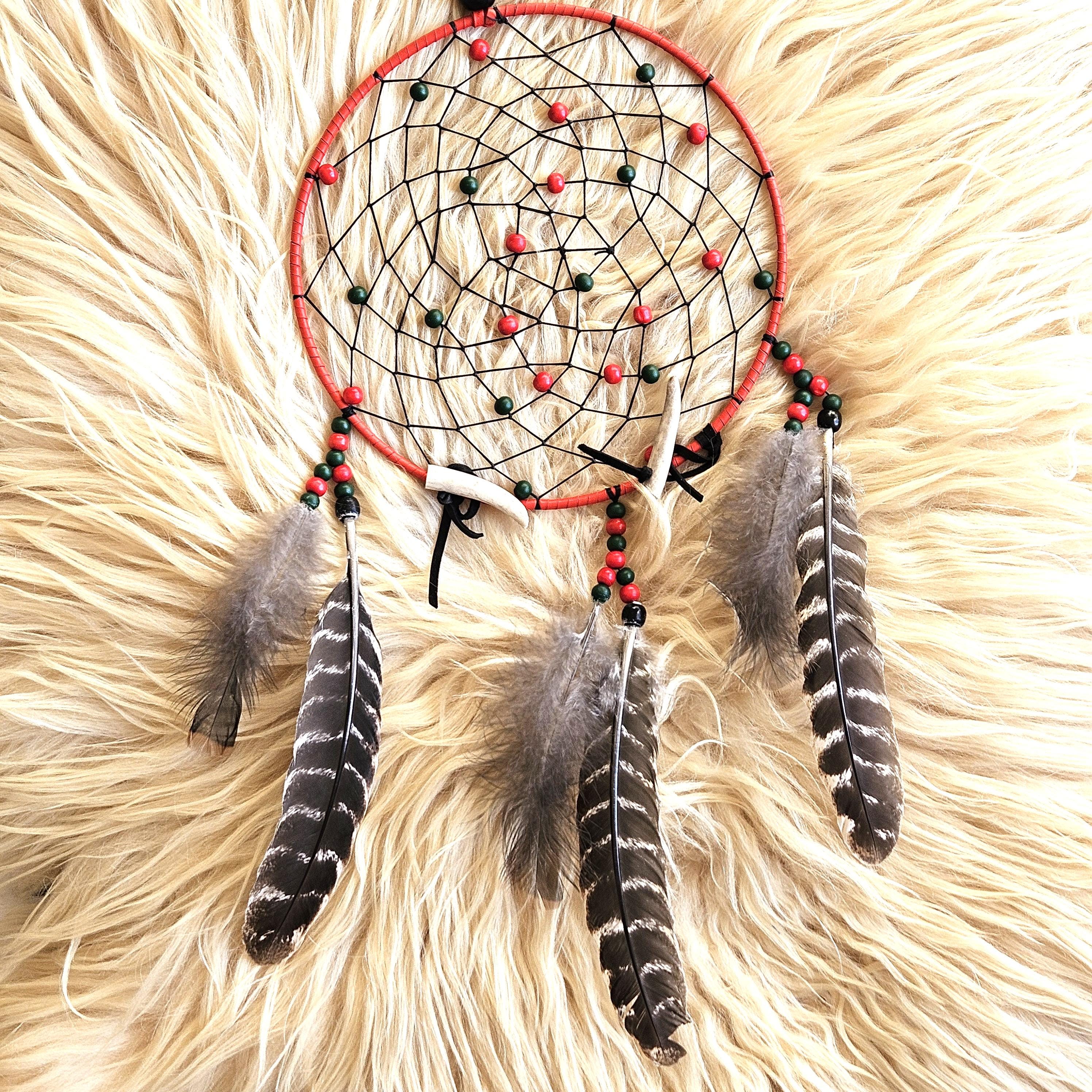 Celebrate the richness of Native American heritage with this Handcrafted Ojibwe Dreamcatcher. This unique creation showcases beautiful wild Wisconsin turkey feathers, genuine deer antler components, and a sturdy leather hoop, with each part carefully chosen for its cultural importance. In Native American tradition, the Deer symbolizes grace, gratitude, agility, and abundance. Ideal for gifting or enhancing your personal space, this captivating dreamcatcher serves as a remarkable statement piece that respects both tradition and craftsmanship. Place it above your bed to ward off nightmares and welcome serene thoughts. Allow this exquisite dreamcatcher to infuse your environment with harmony and spirit!