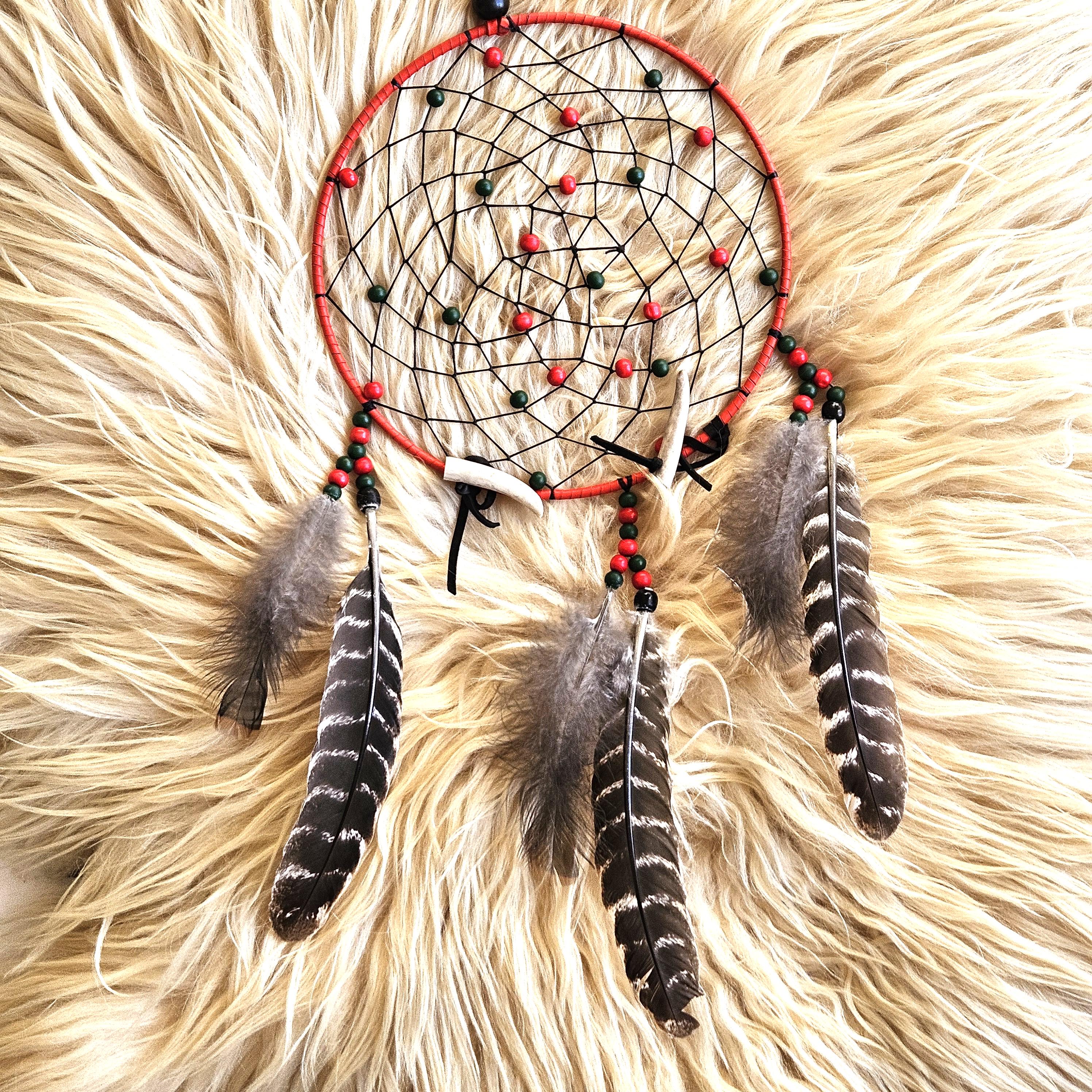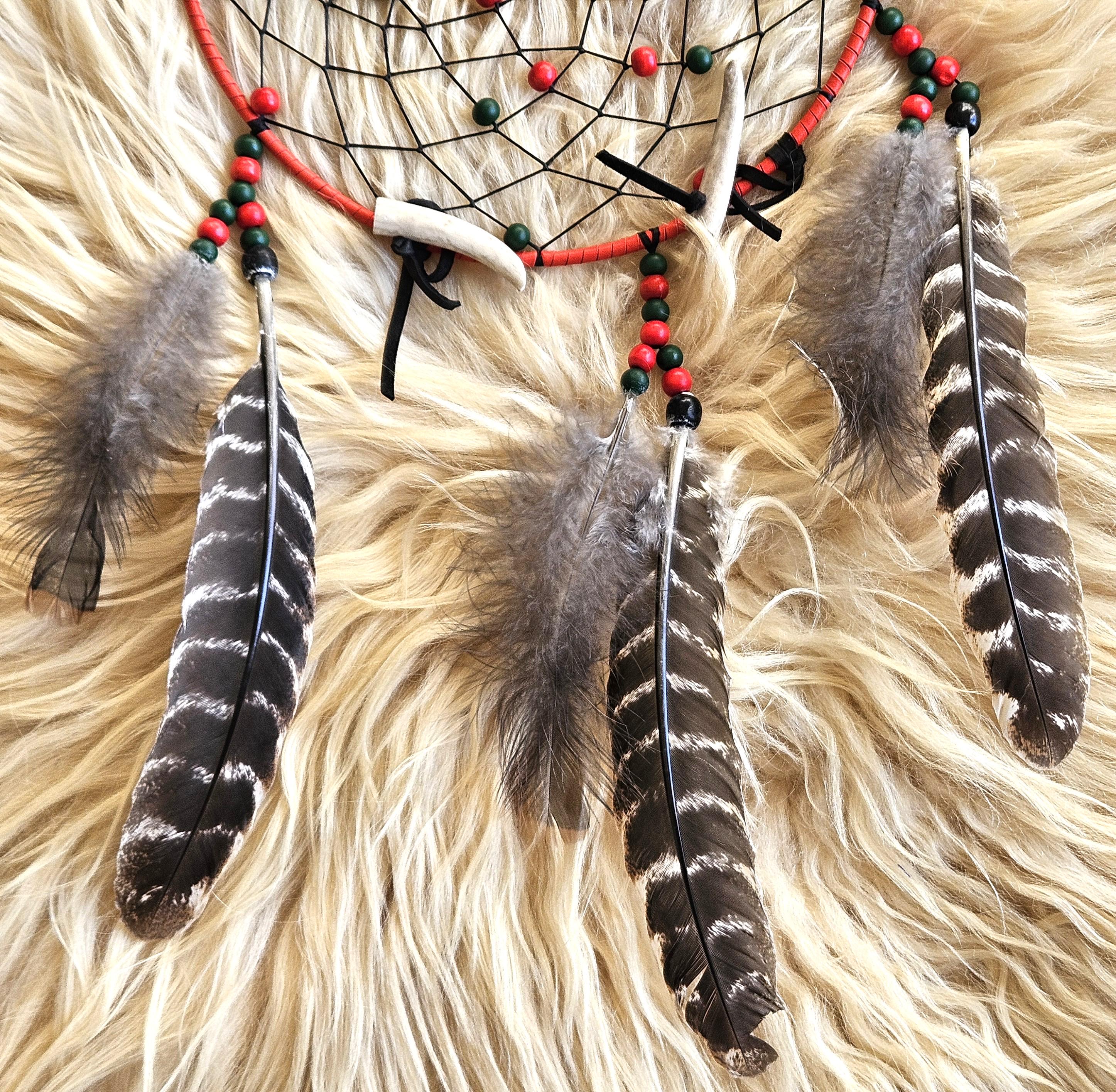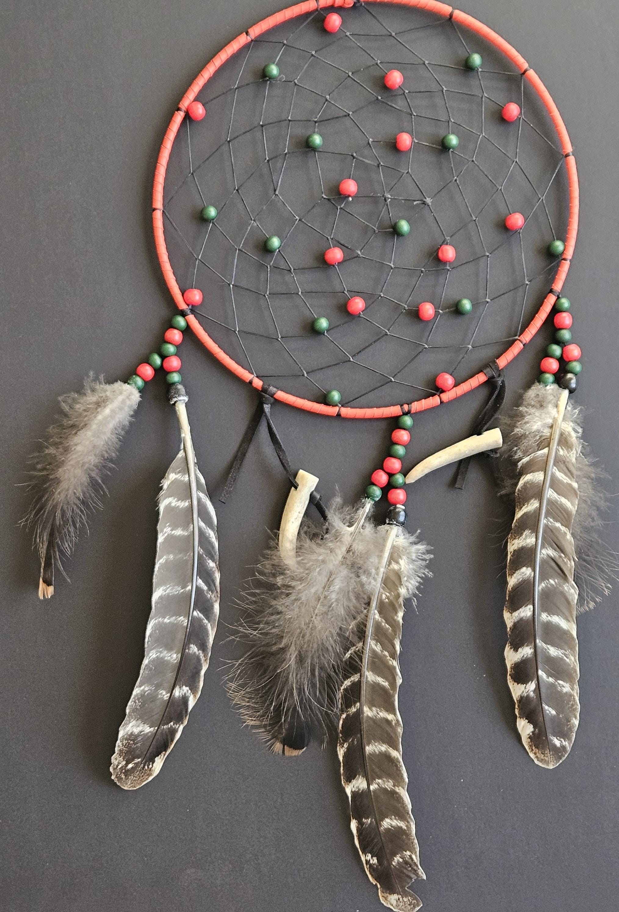 Celebrate the richness of Native American heritage with this Handcrafted Ojibwe Dreamcatcher. This unique creation showcases beautiful wild Wisconsin turkey feathers, genuine deer antler components, and a sturdy leather hoop, with each part carefully chosen for its cultural importance. In Native American tradition, the Deer symbolizes grace, gratitude, agility, and abundance. Ideal for gifting or enhancing your personal space, this captivating dreamcatcher serves as a remarkable statement piece that respects both tradition and craftsmanship. Place it above your bed to ward off nightmares and welcome serene thoughts. Allow this exquisite dreamcatcher to infuse your environment with harmony and spirit!