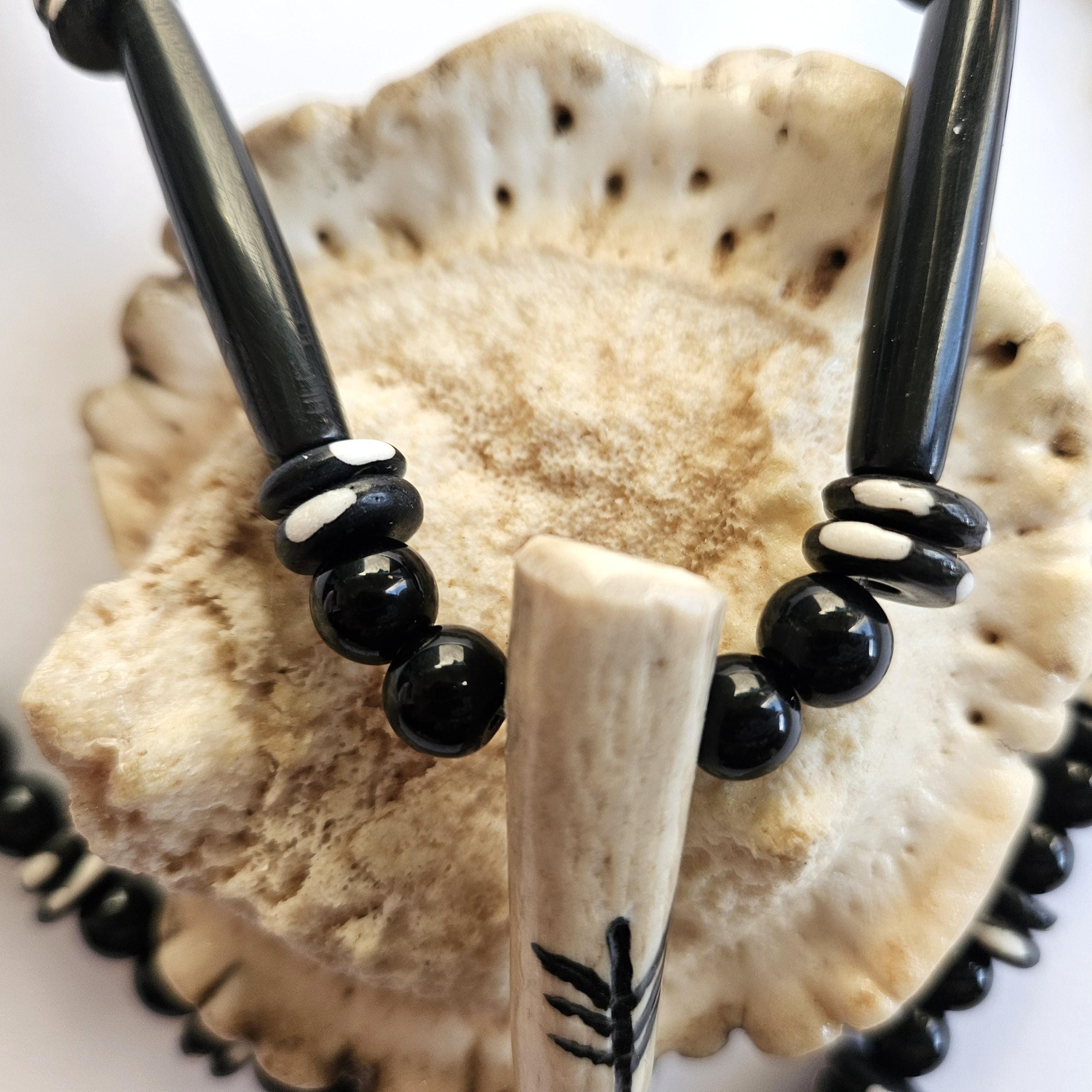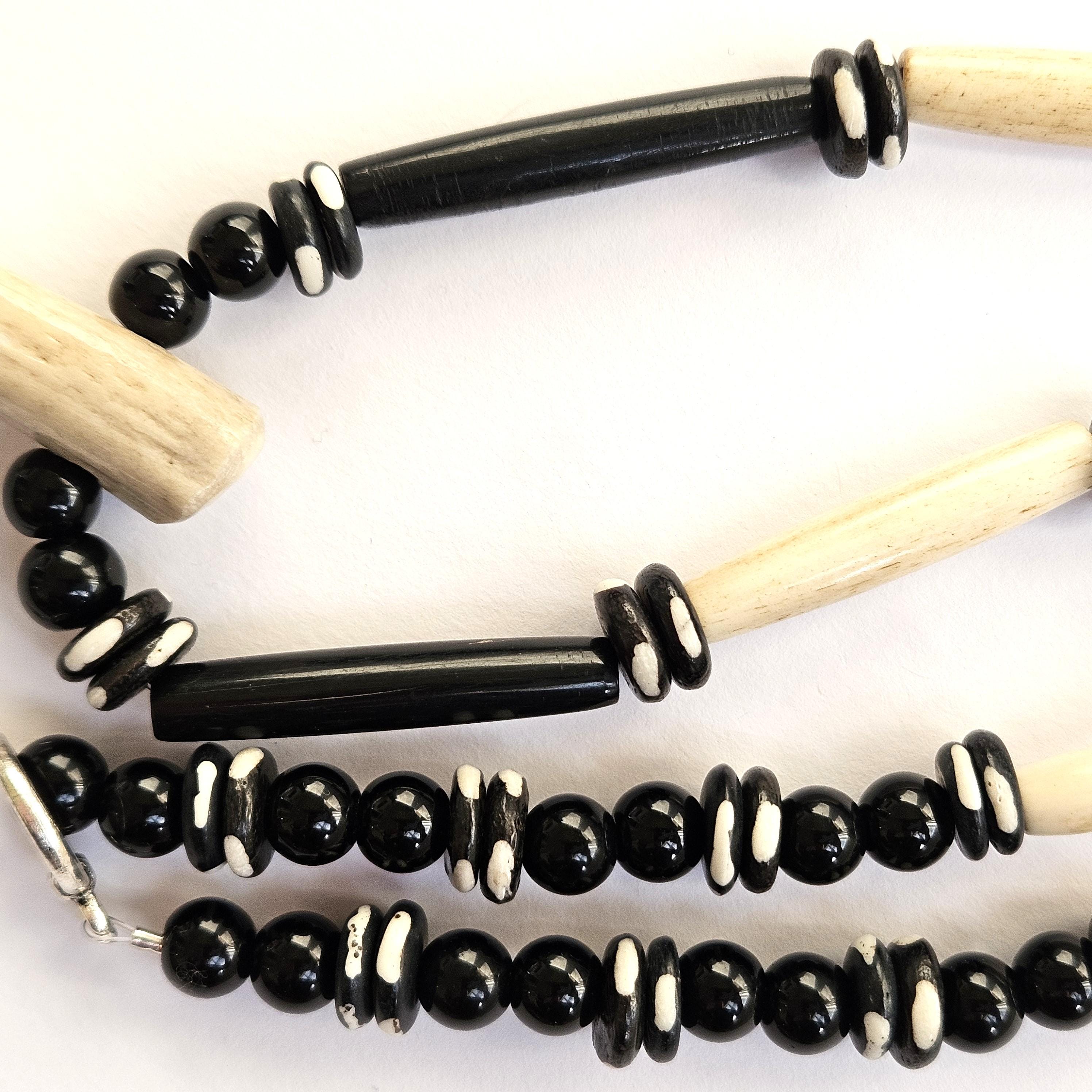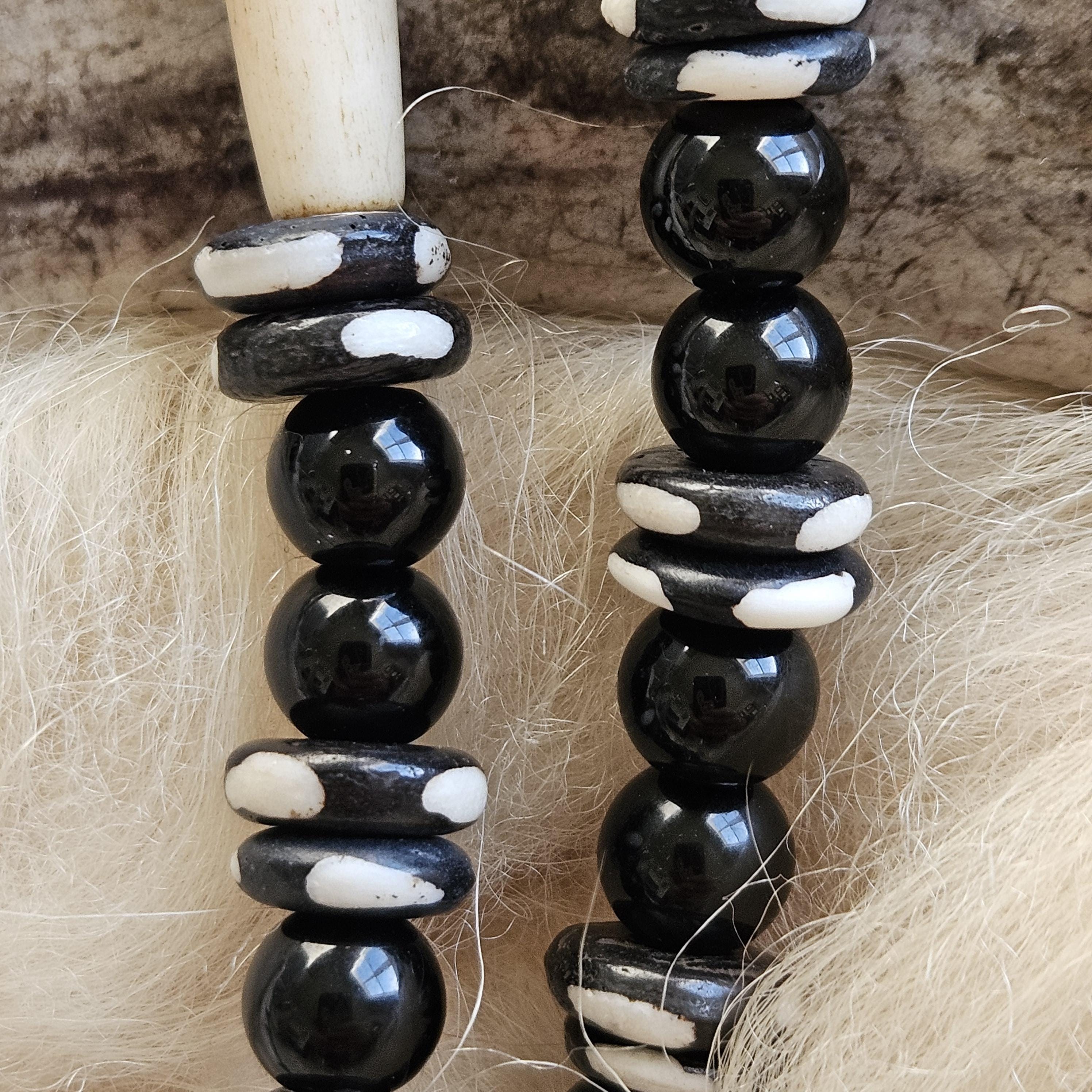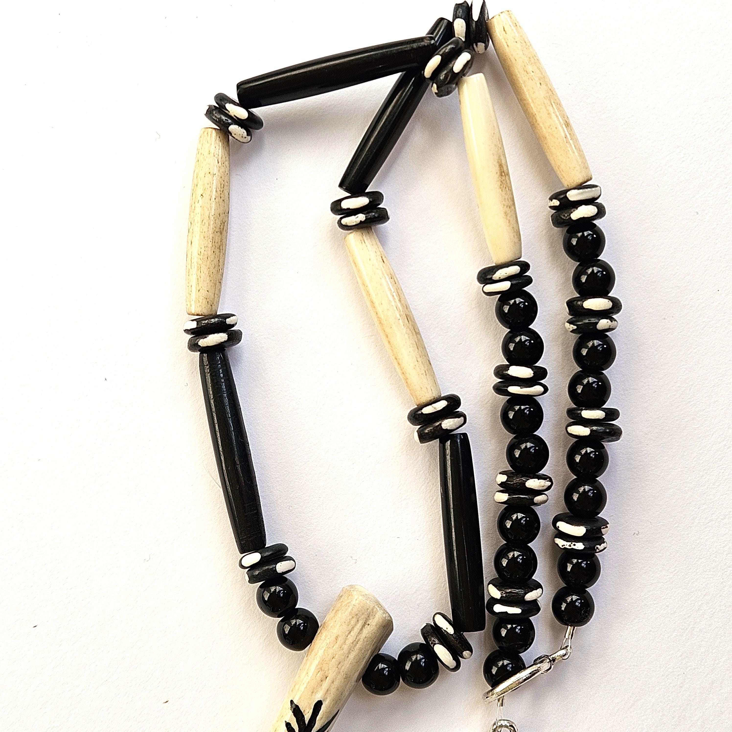 Beads: black and beige hairpin horn, black/white bone, black glass