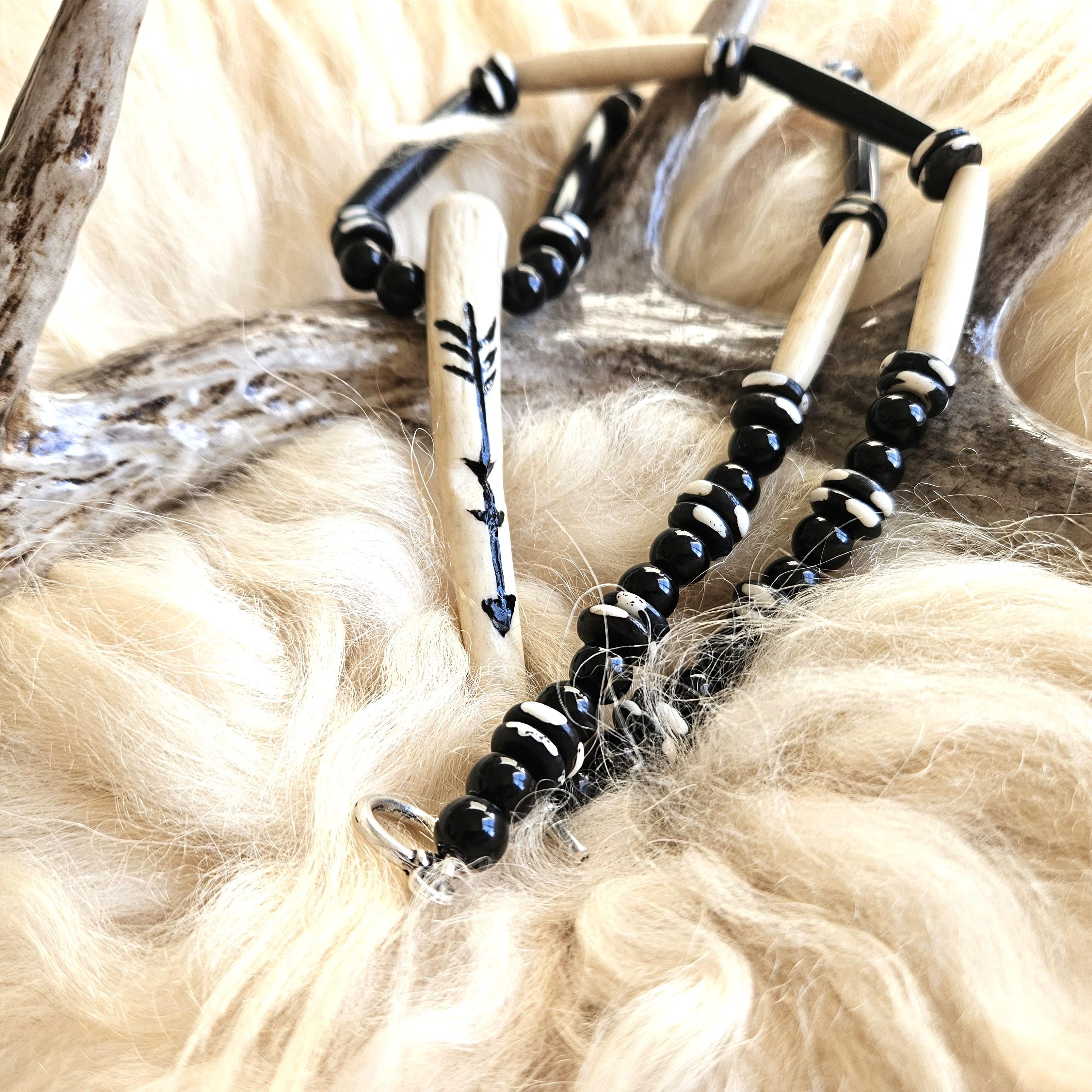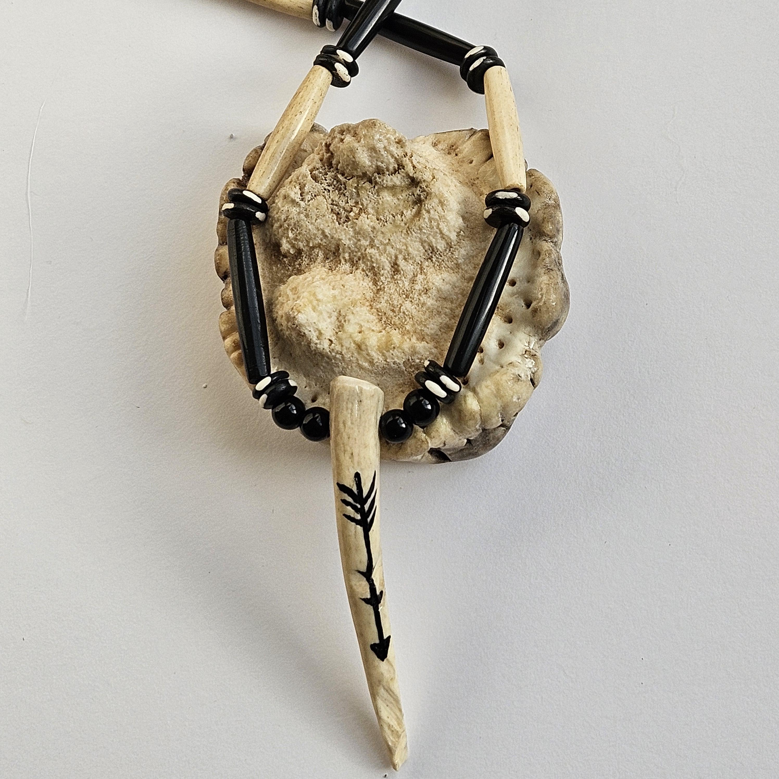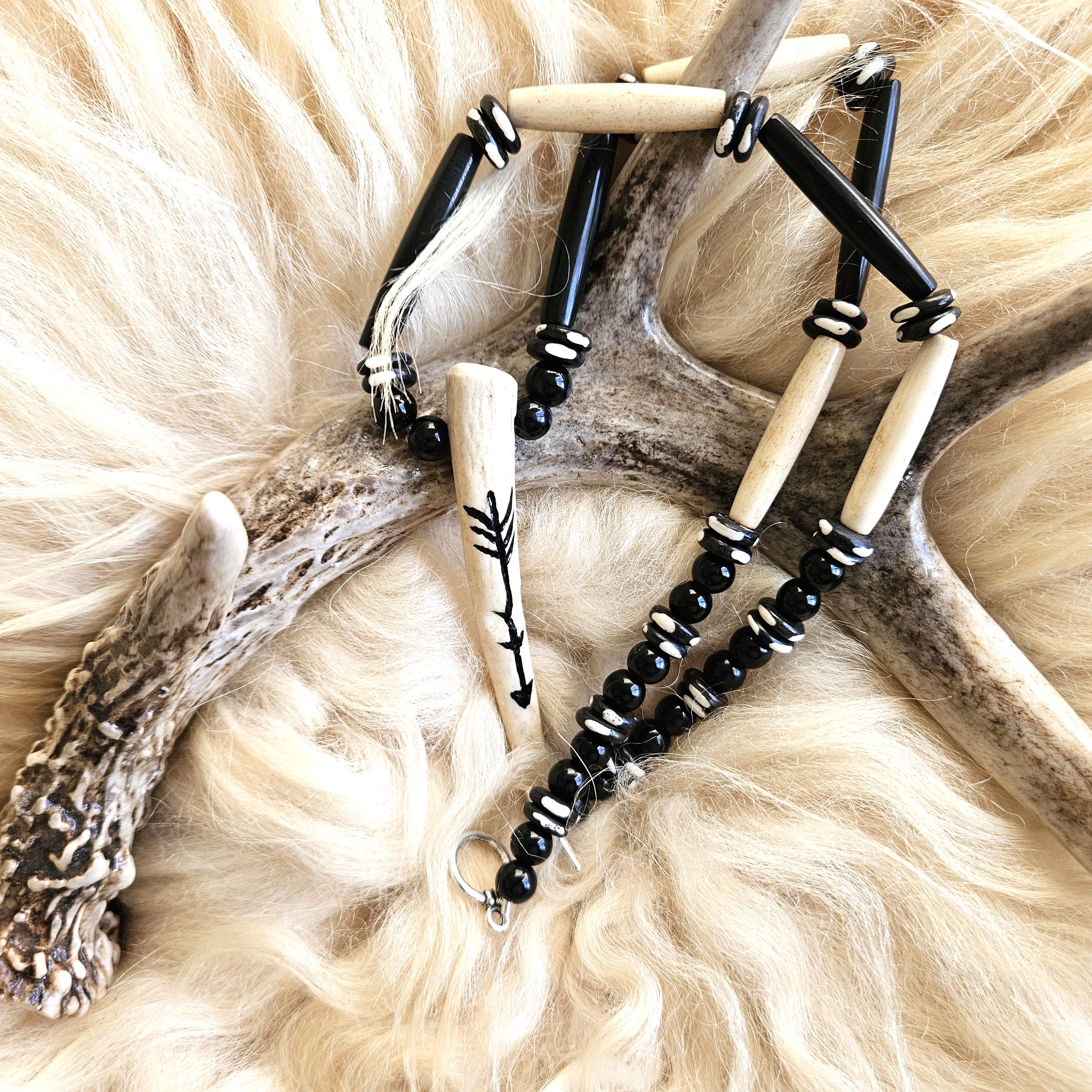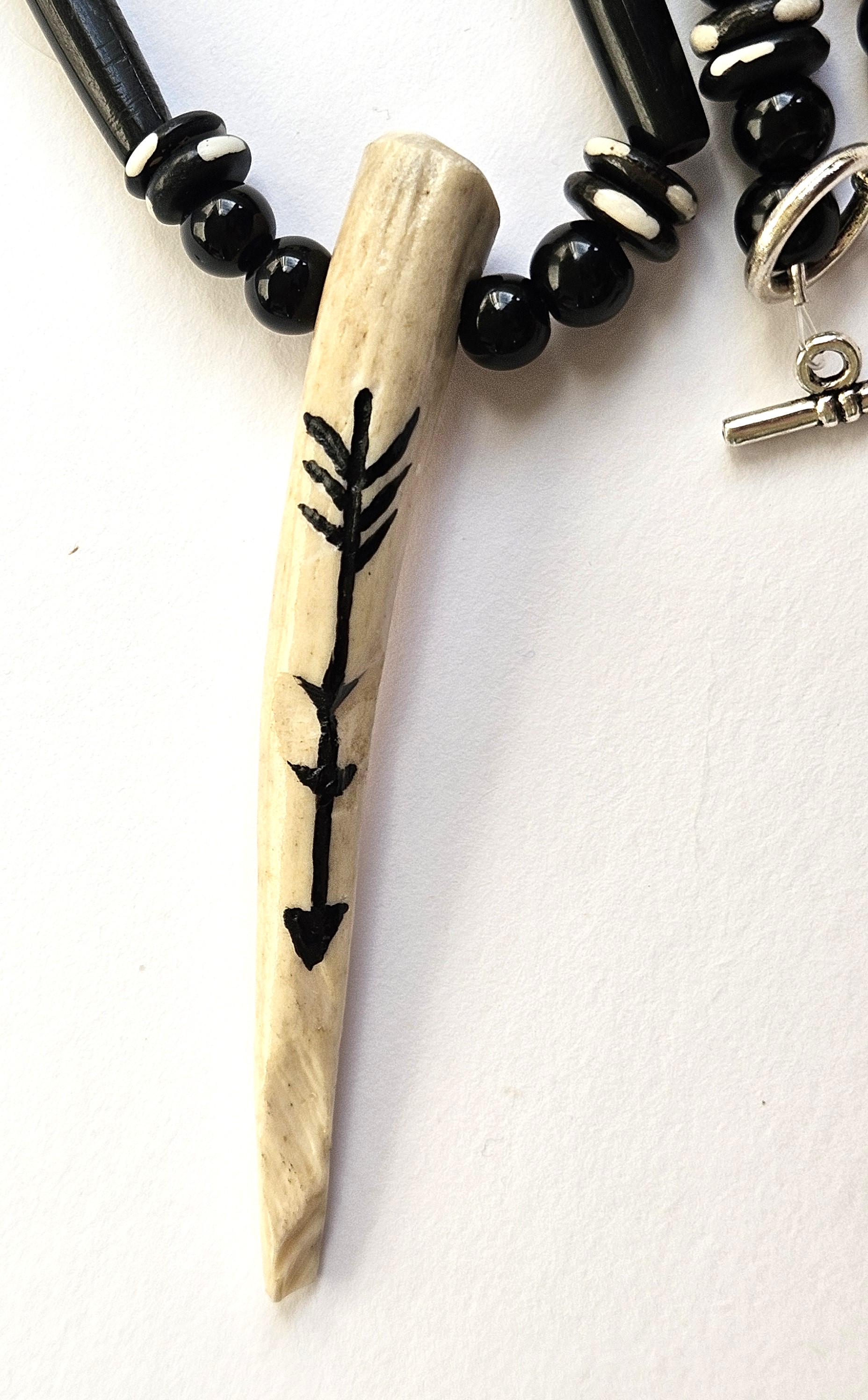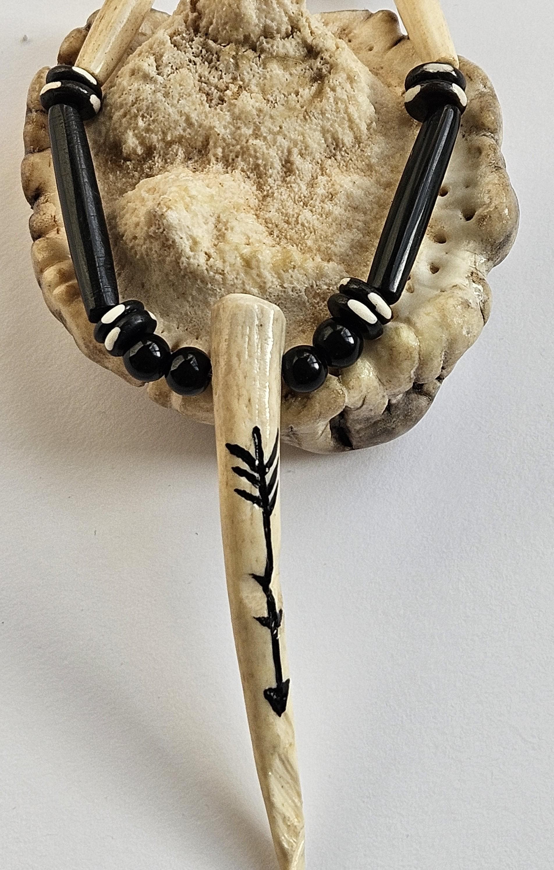 Discover the beauty of this one-of-a-kind Ojibwe deer antler tip necklace accented with bone, horn and glass beads. The antler tip is carved and painted with an arrow. Made with care and attention to detail, this stunning necklace is not just an accessory, but a meaningful connection to tradition and nature. Perfect for adding a touch of authenticity to your style or as a thoughtful gift. Embrace uniqueness and celebrate cultural heritage with wearable art that tells a story!
