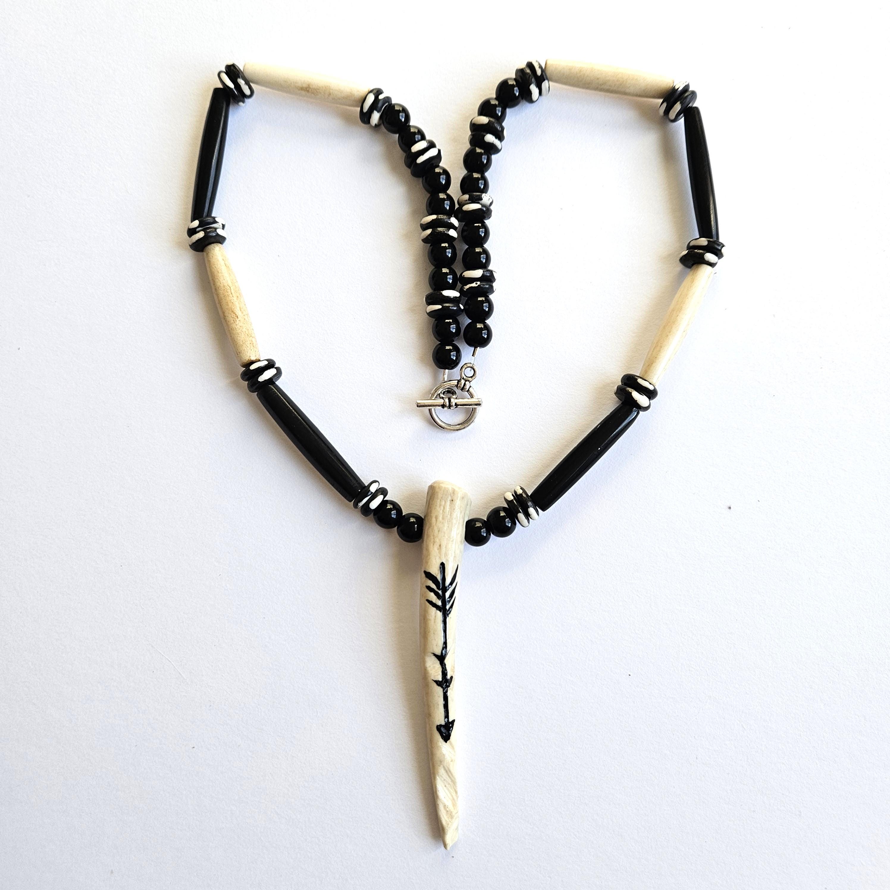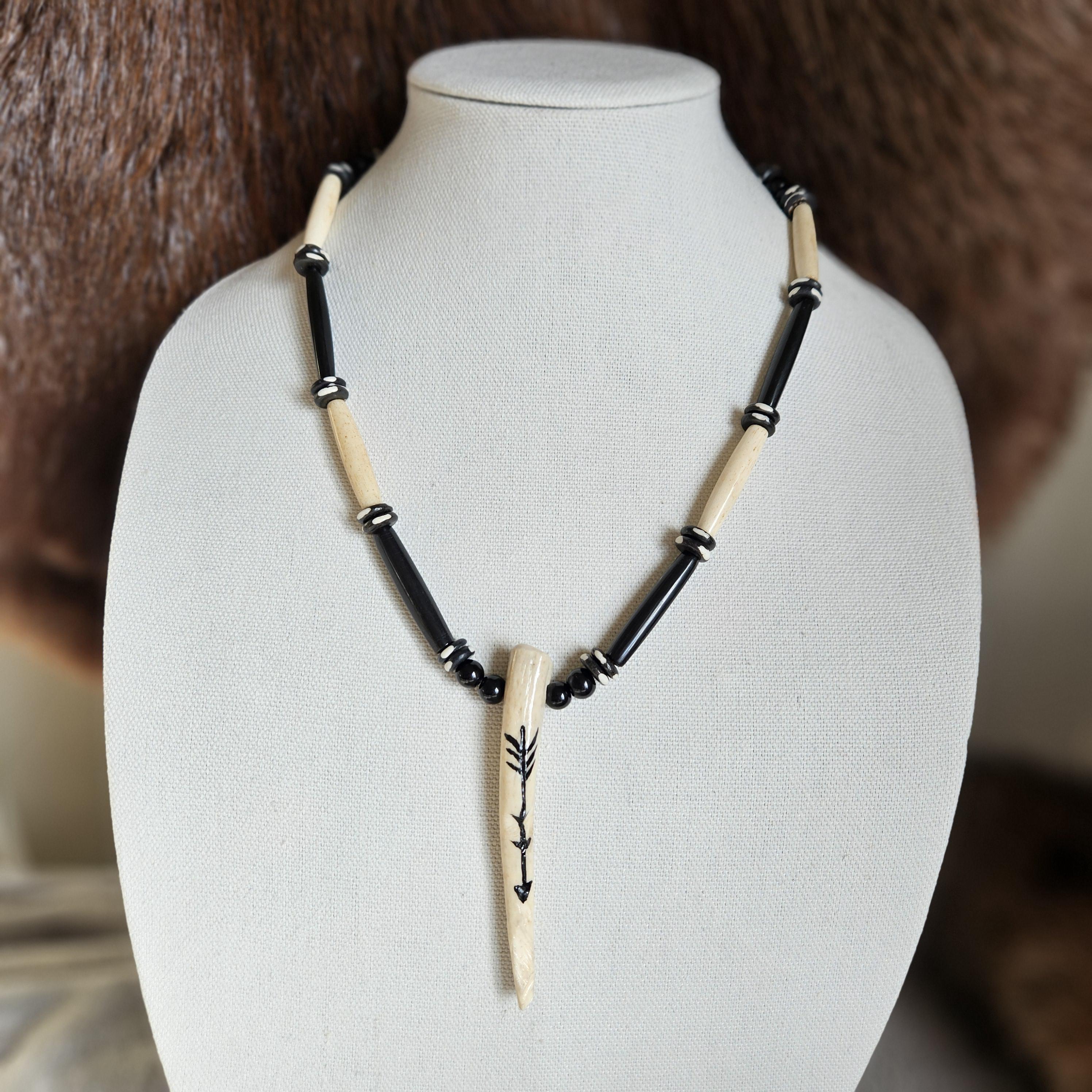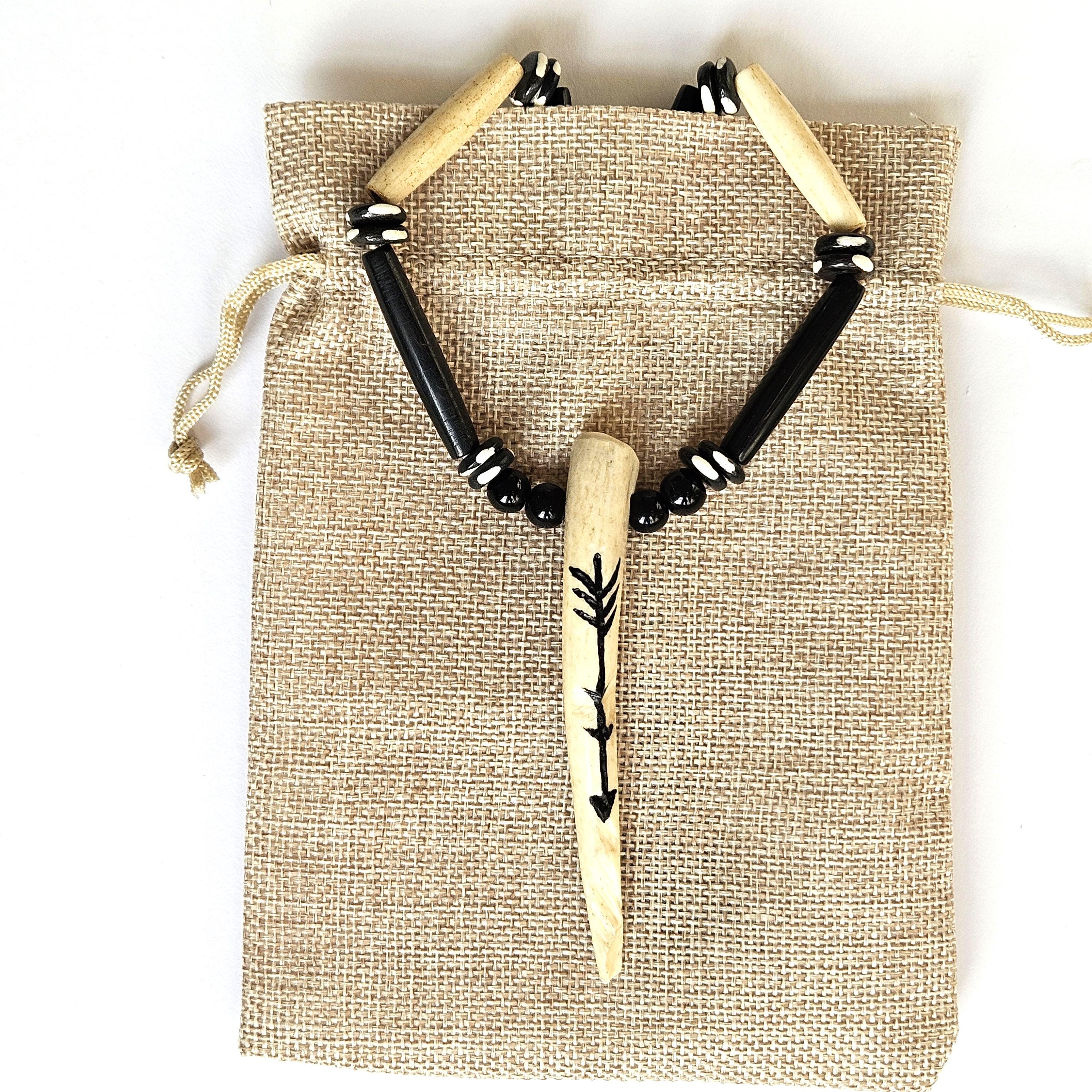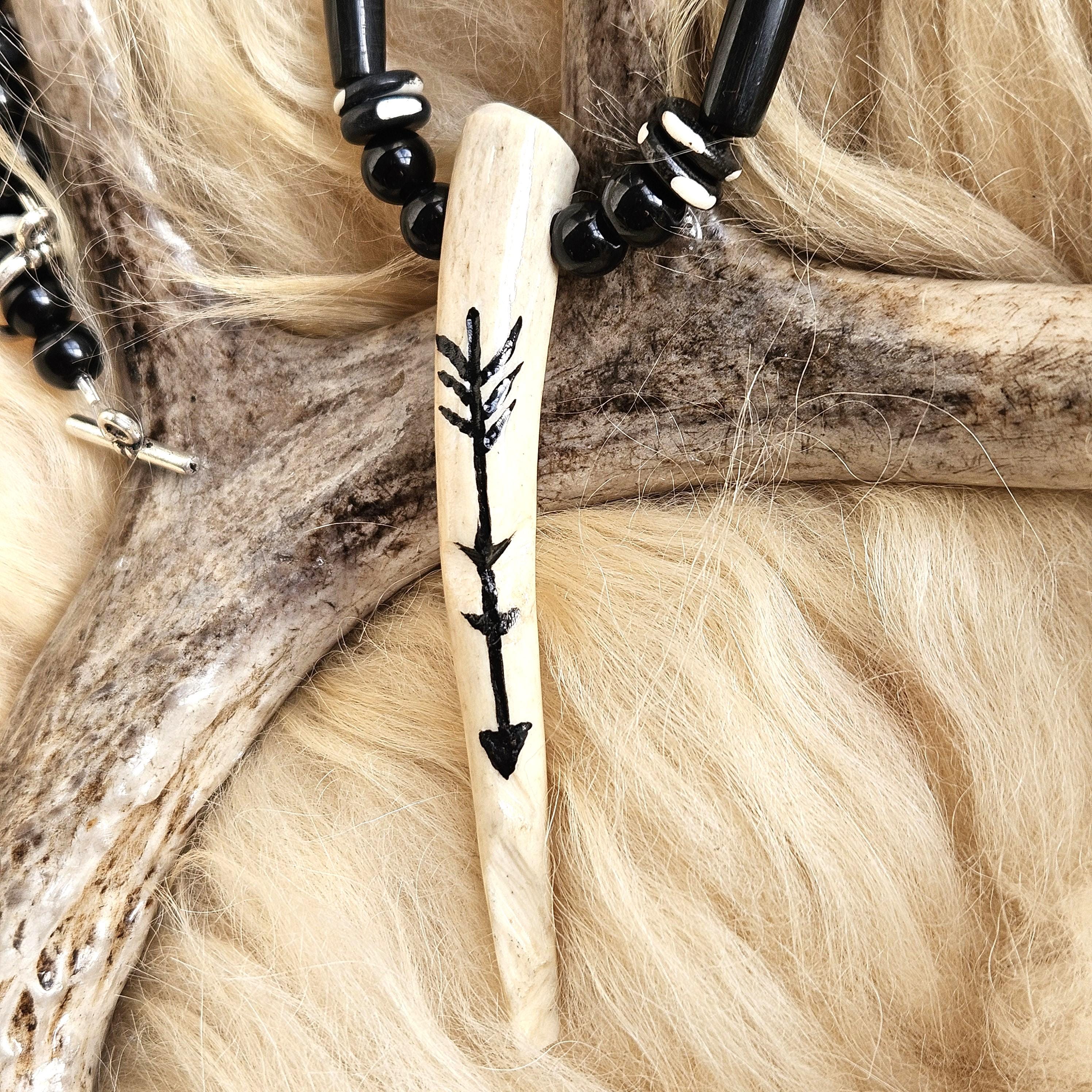 Discover the beauty of this one-of-a-kind Ojibwe deer antler tip necklace accented with bone, horn and glass beads. The antler tip is carved and painted with an arrow. Made with care and attention to detail, this stunning necklace is not just an accessory, but a meaningful connection to tradition and nature. Perfect for adding a touch of authenticity to your style or as a thoughtful gift. Embrace uniqueness and celebrate cultural heritage with wearable art that tells a story!