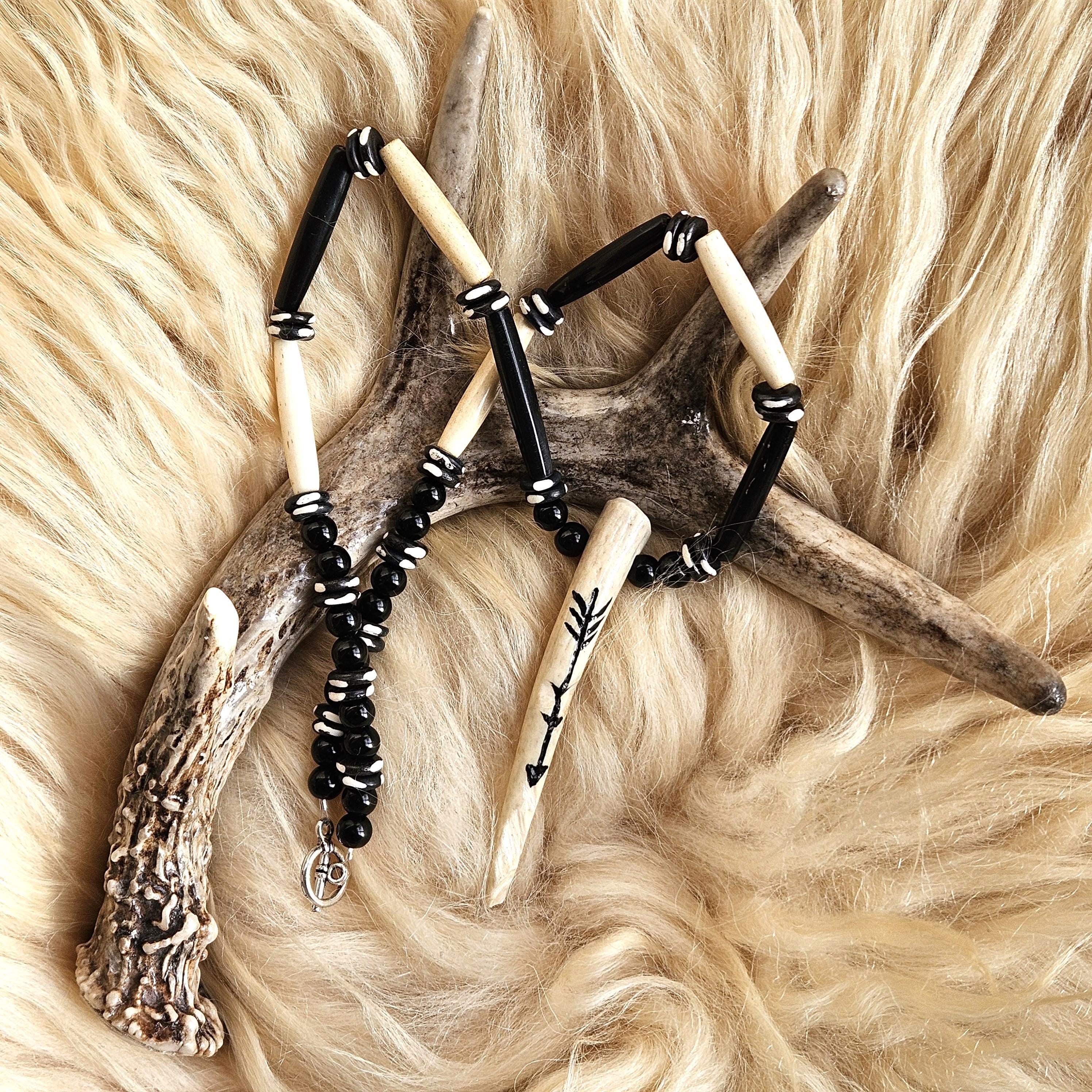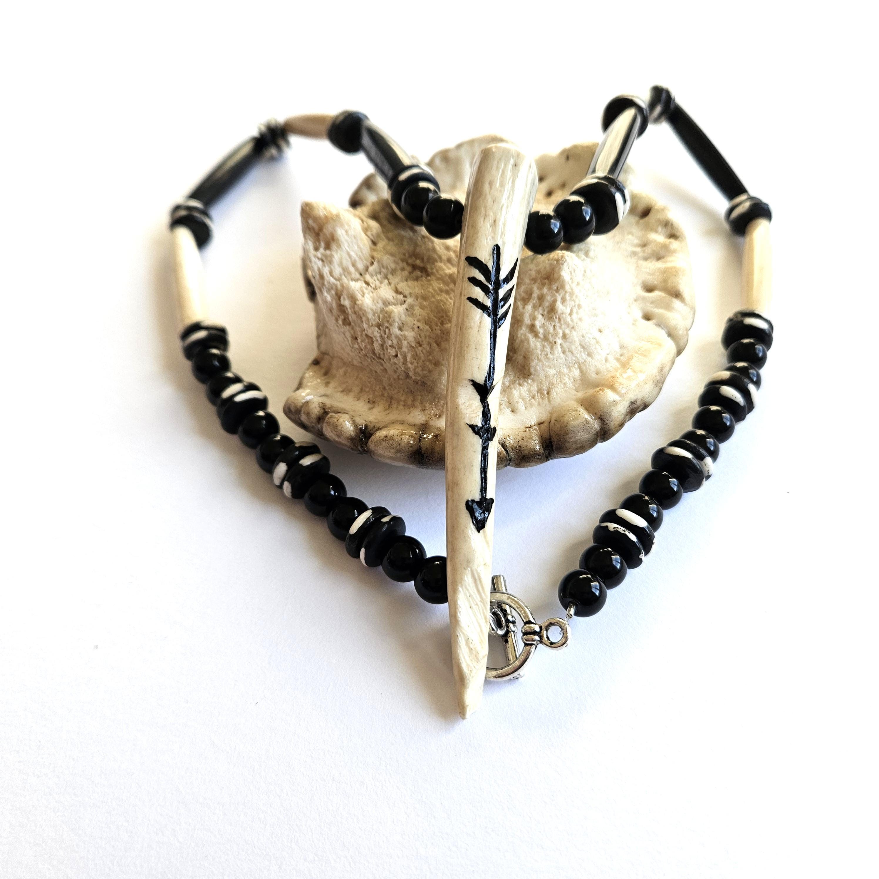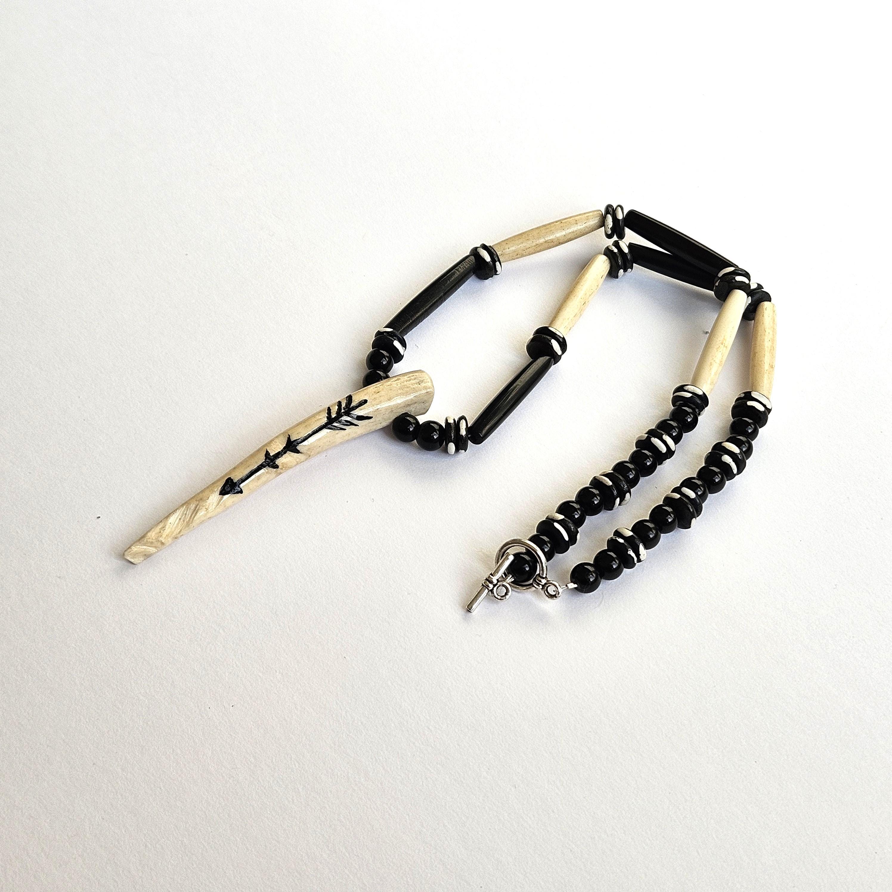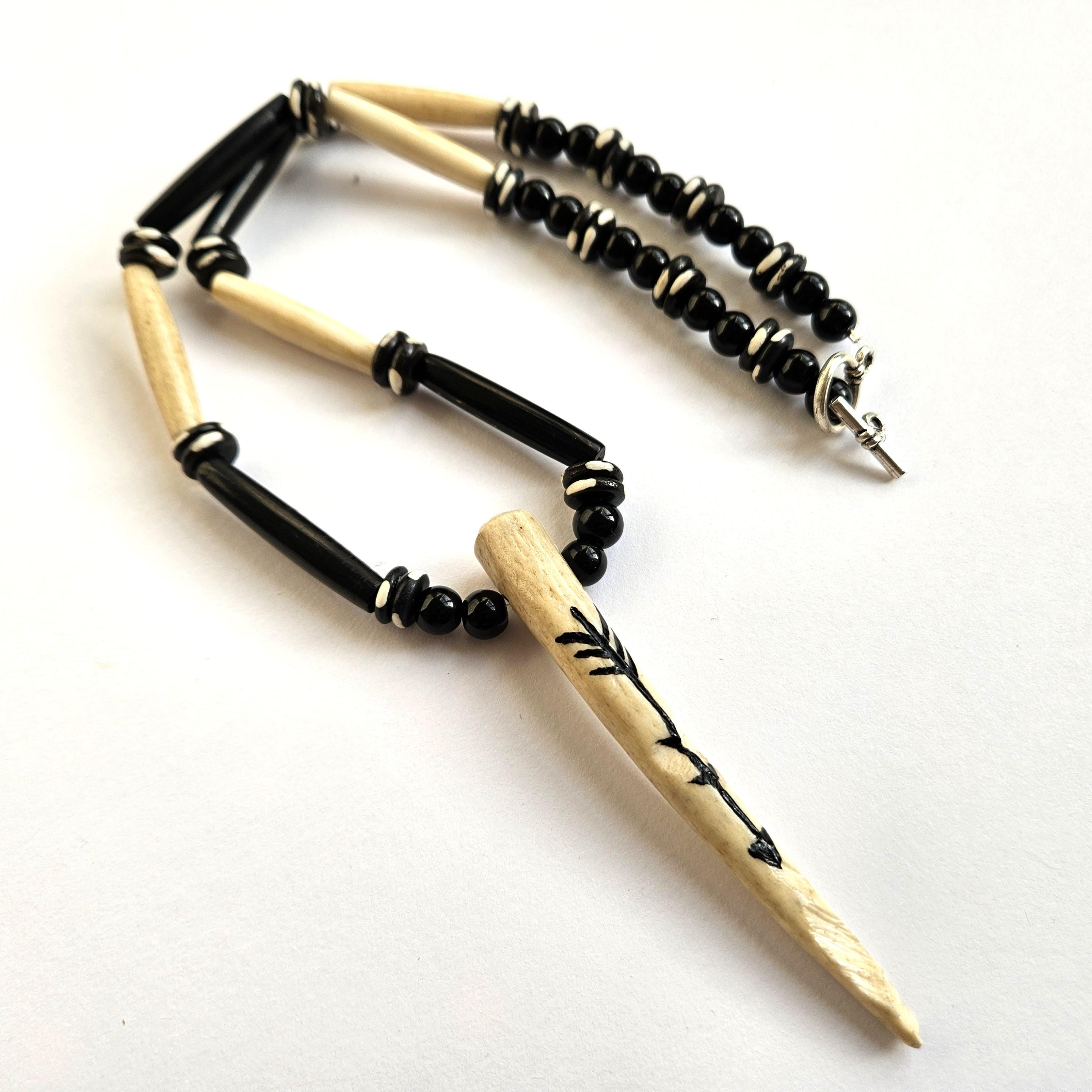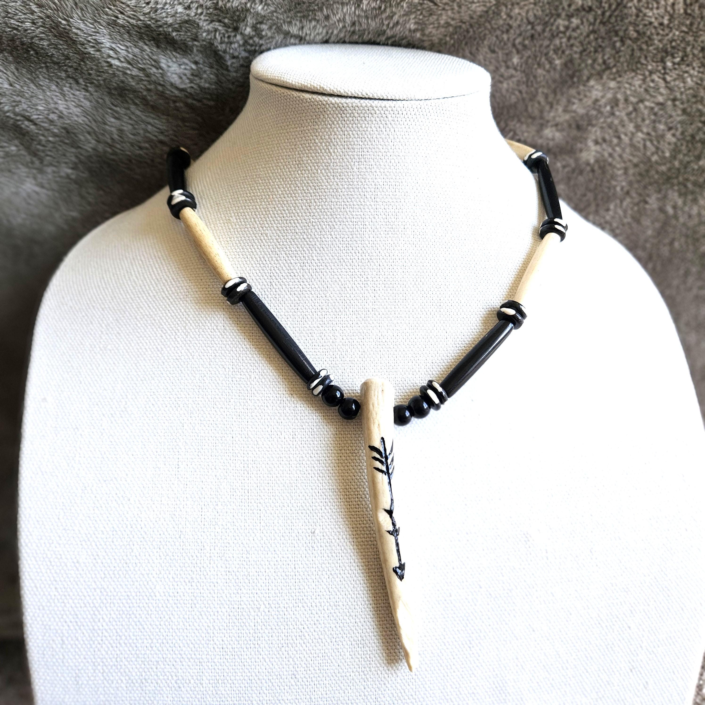 Discover the beauty of this one-of-a-kind Ojibwe deer antler tip necklace accented with bone, horn and glass beads. The antler tip is carved and painted with an arrow. Made with care and attention to detail, this stunning necklace is not just an accessory, but a meaningful connection to tradition and nature. Perfect for adding a touch of authenticity to your style or as a thoughtful gift. Embrace uniqueness and celebrate cultural heritage with wearable art that tells a story!