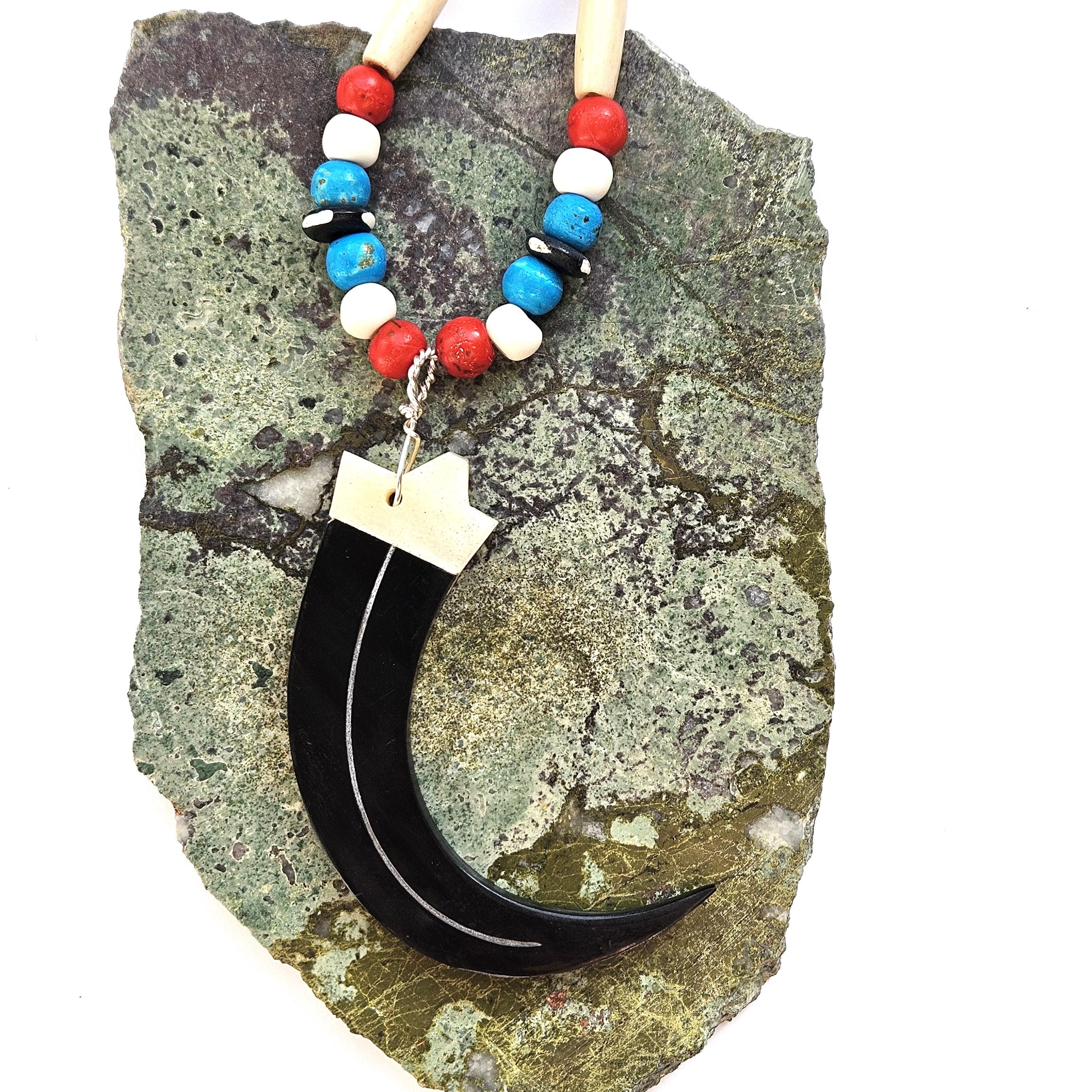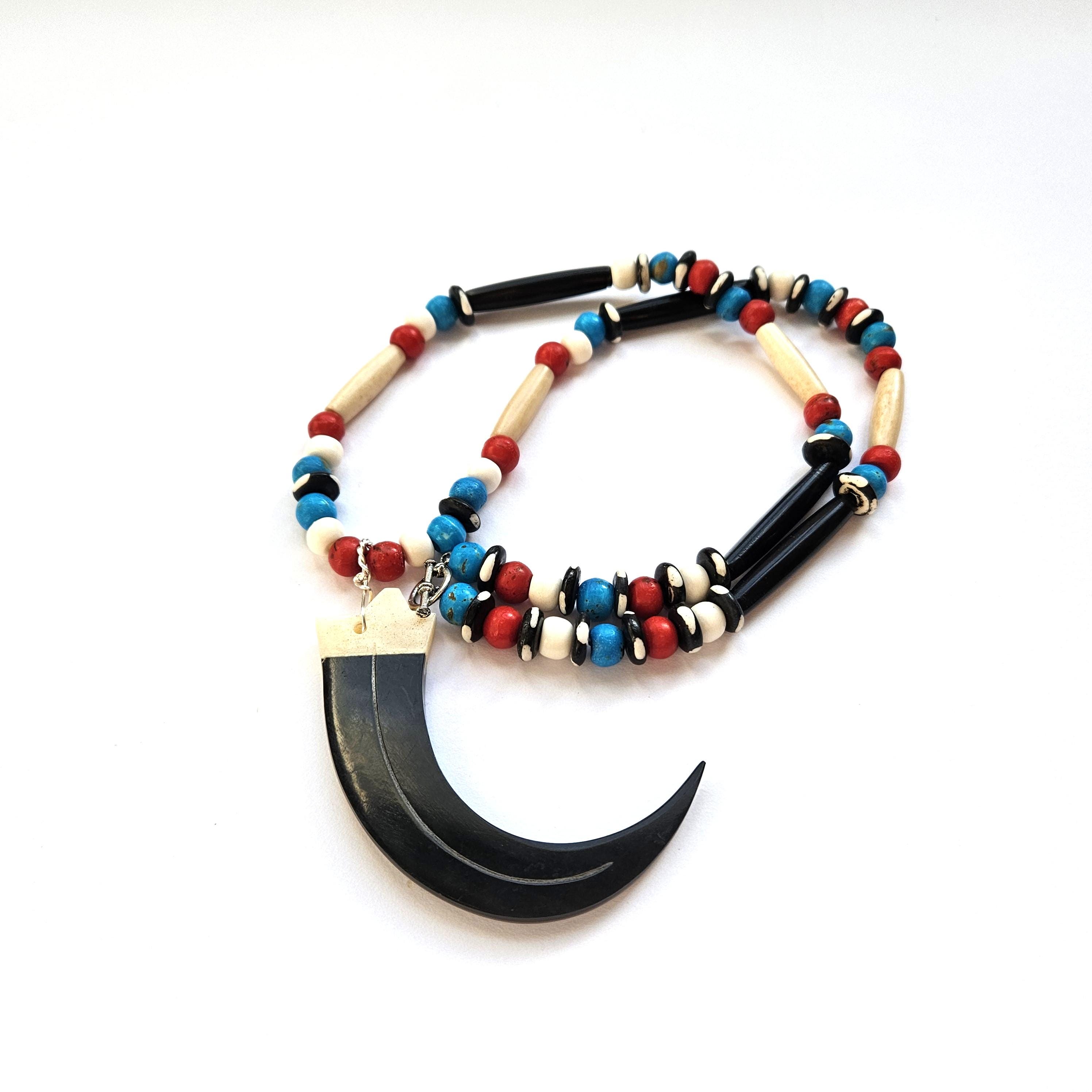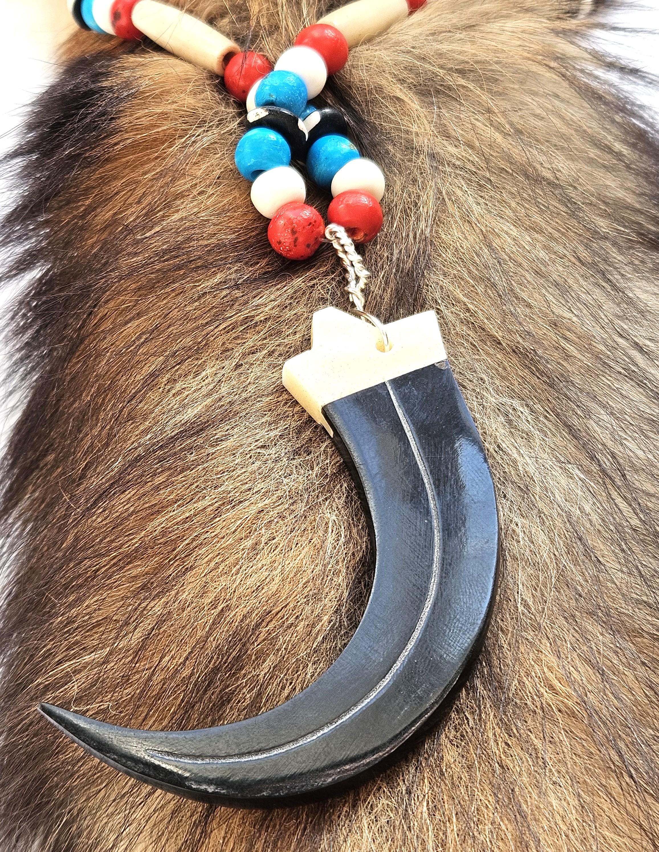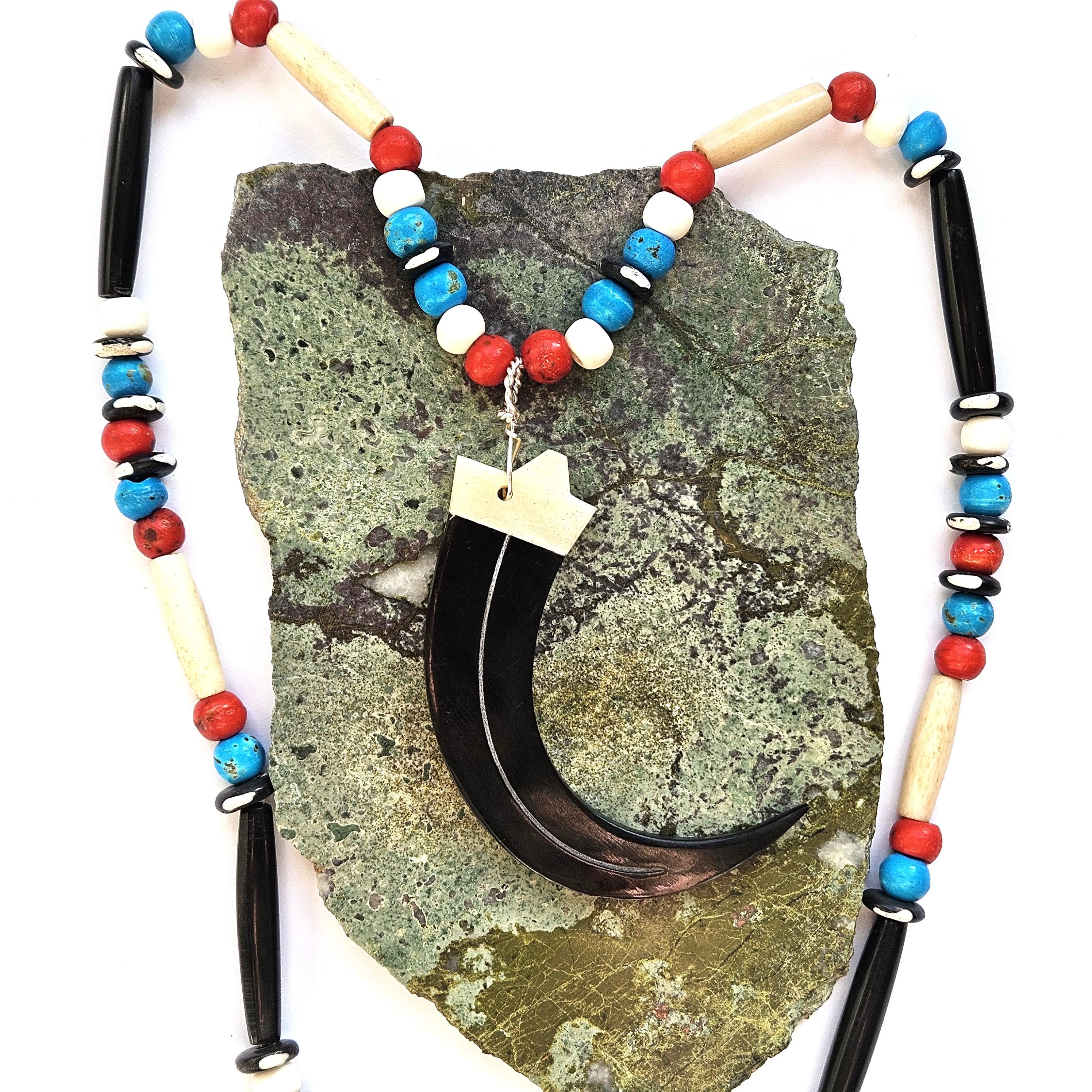 Discover the beauty of this one-of-a-kind Ojibwe bone claw pendant necklace accented with hairpin bone beads, round painted bone beads, and bone saucer beads. Made with care and attention to detail, this stunning necklace is not just an accessory, but a meaningful connection to tradition and nature. Perfect for adding a touch of authenticity to your style or as a thoughtful gift. Embrace uniqueness and celebrate cultural heritage with wearable art that tells a story!