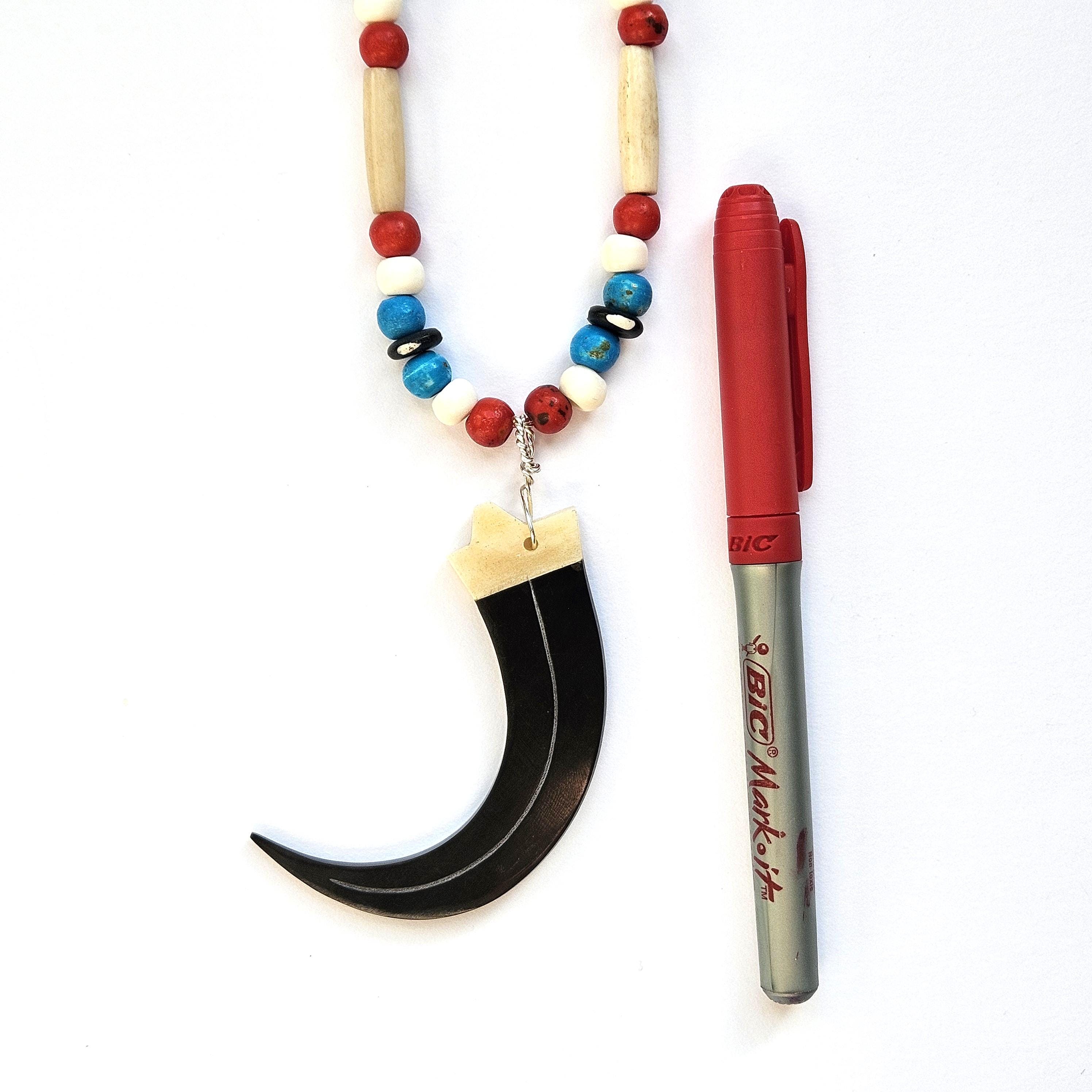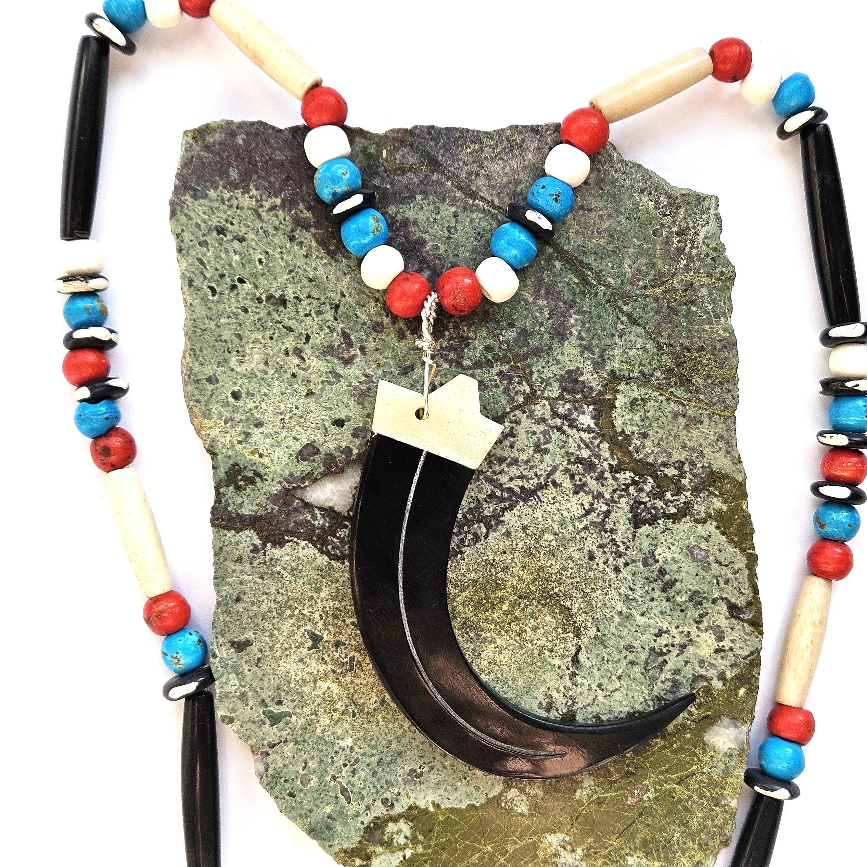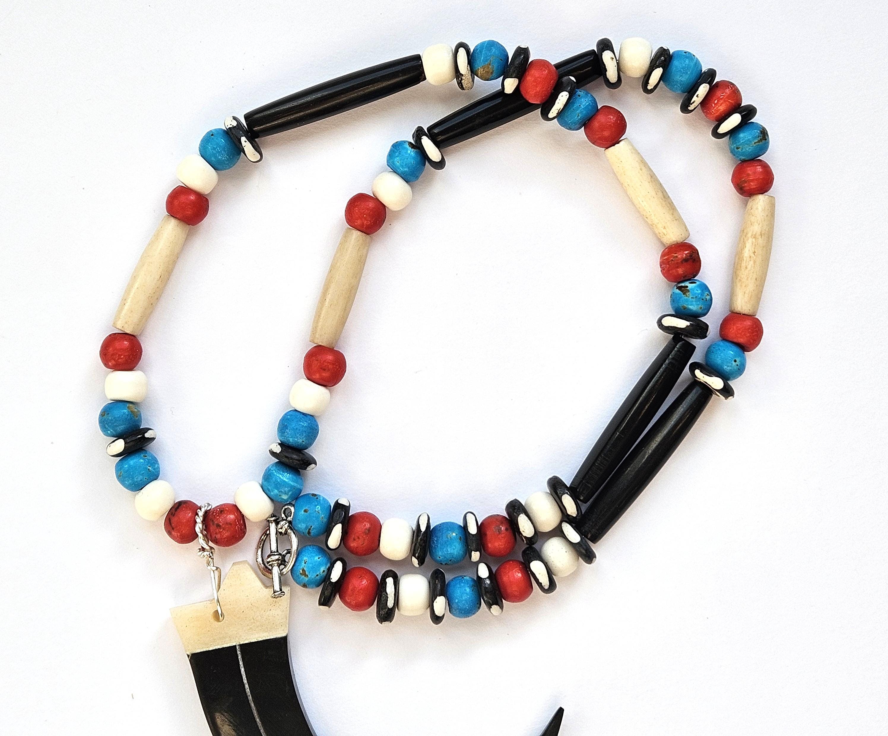 Discover the beauty of this one-of-a-kind Ojibwe bone claw pendant necklace accented with hairpin bone beads, round painted bone beads, and bone saucer beads. Made with care and attention to detail, this stunning necklace is not just an accessory, but a meaningful connection to tradition and nature. Perfect for adding a touch of authenticity to your style or as a thoughtful gift. Embrace uniqueness and celebrate cultural heritage with wearable art that tells a story!