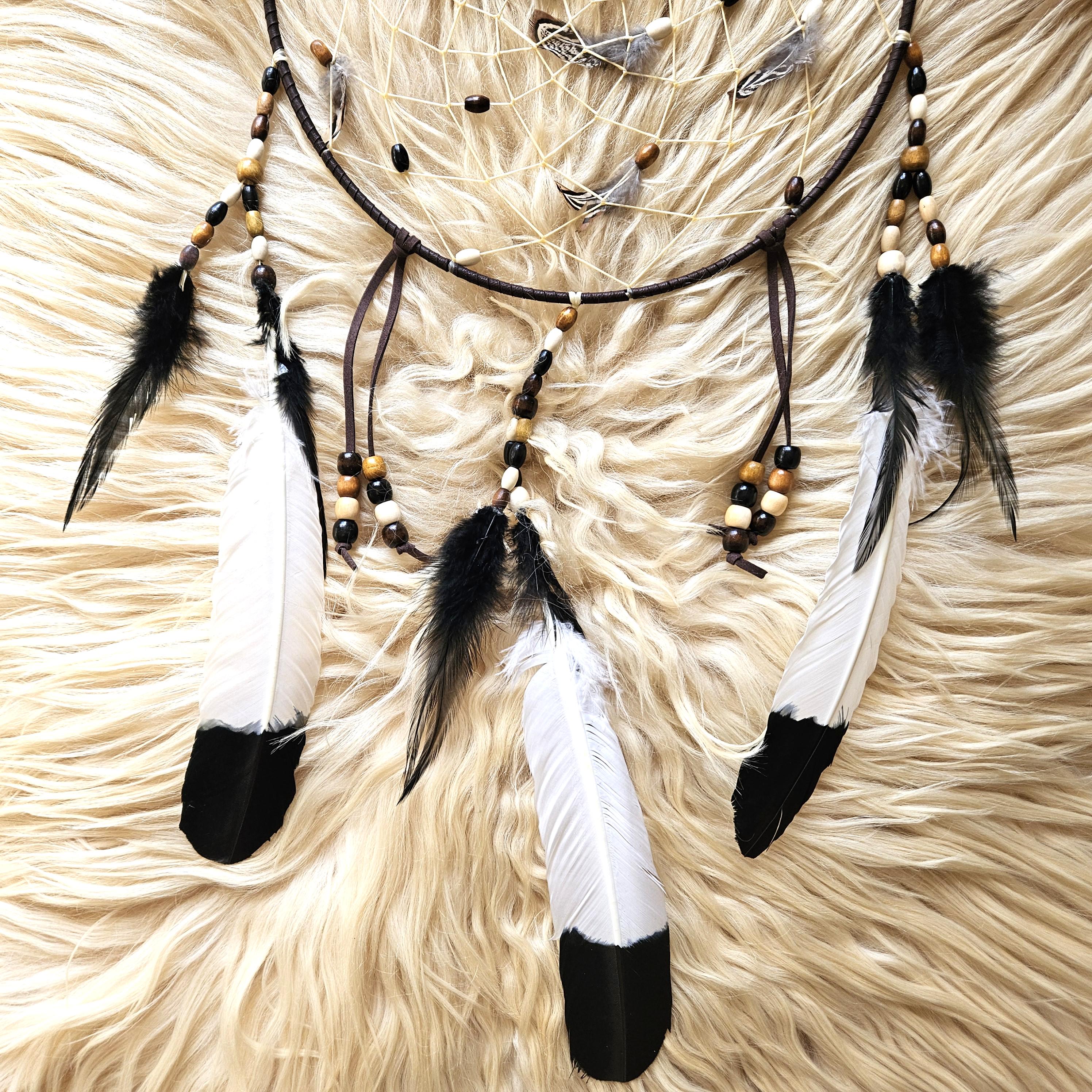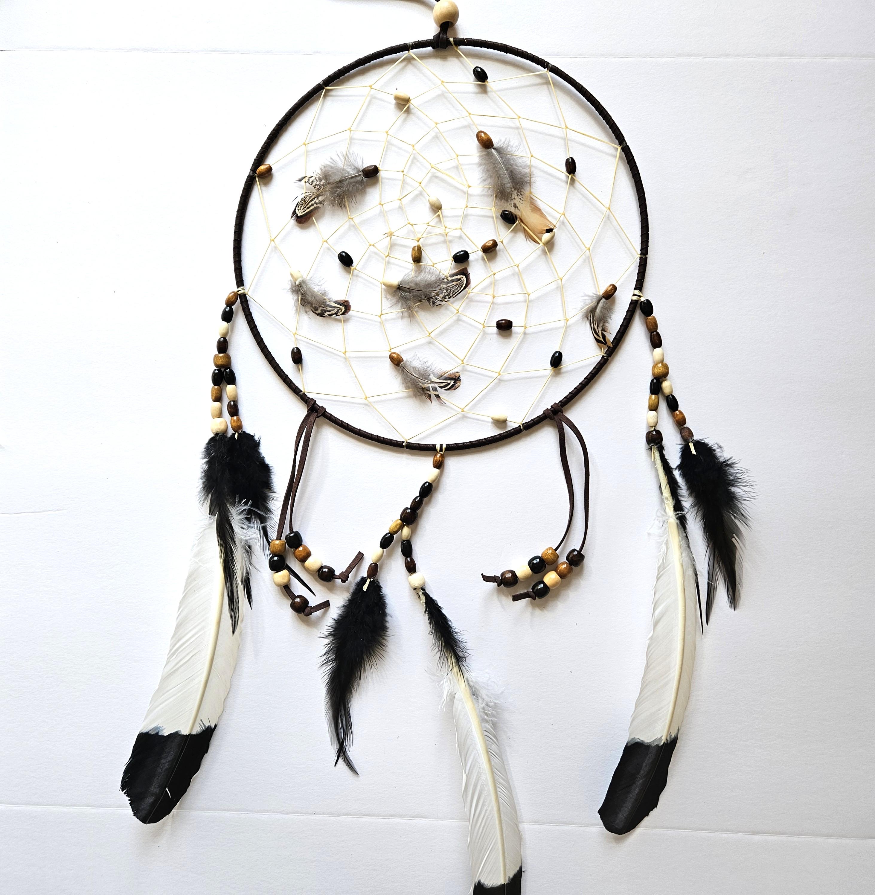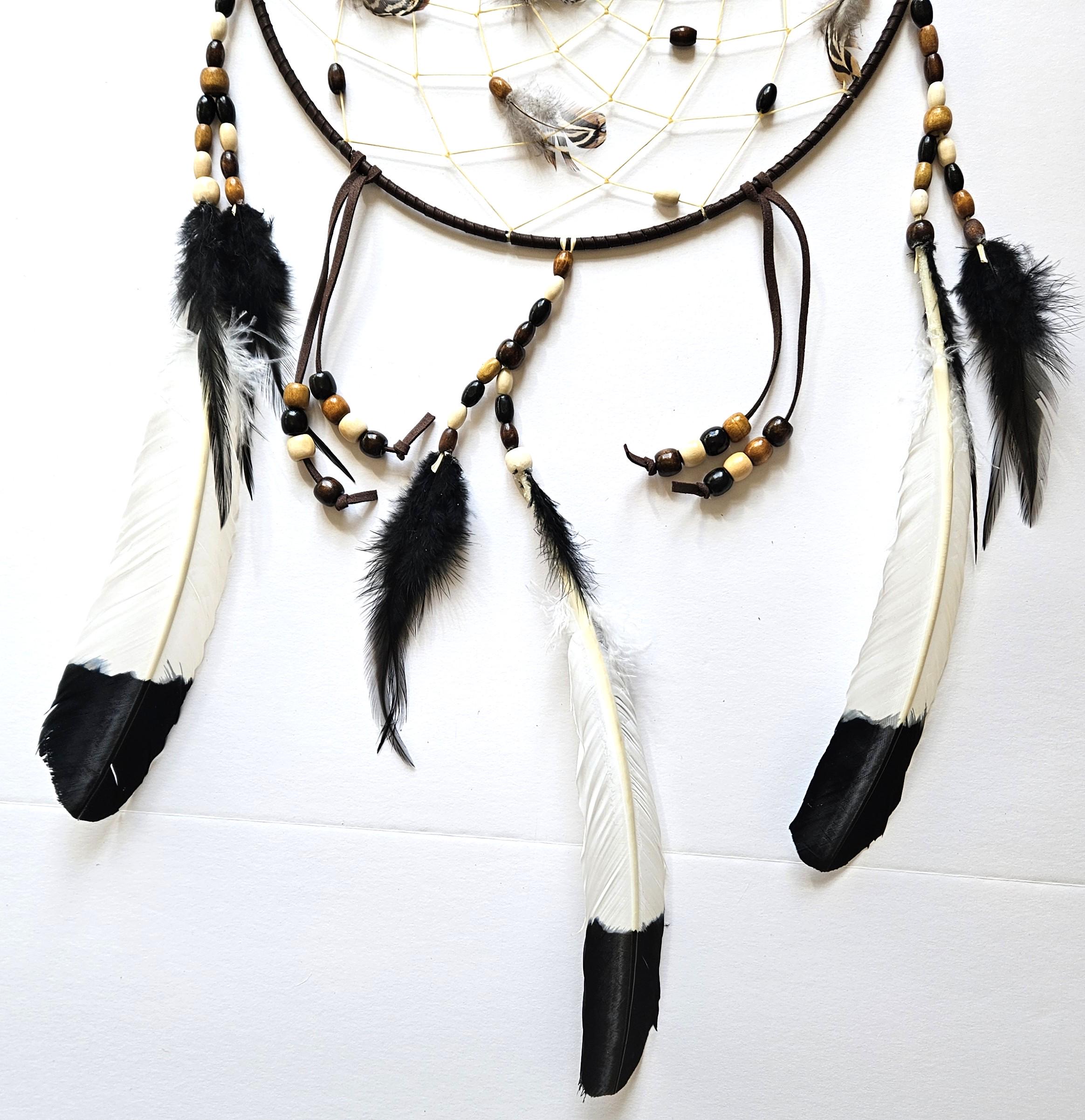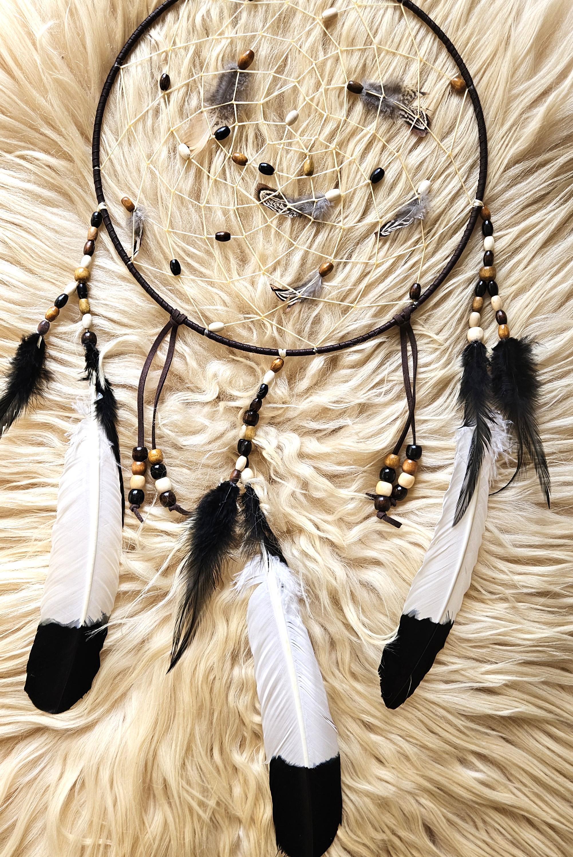 Celebrate the richness of Native American heritage with this Handcrafted Ojibwe Dreamcatcher. This unique creation showcases beautiful imitation eagle feathers (died goose feathers) and a sturdy chocolate leather hoop, with each part carefully chosen for its cultural importance. In Native American tradition, the Deer symbolizes grace, gratitude, agility, and abundance. Ideal for gifting or enhancing your personal space, this captivating dreamcatcher serves as a remarkable statement piece that respects both tradition and craftsmanship. Place it above your bed to ward off nightmares and welcome serene thoughts. Allow this exquisite dreamcatcher to infuse your environment with harmony and spirit!