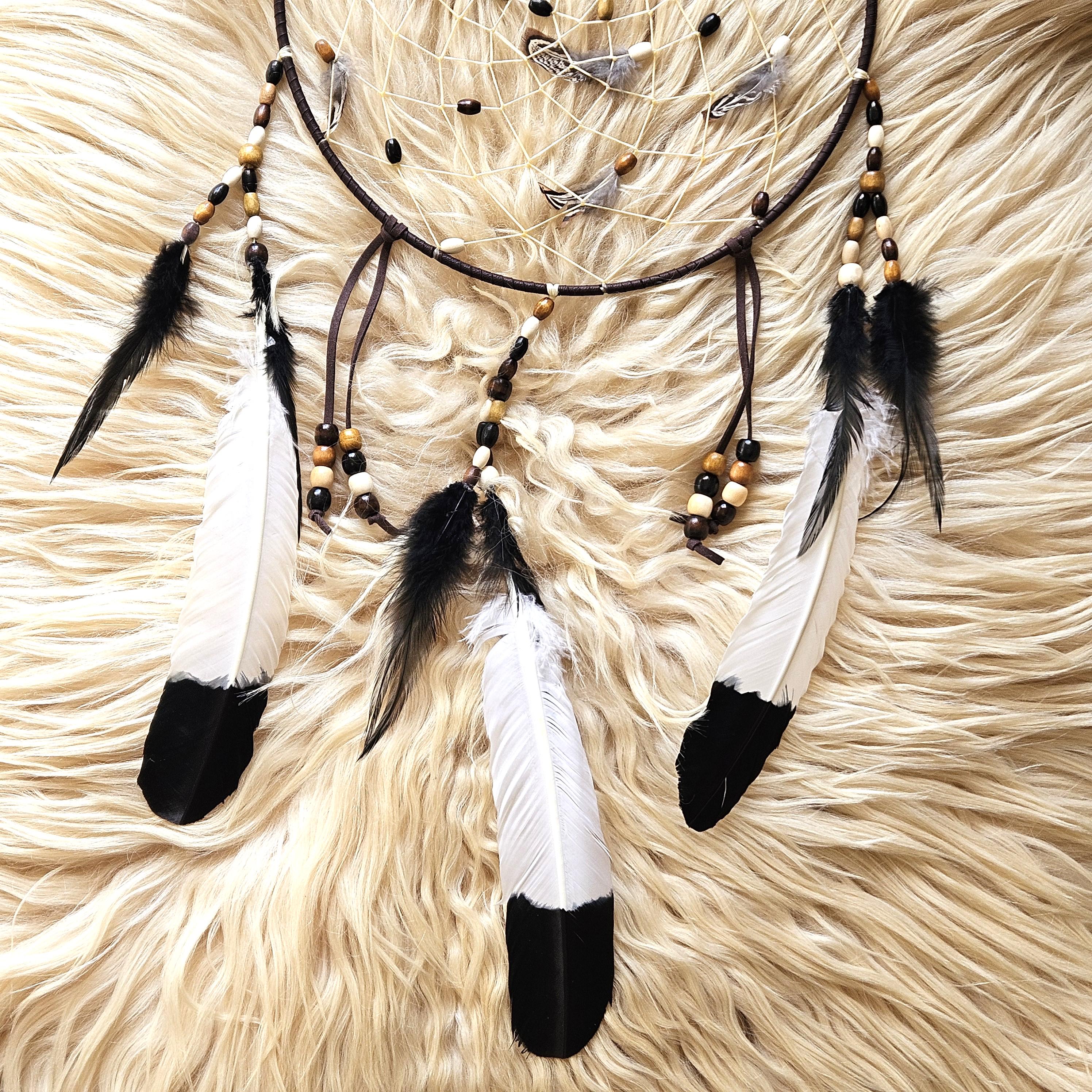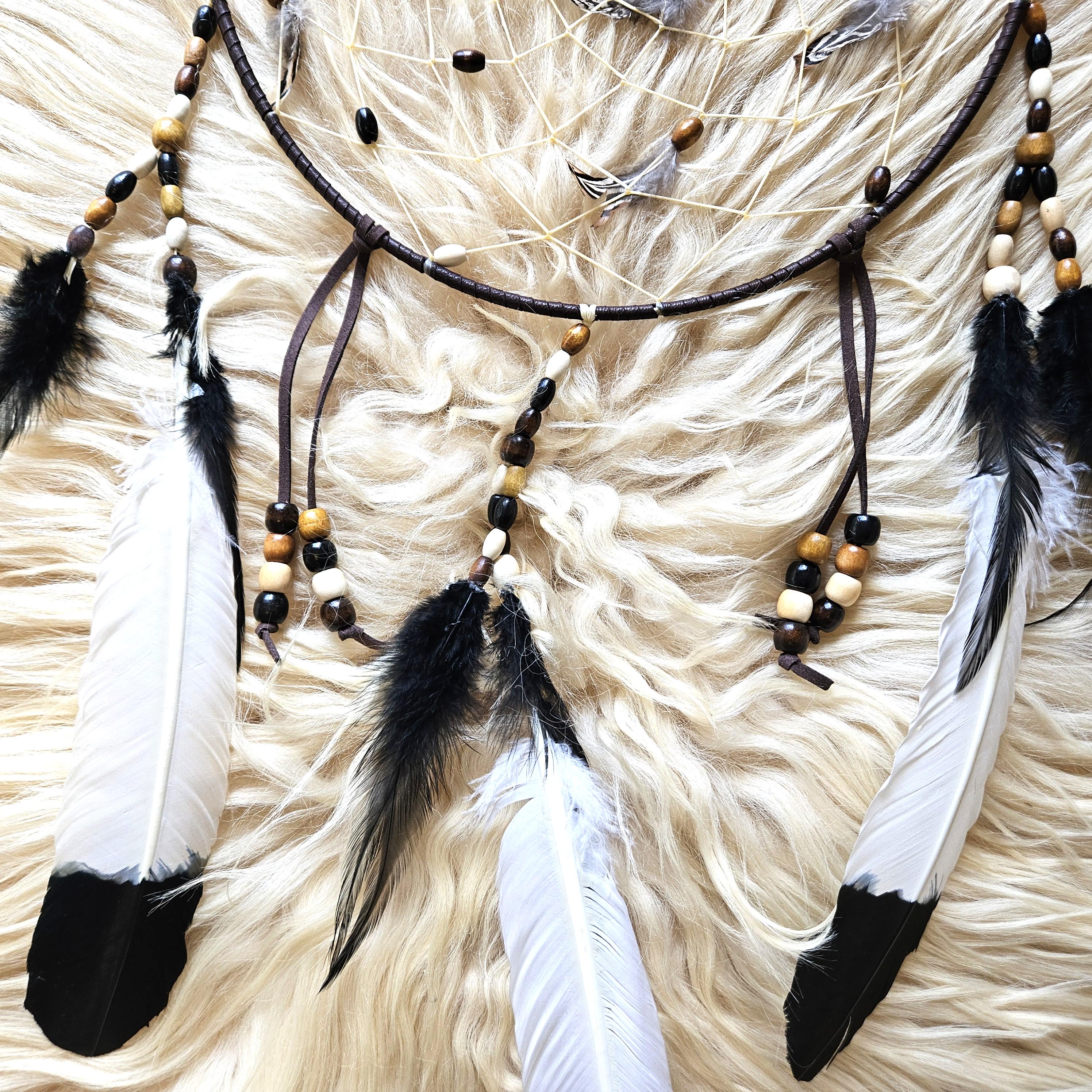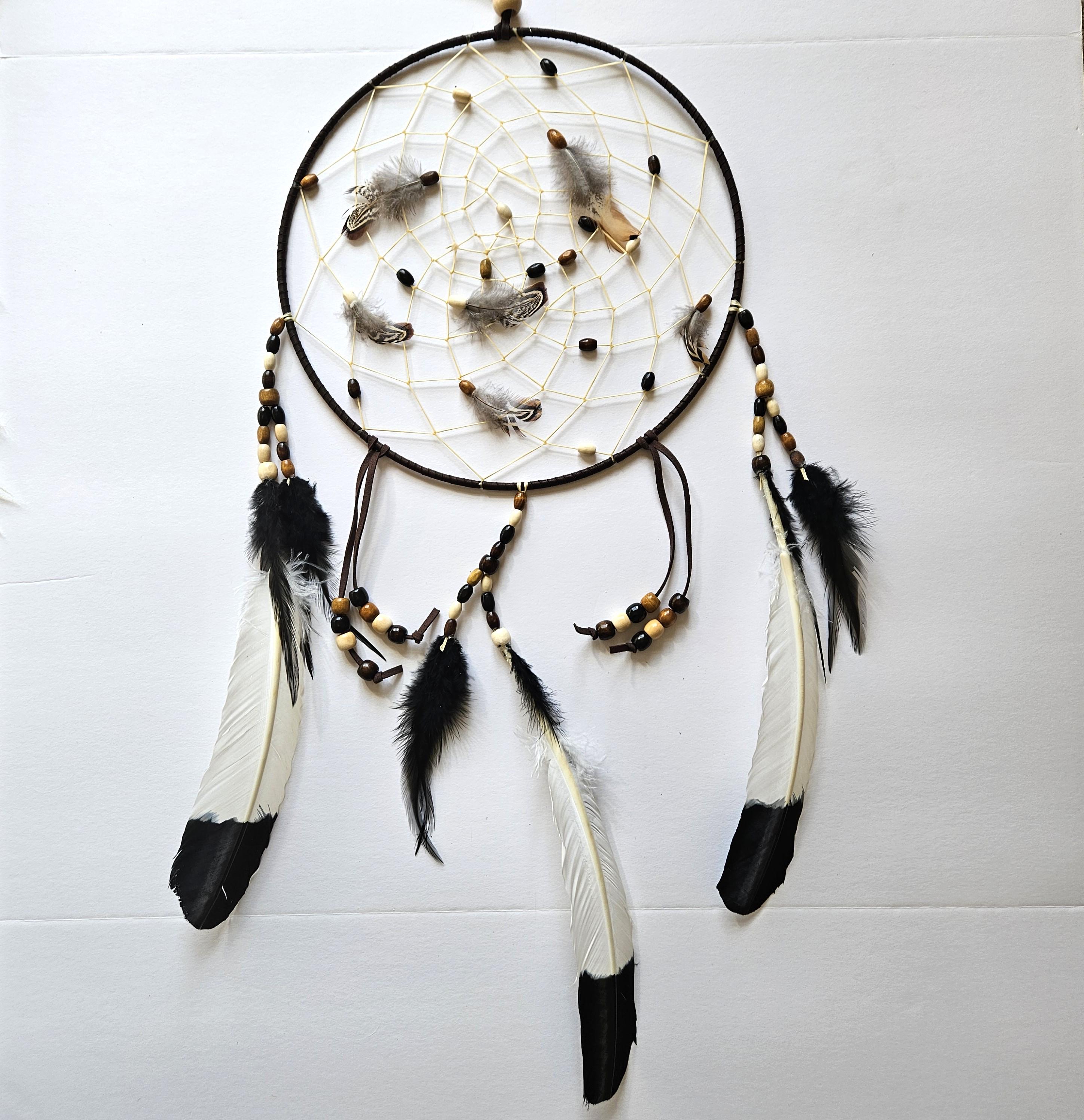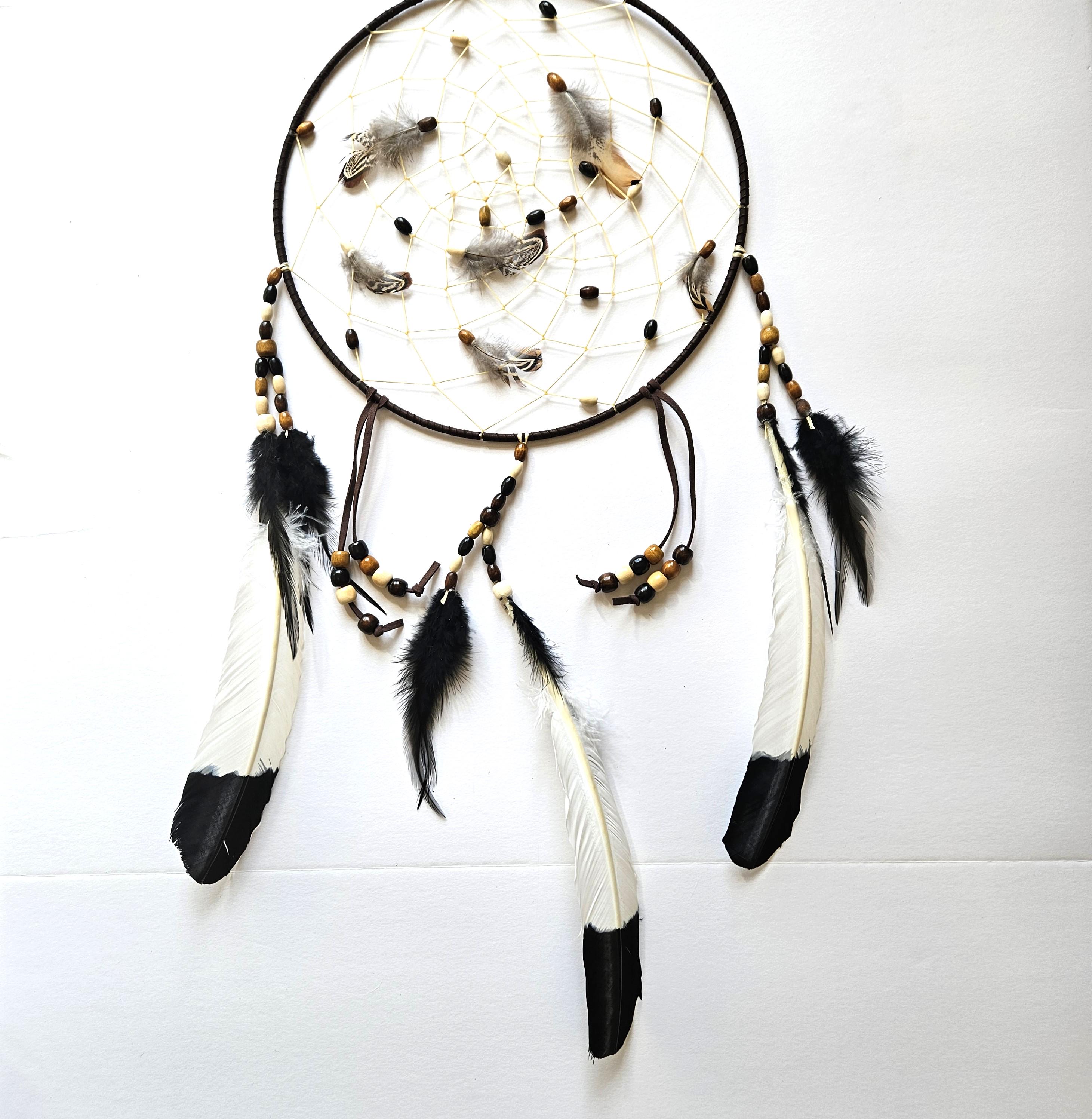 Celebrate the richness of Native American heritage with this Handcrafted Ojibwe Dreamcatcher. This unique creation showcases beautiful imitation eagle feathers (died goose feathers) and a sturdy chocolate leather hoop, with each part carefully chosen for its cultural importance. In Native American tradition, the Deer symbolizes grace, gratitude, agility, and abundance. Ideal for gifting or enhancing your personal space, this captivating dreamcatcher serves as a remarkable statement piece that respects both tradition and craftsmanship. Place it above your bed to ward off nightmares and welcome serene thoughts. Allow this exquisite dreamcatcher to infuse your environment with harmony and spirit!
